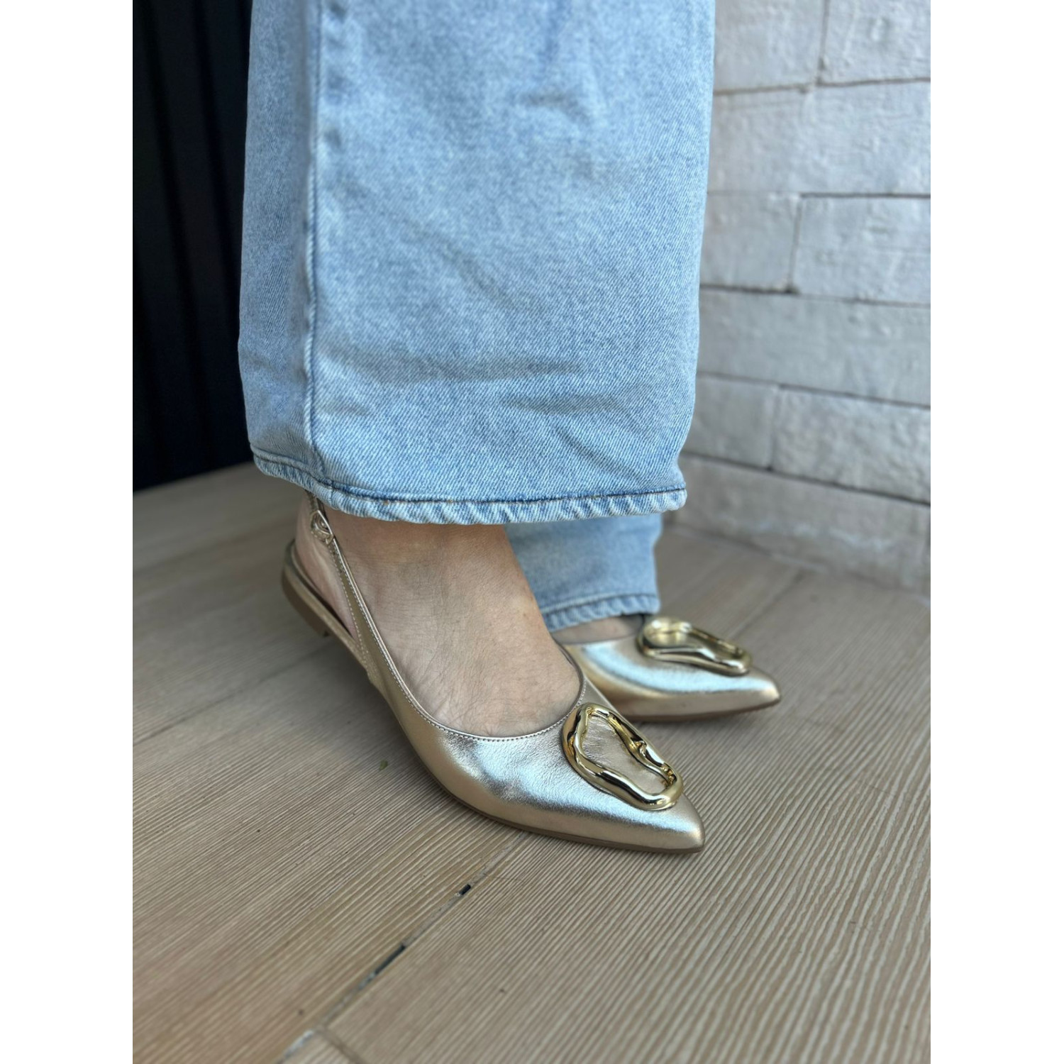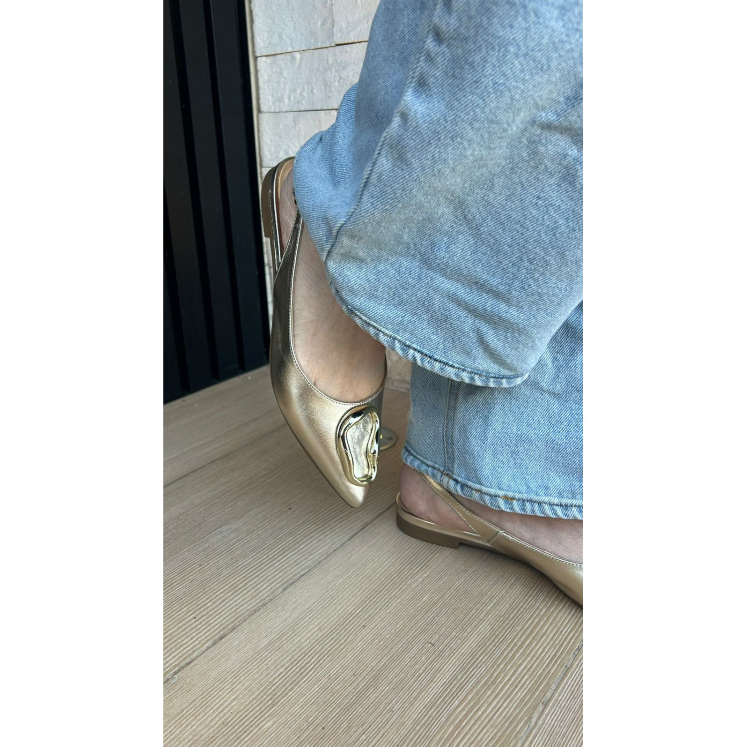 Slingback Metalizada Dourada, Chapa Oval Orgânica Fixa Em Cima, Saltinho Baixo.