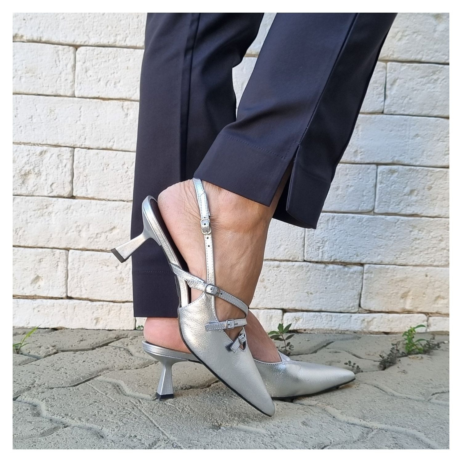 Slingback em Couro Prata Metalizado com Salto e Bico Fino Três Tiras em Cima Com Fivelas.