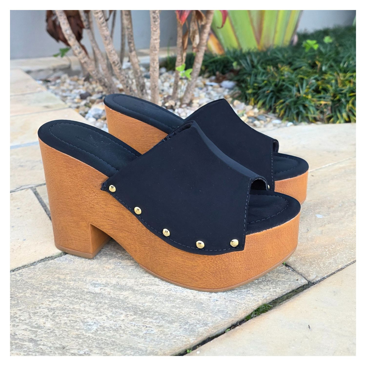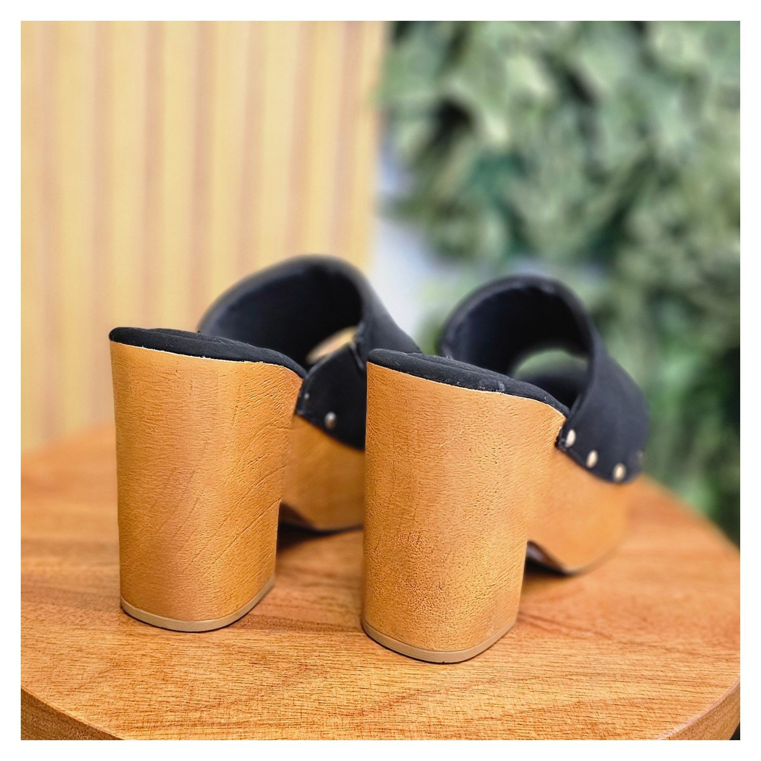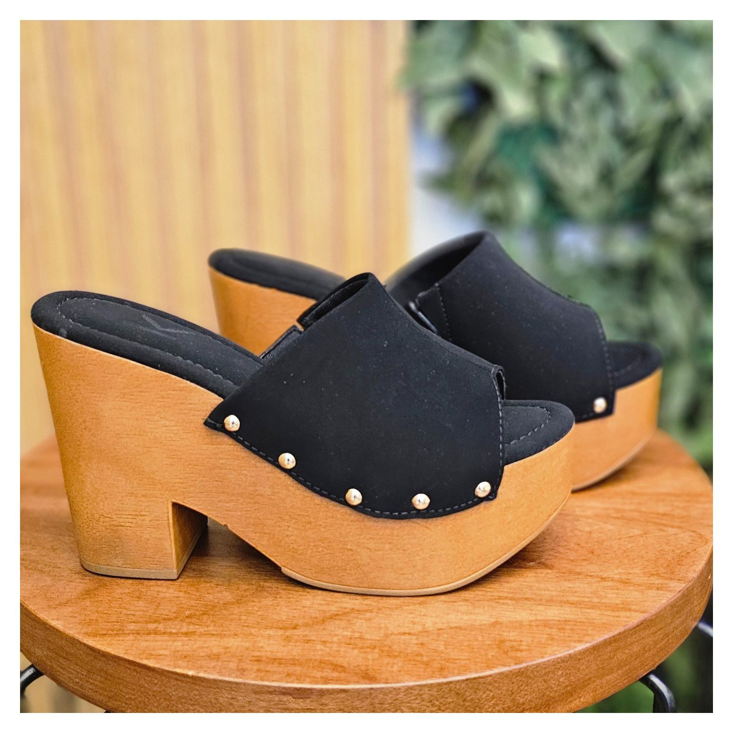 Tamanco Salto Alto Plataforma De Madeira, Cabedal Largo Nobuck Preto, Borda Esferas Douradas.