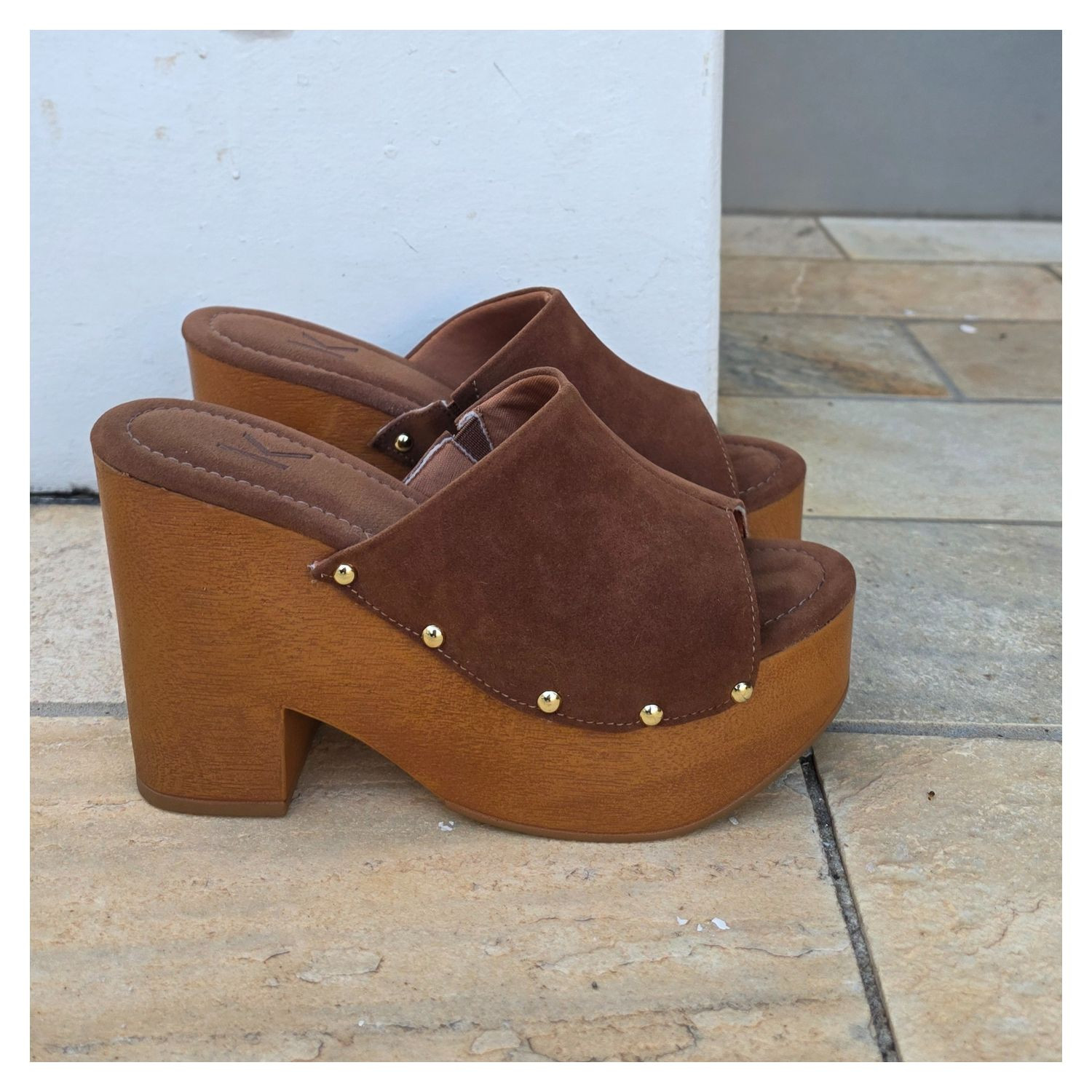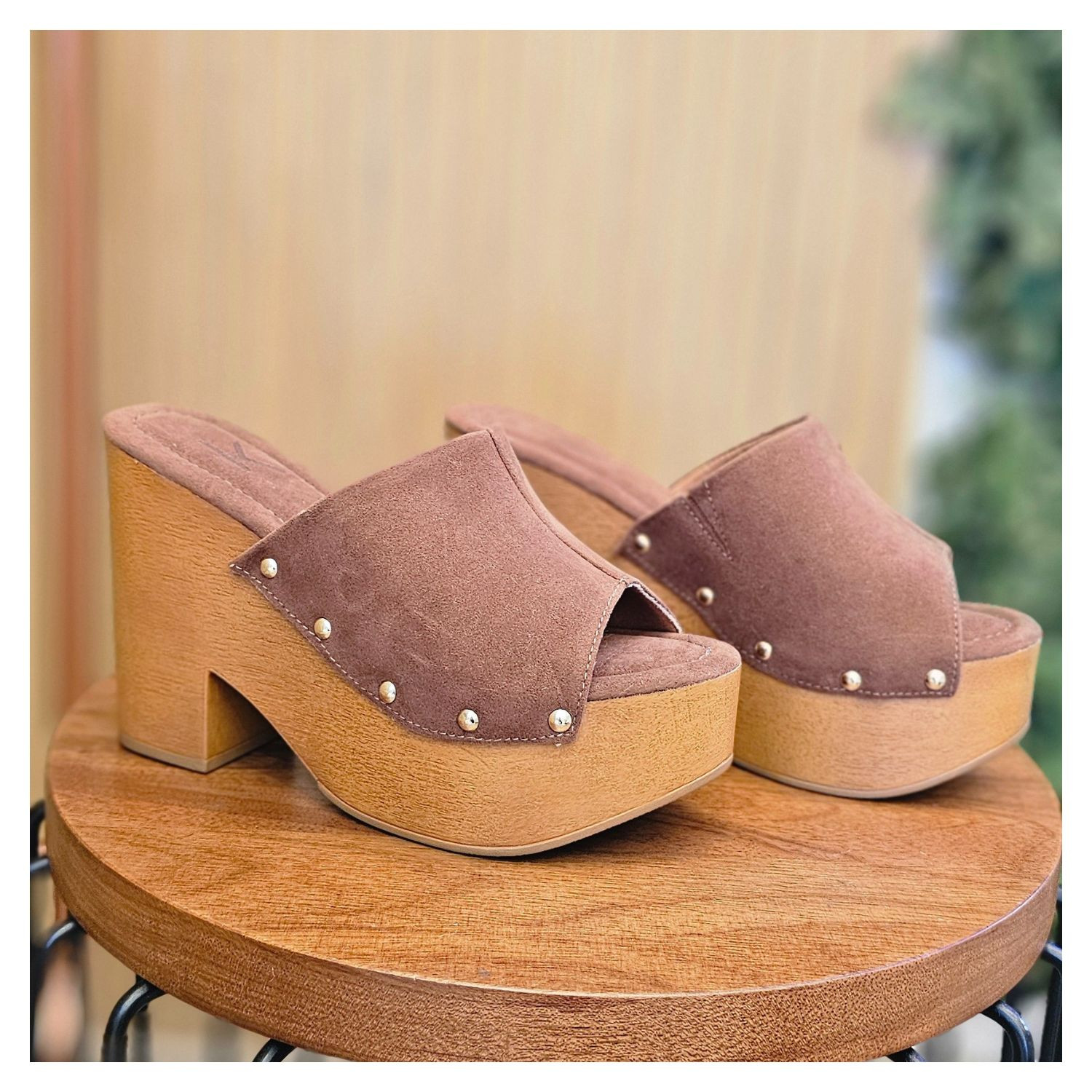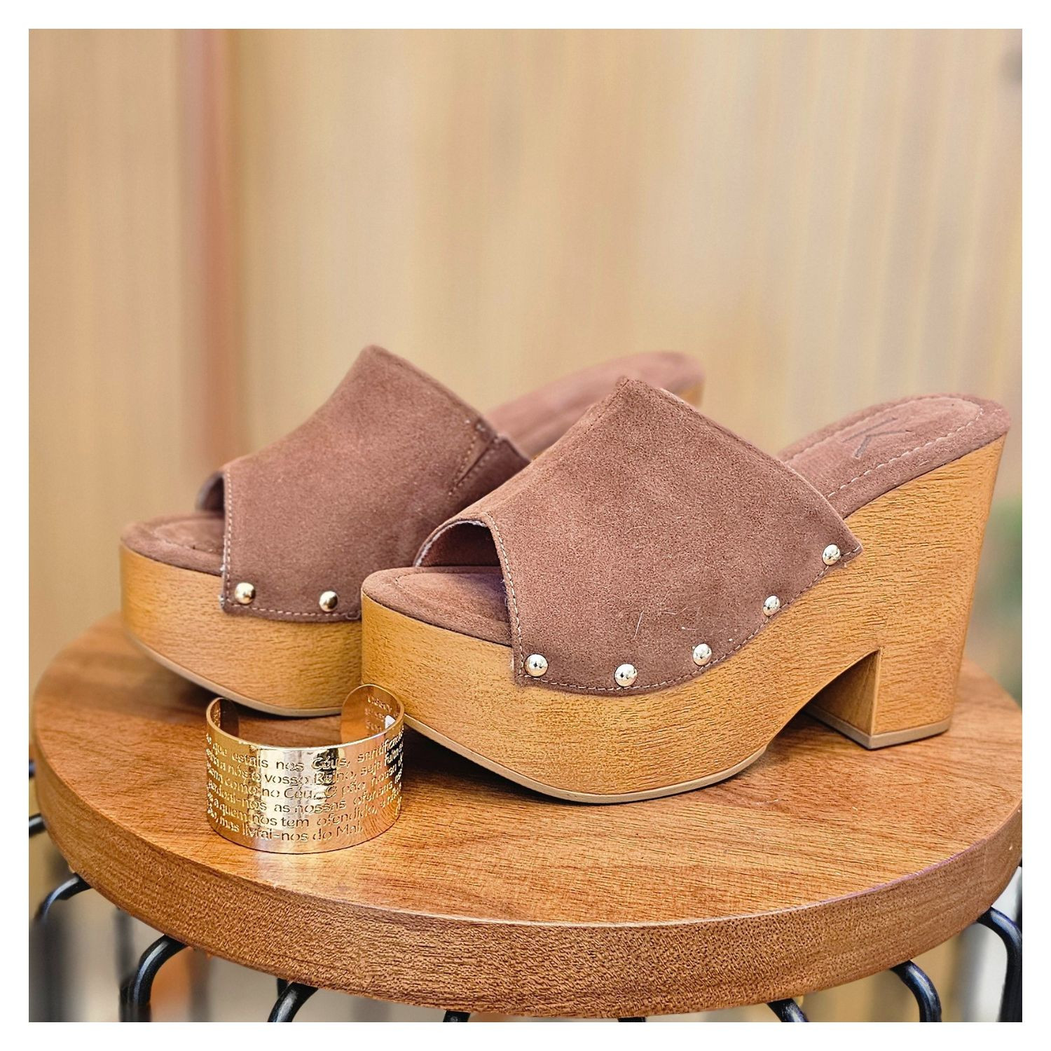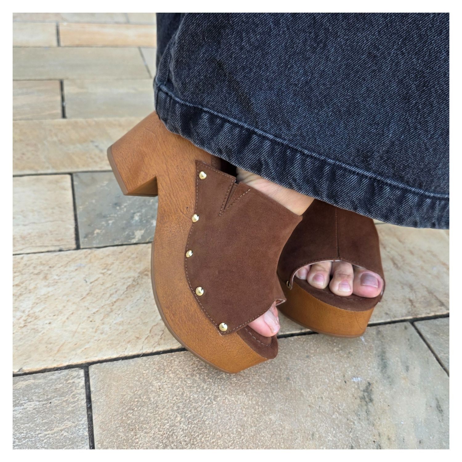 Tamanco Salto Alto Plataforma De Madeira, Cabedal Largo Nobuck Marrom, Borda Esferas Douradas.