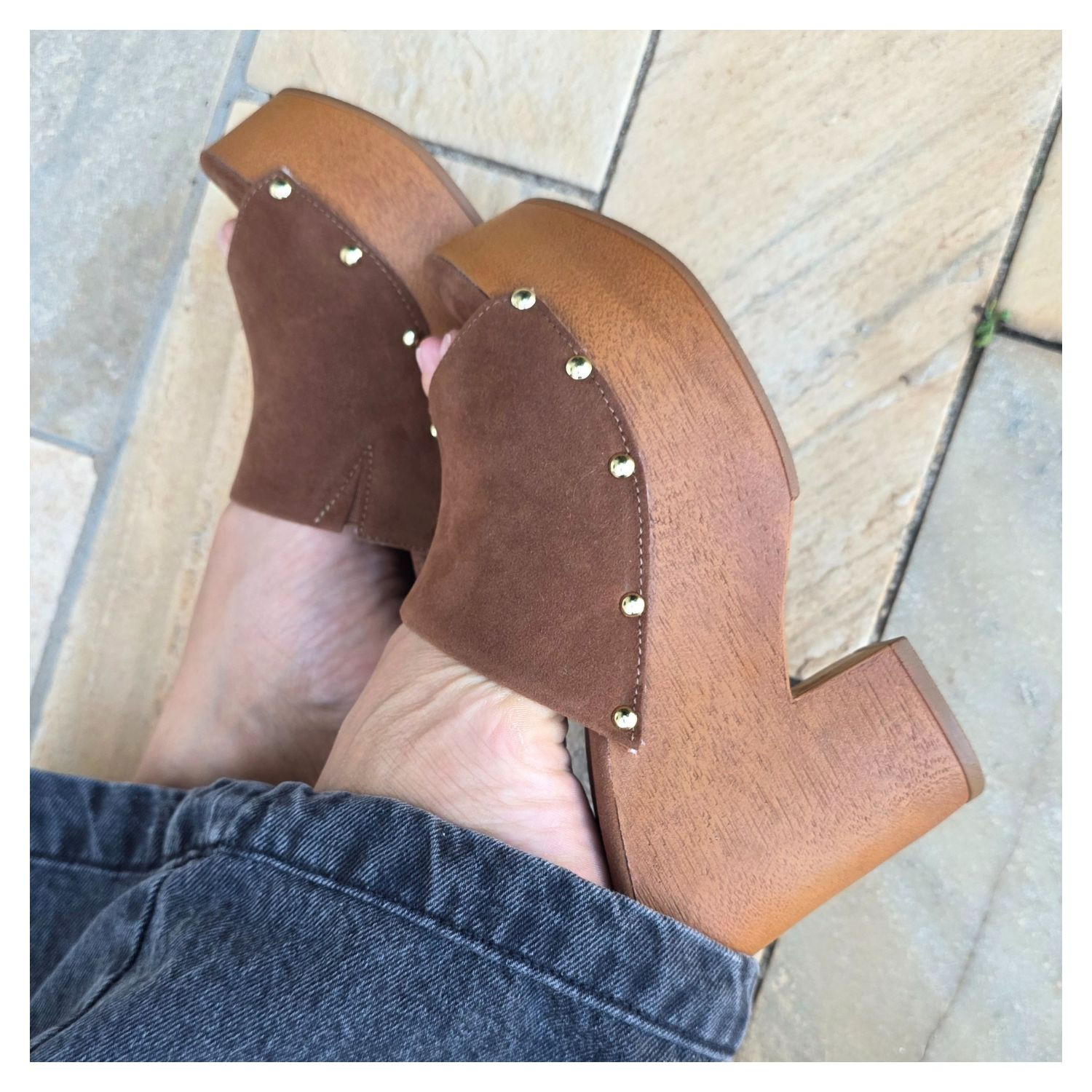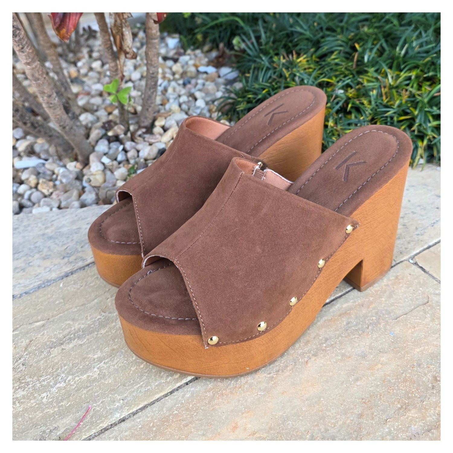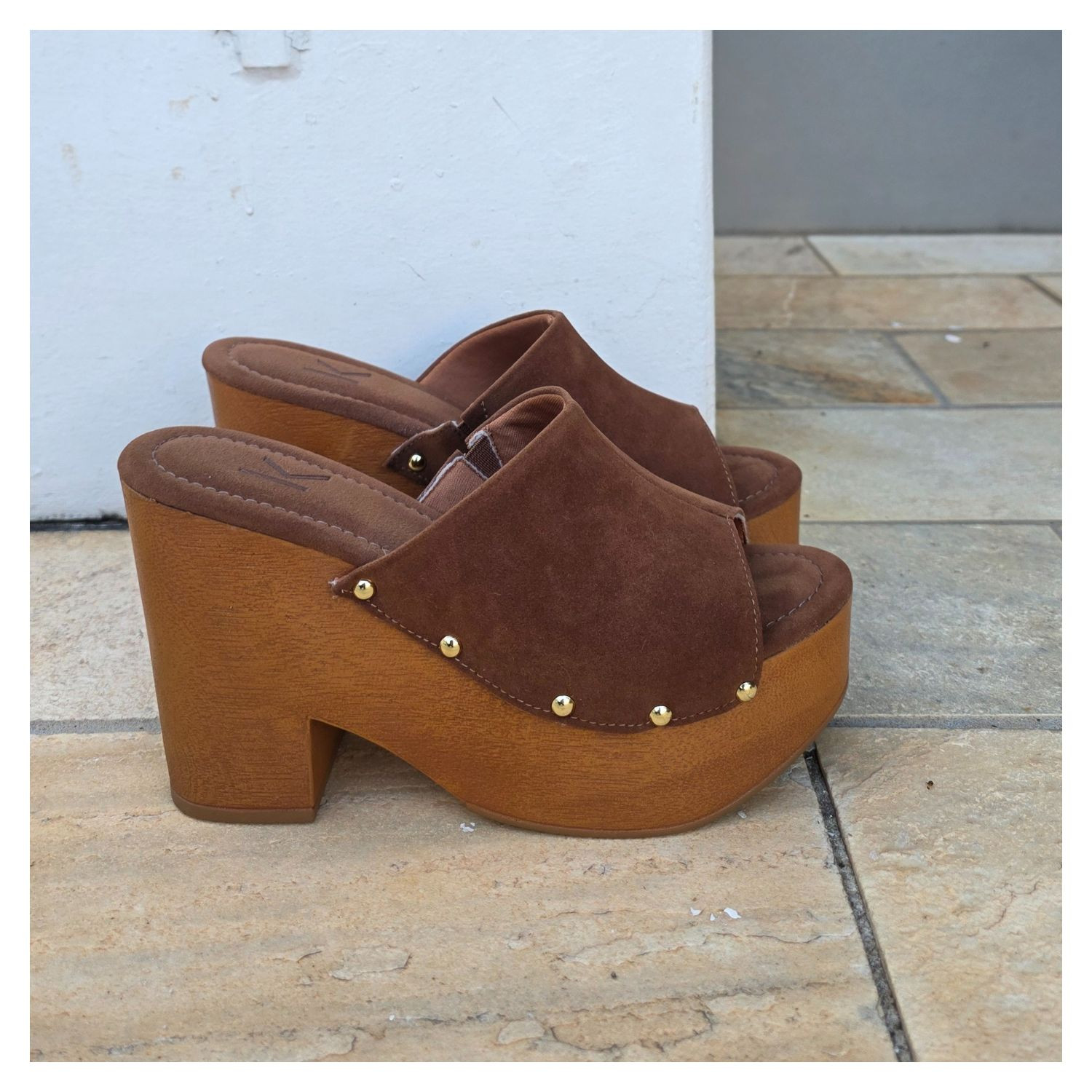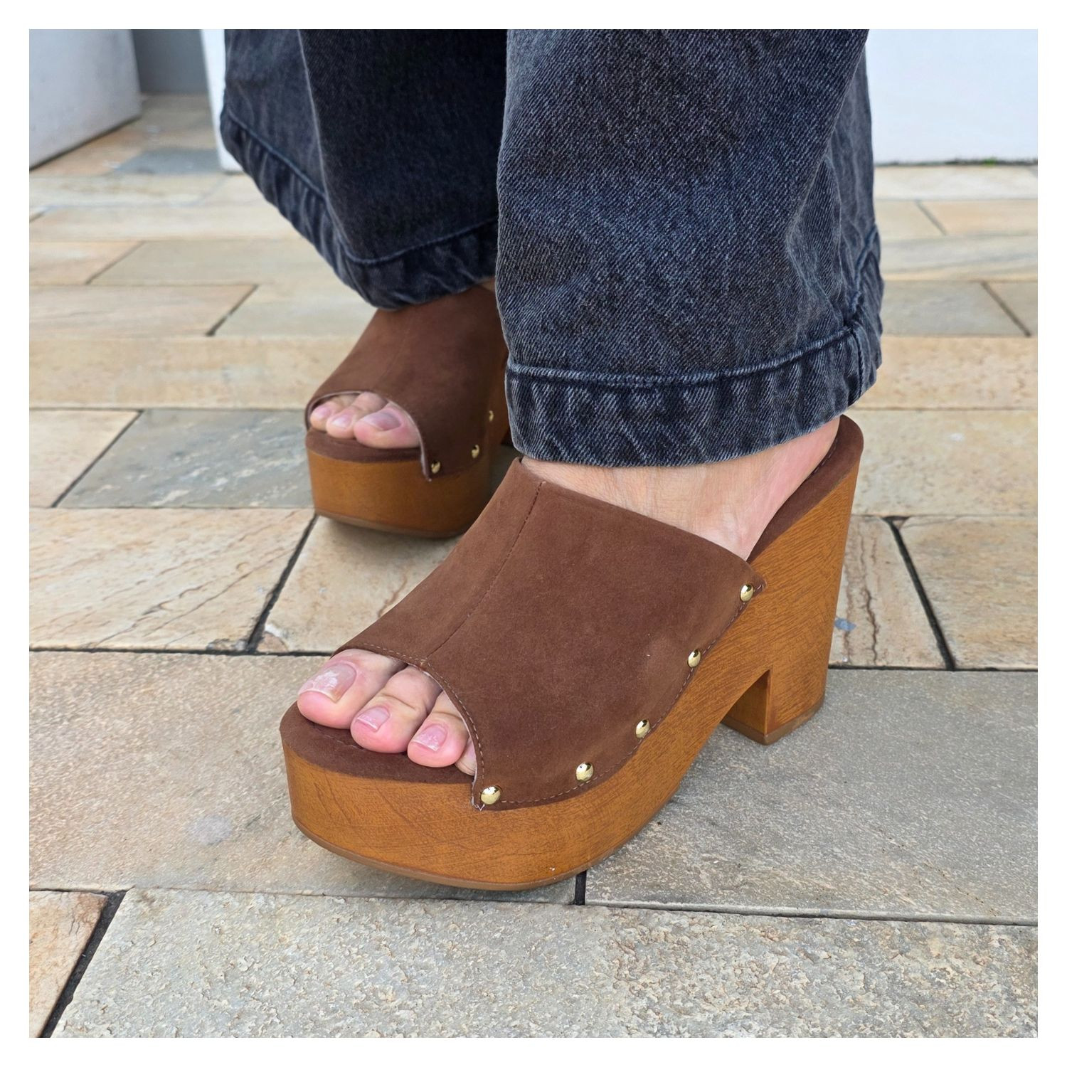Tamanco Salto Alto Plataforma De Madeira, Cabedal Largo Nobuck Marrom, Borda Esferas Douradas.
