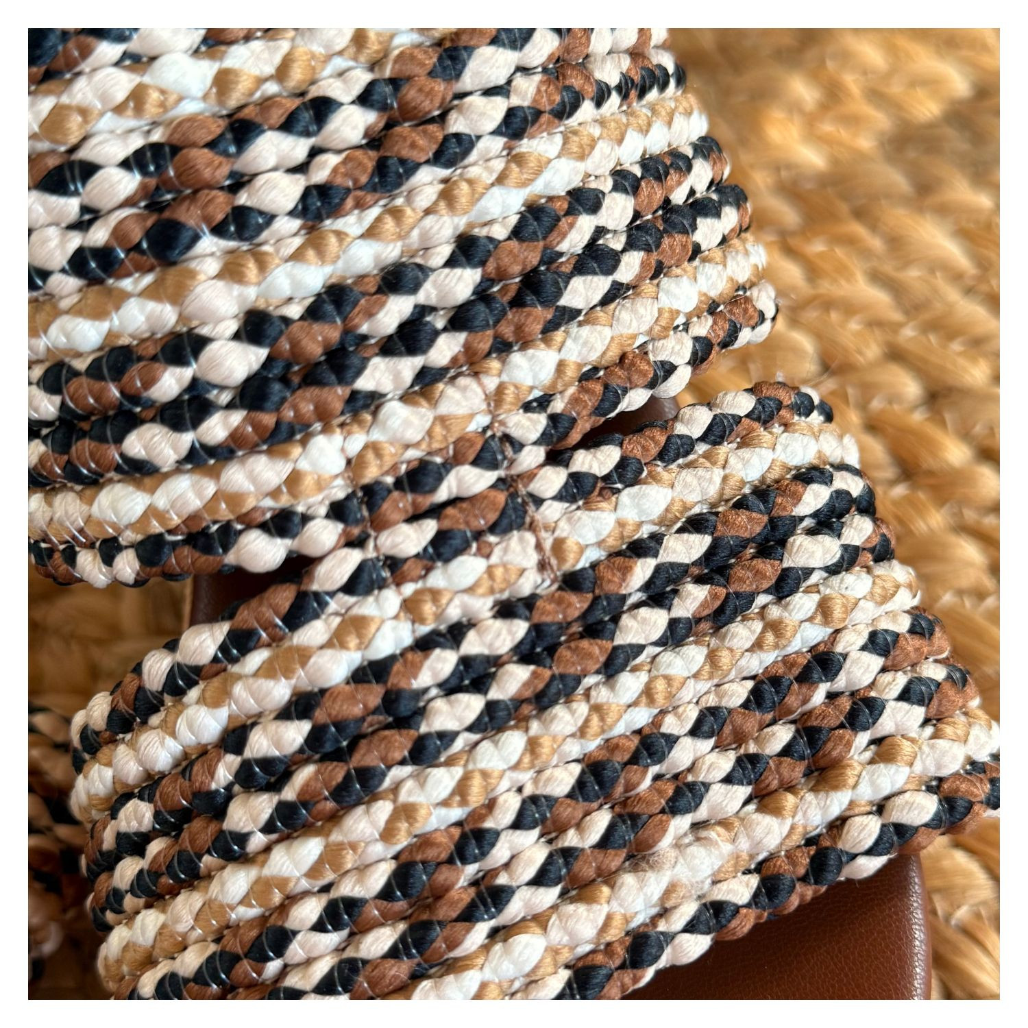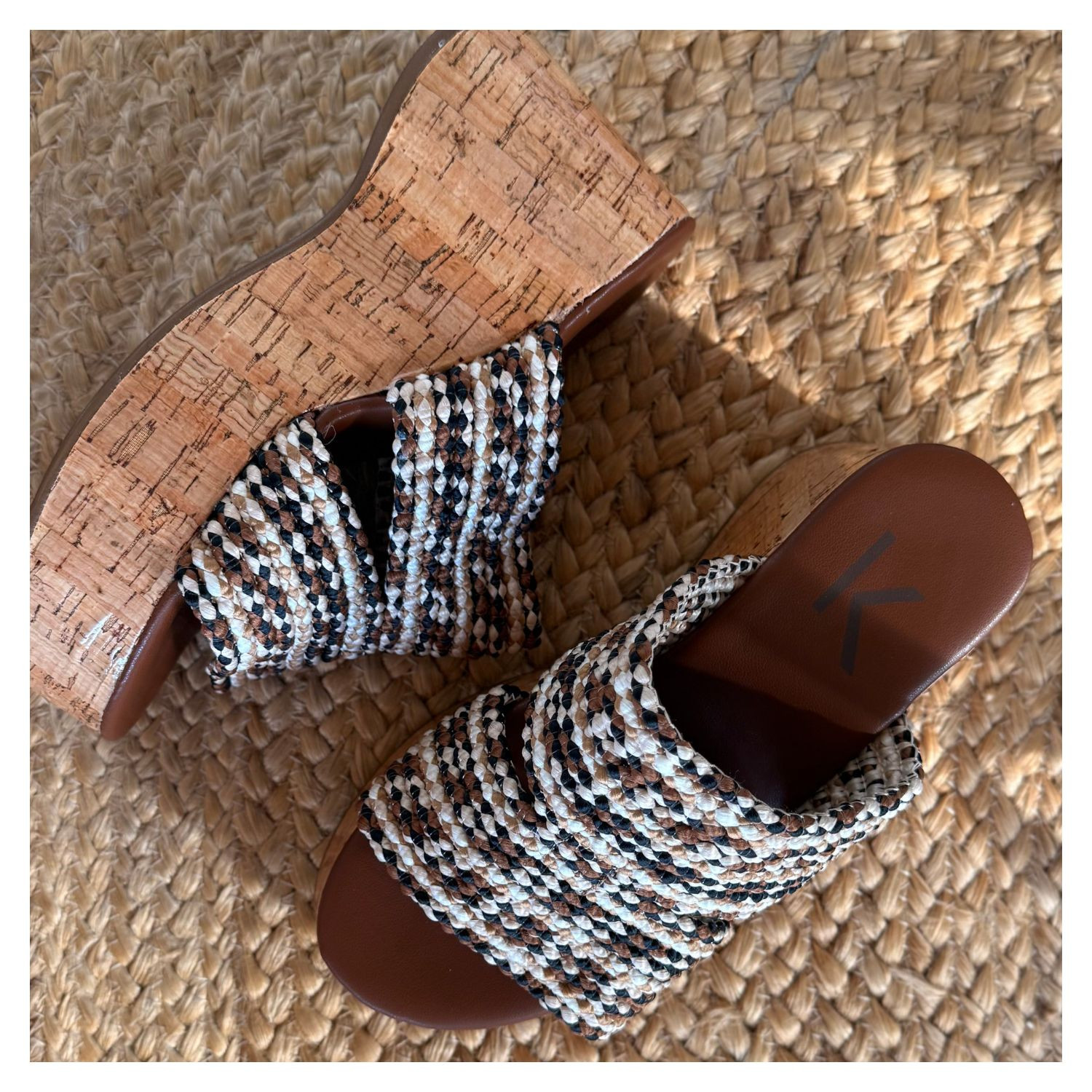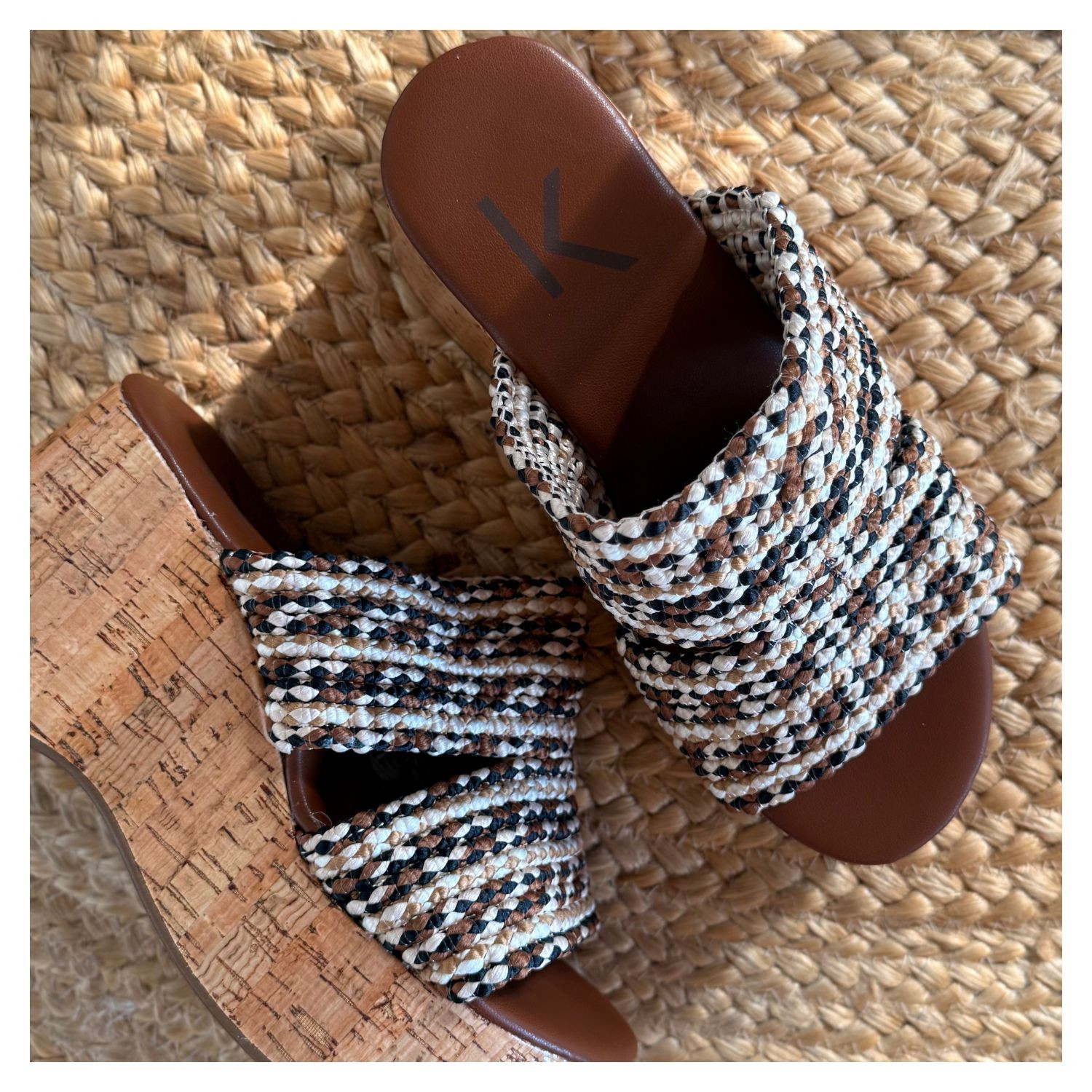 Tamanco Salto Alto Anabela em Cortiça, Cabedal Largo Com Cordas Degrade Entrelaçadas.
