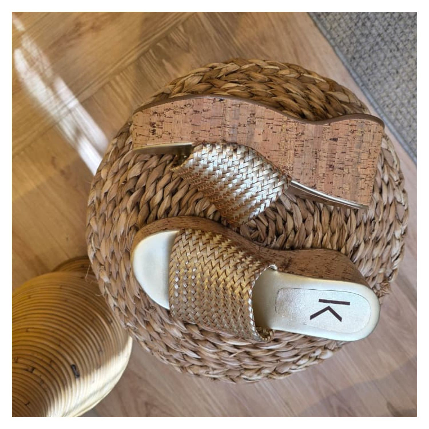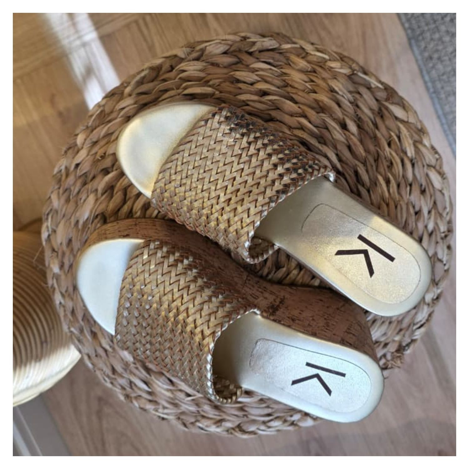 Tamanco Salto Anabela em Cortiça, Cabedal Couro Trançado Dourado Metalizado.