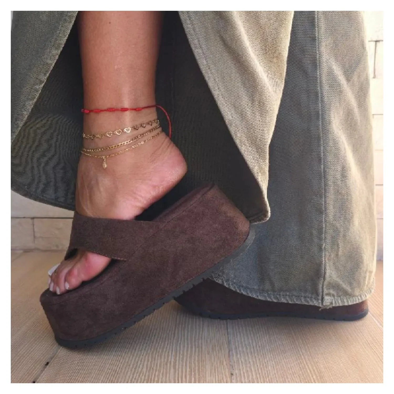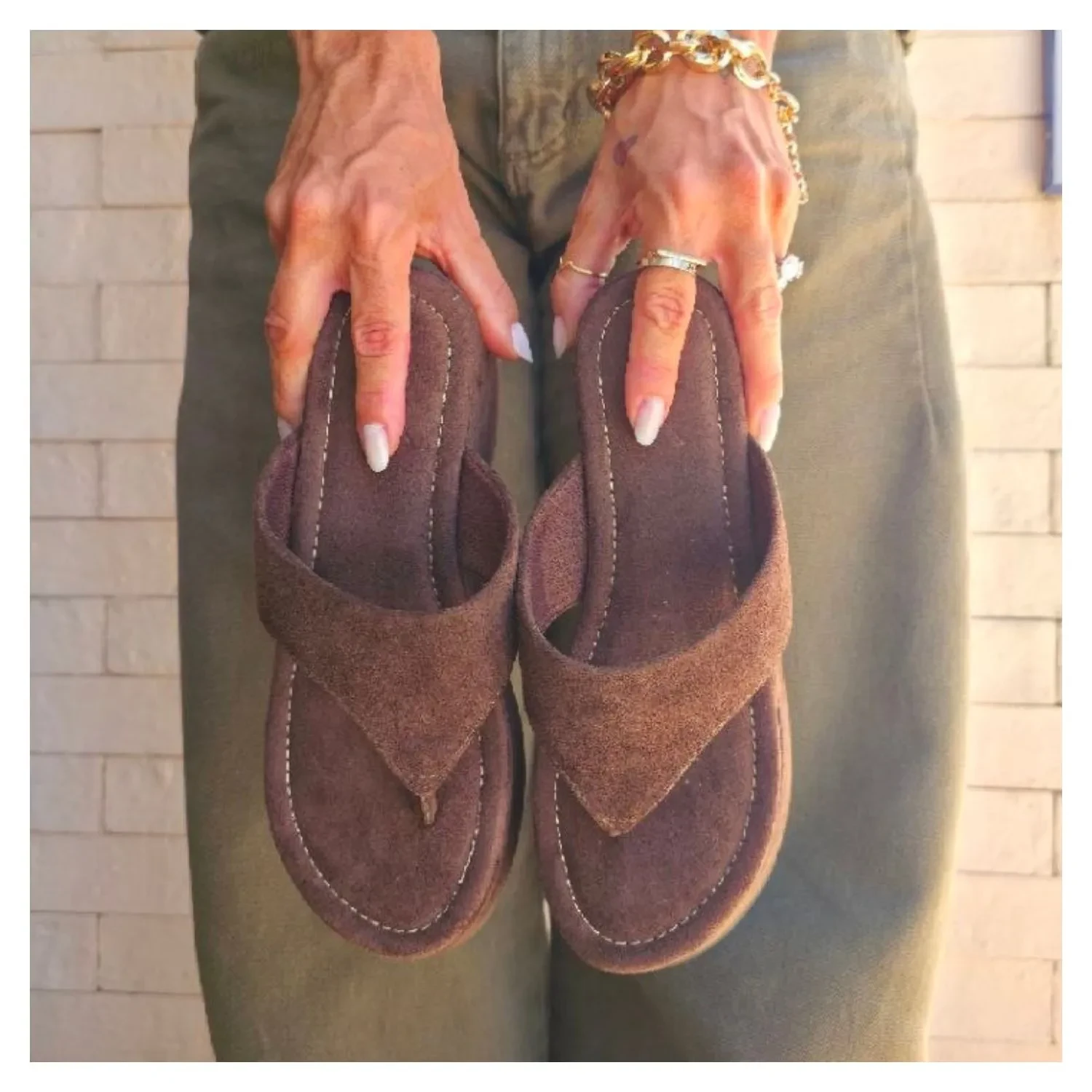 Tamanco em Camurça Marrom Café, Sola Alta Flat, Tira de Dedo Larga.