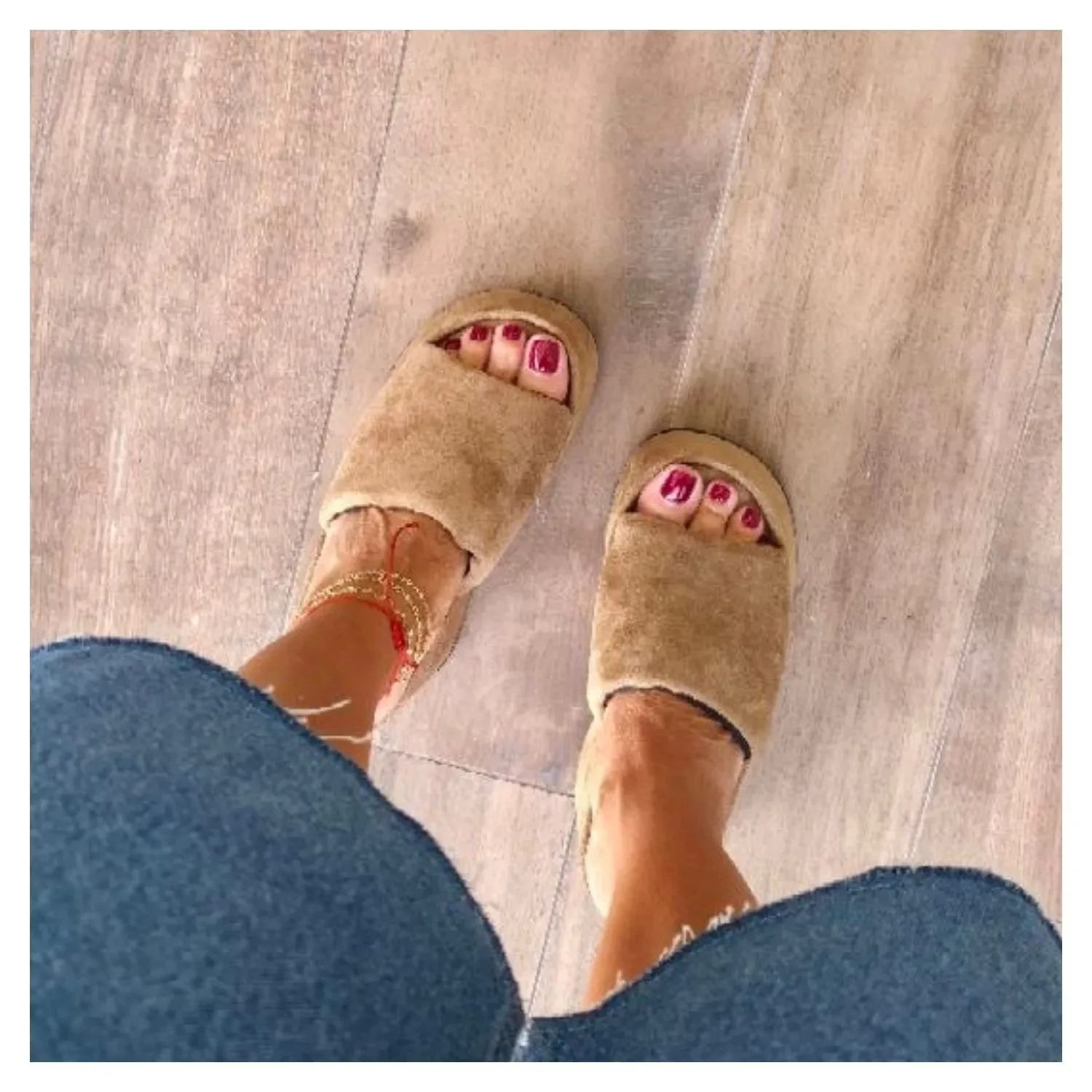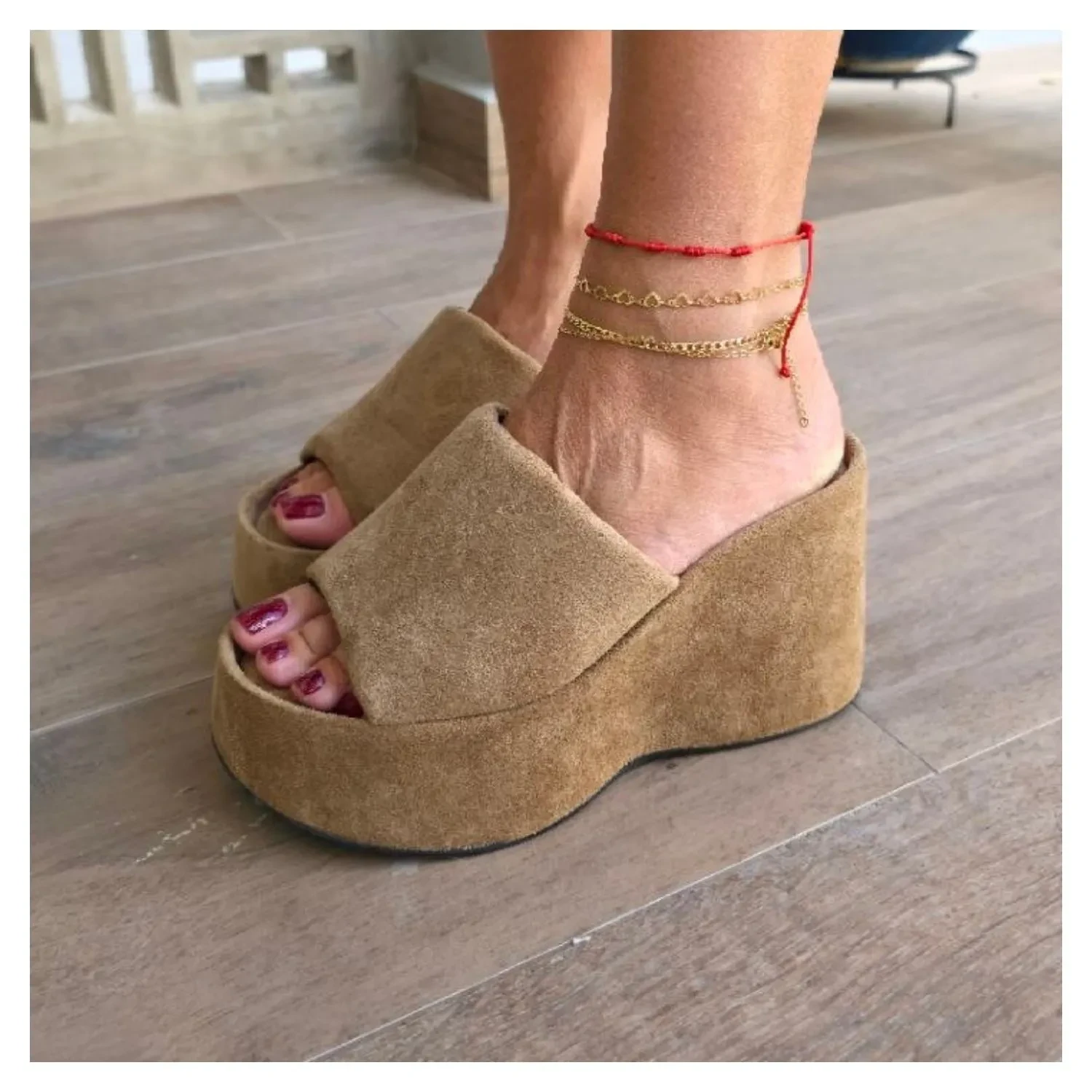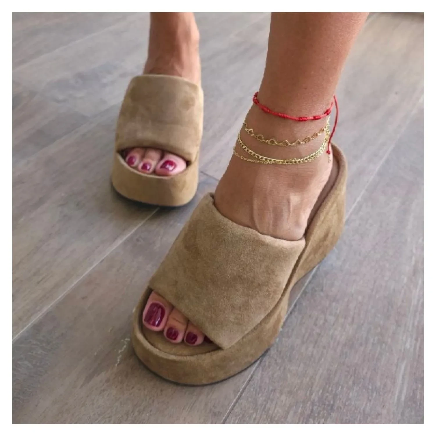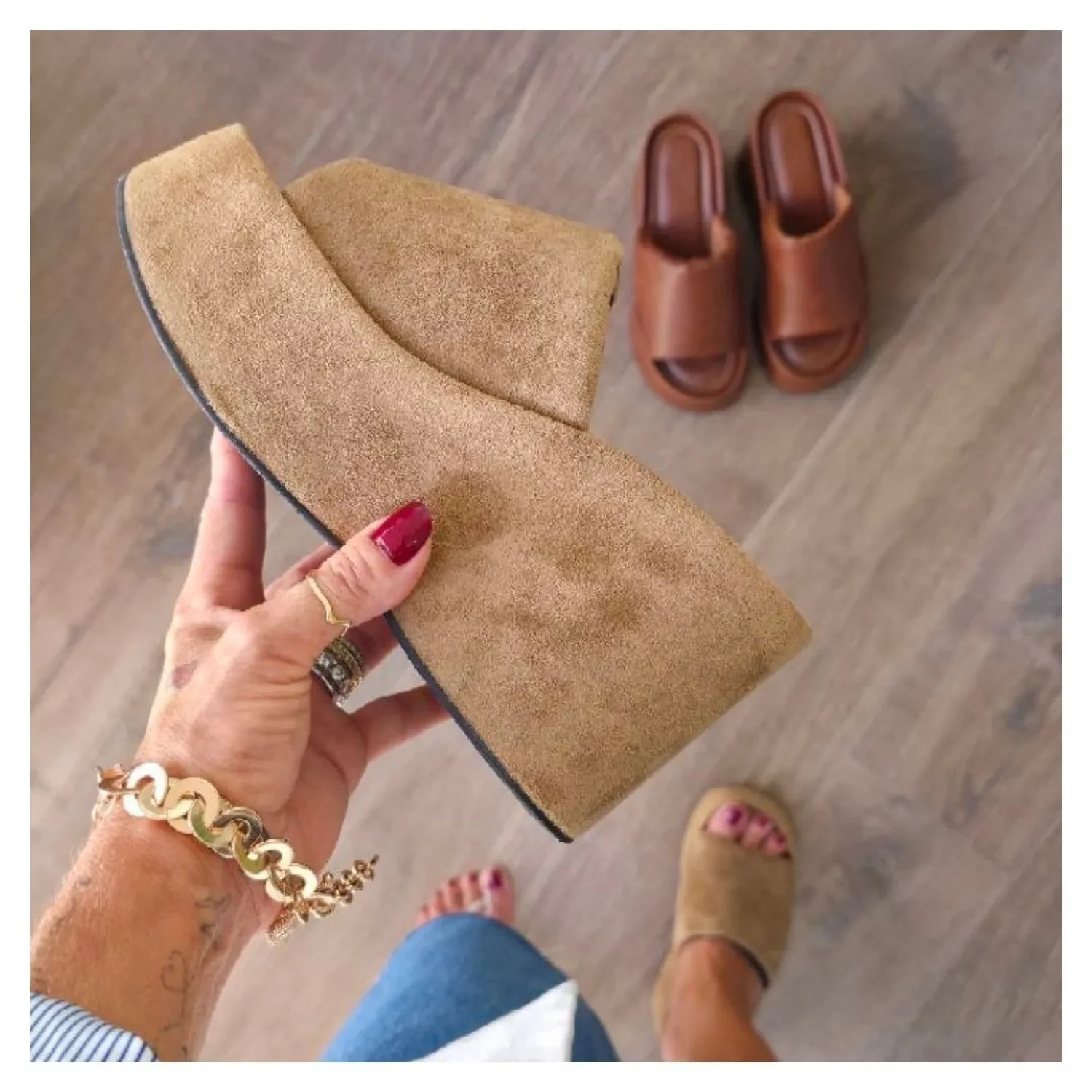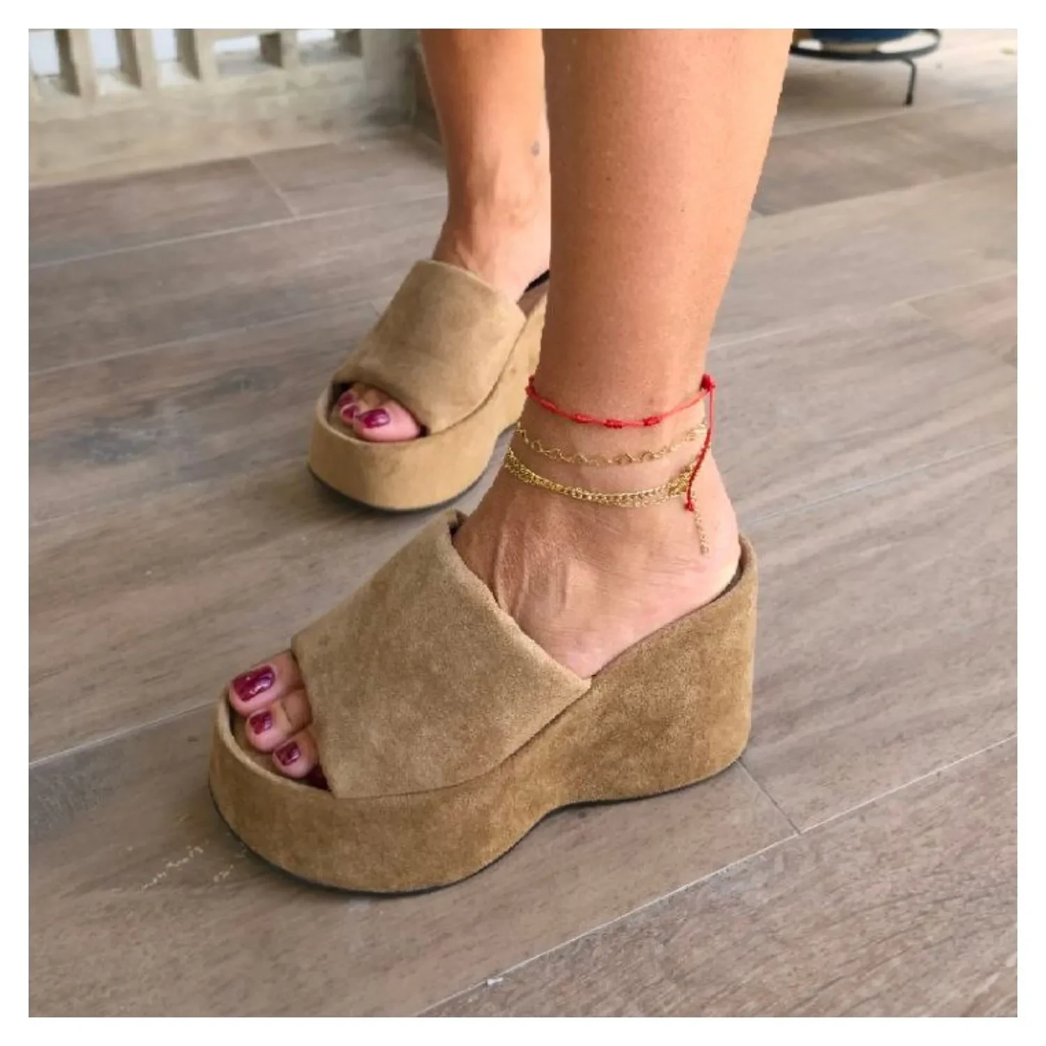 Tamanco Salto Alto Anabela, em Camurça Bege e Tira Larga Puff.