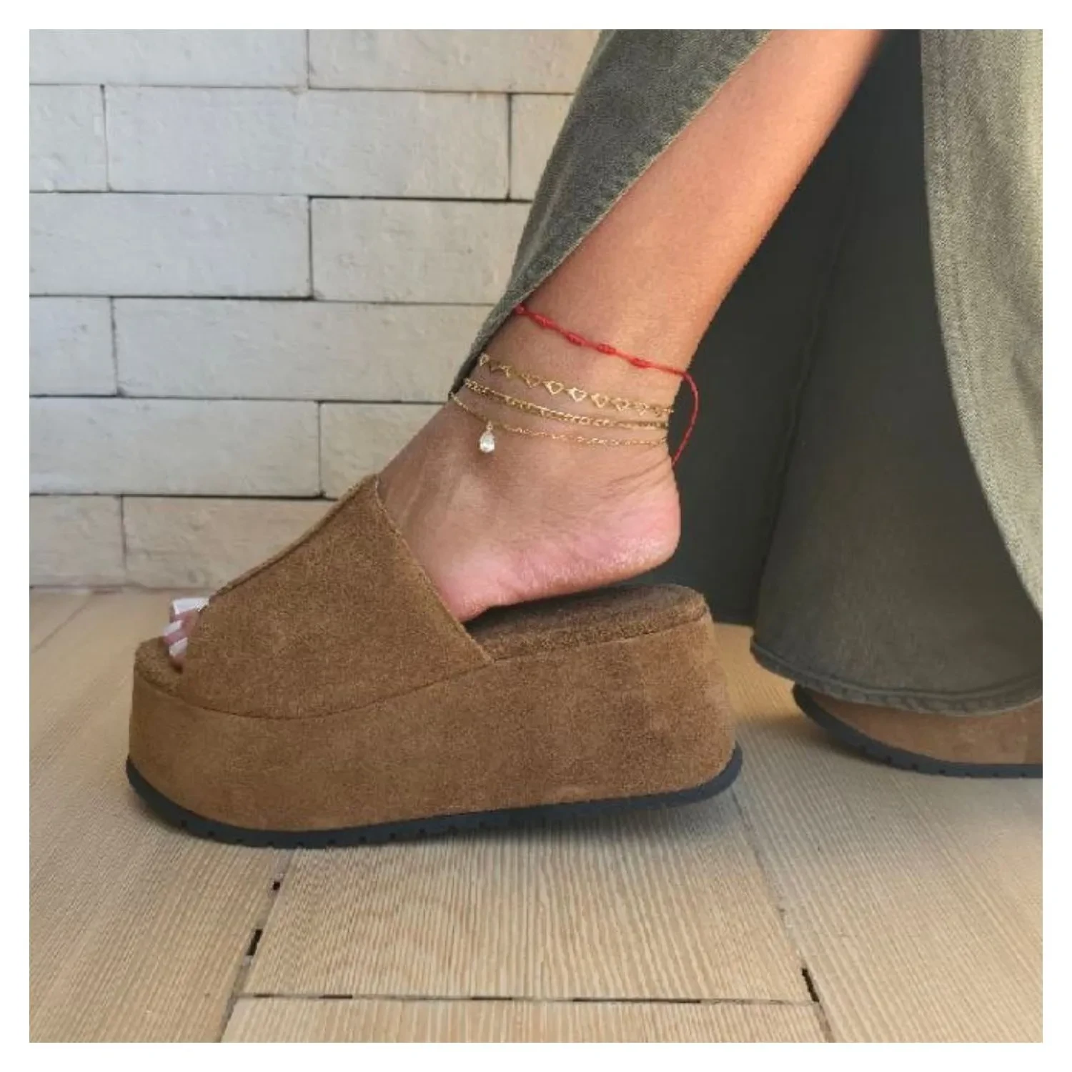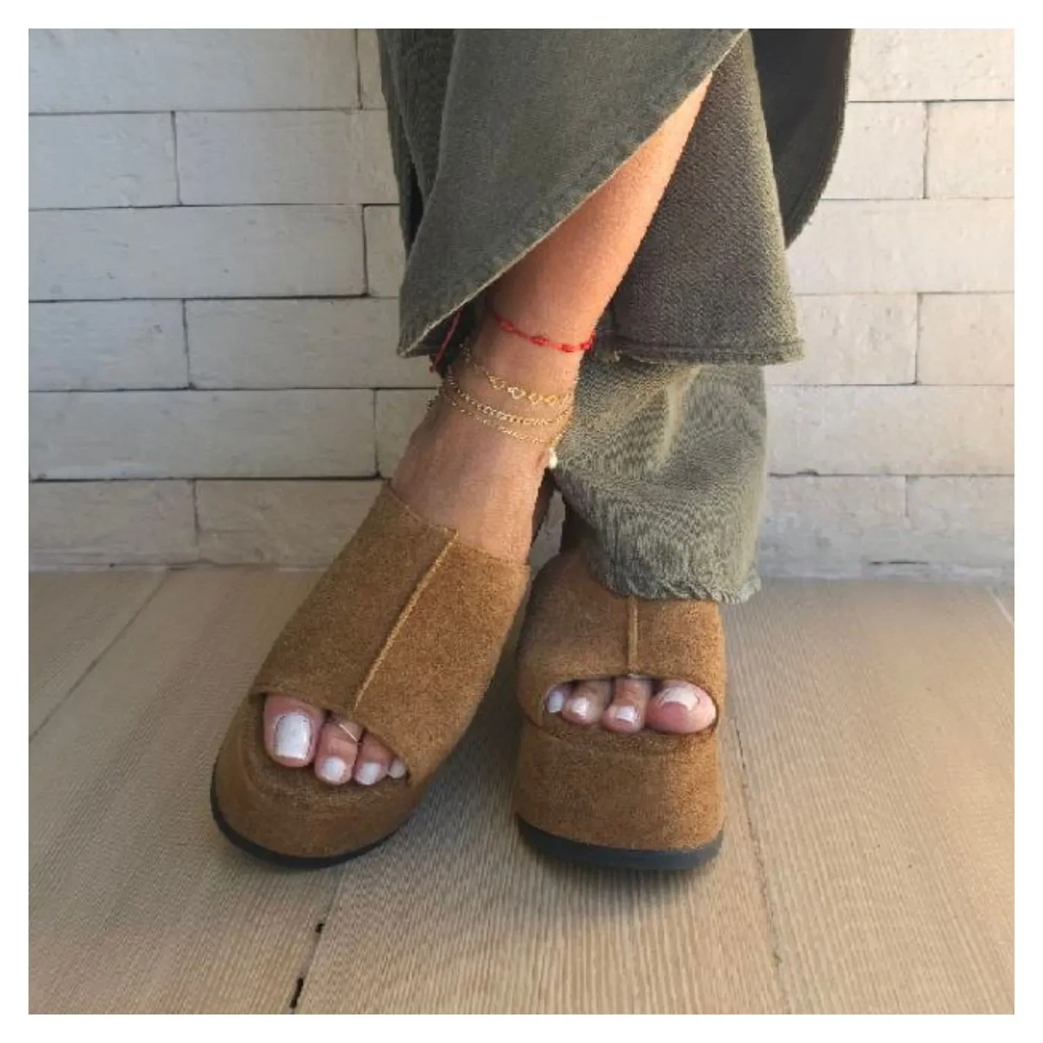 Tamanco em Couro Nobuck Marrom Claro, Cabedal Largo Com Tira Grossa Lisa.
