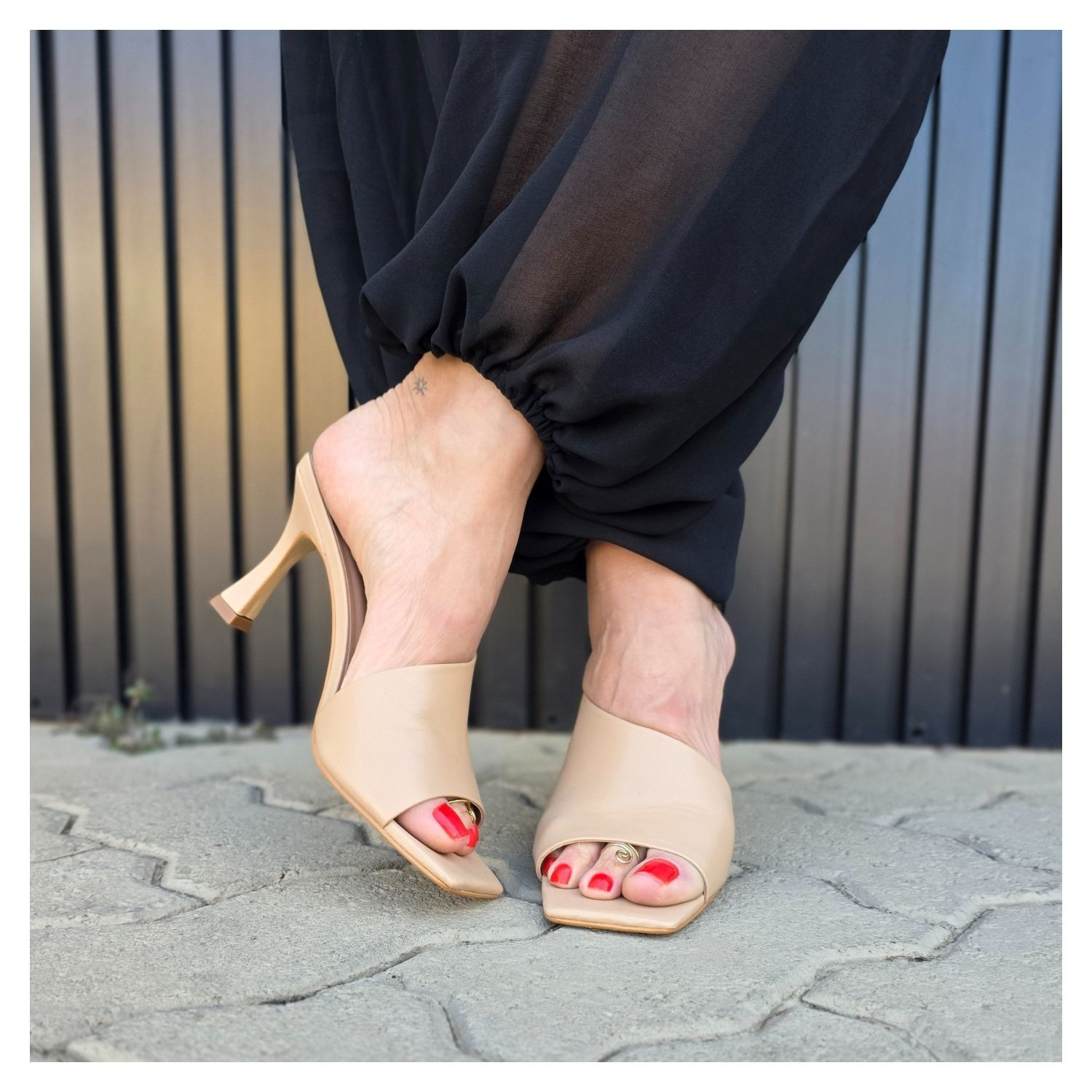 Tamanco Couro Liso Nude, Cabedal Assimétrico, Salto Taça.