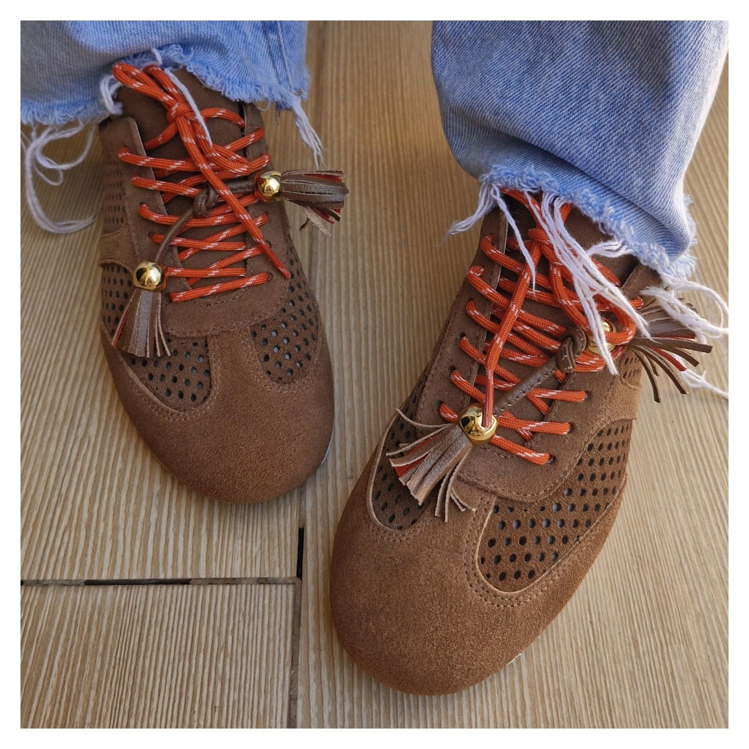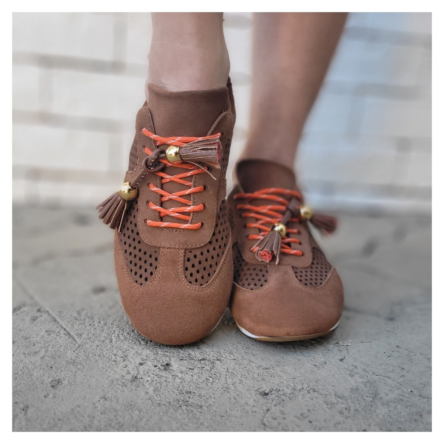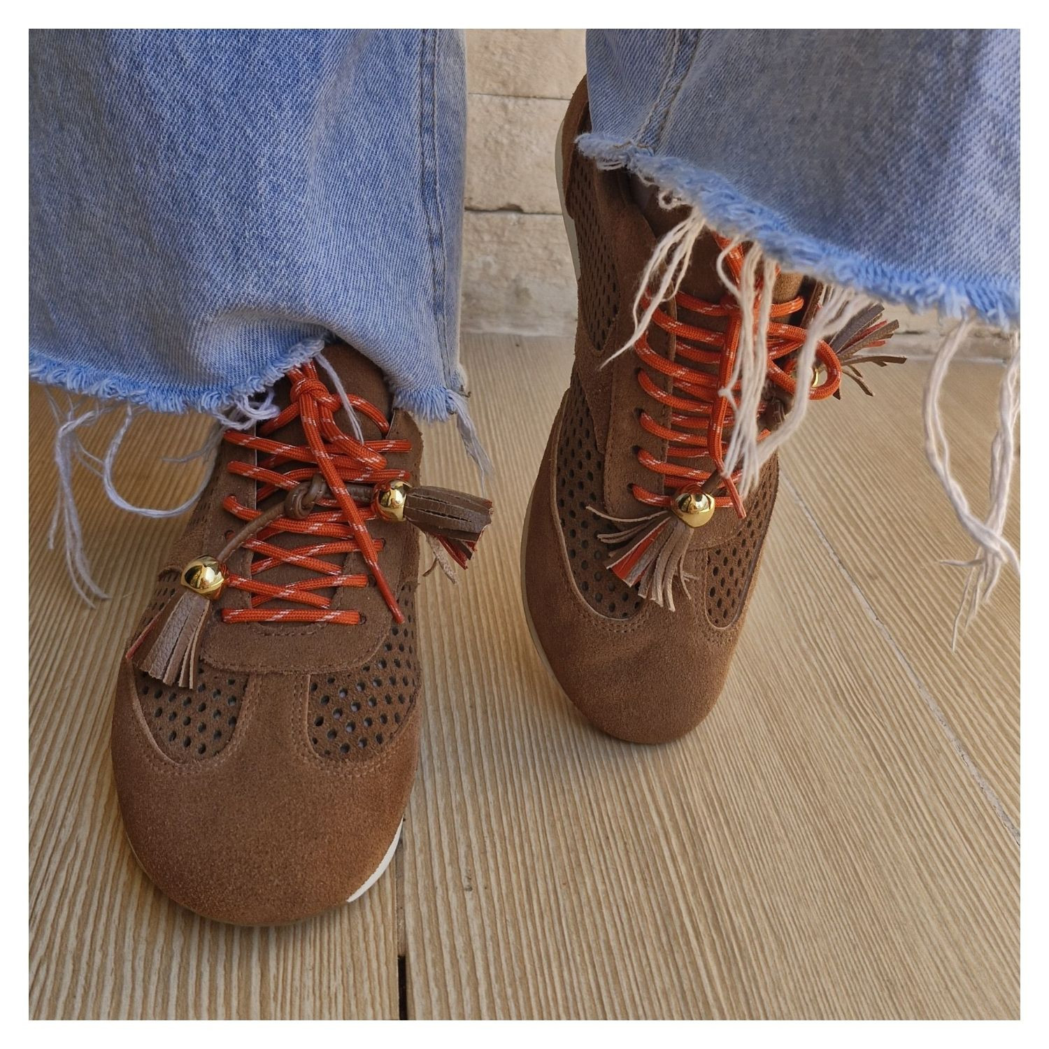 Tênis Em Nobuck Marrom Escuro Com Detalhes Laranja, Bico Arredondado, Sola Reta Flat e Duas Opções de Cadarço Para Trocar.