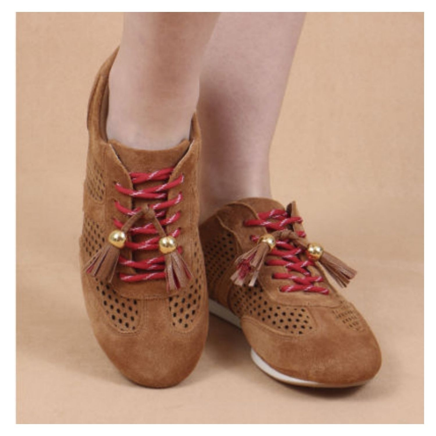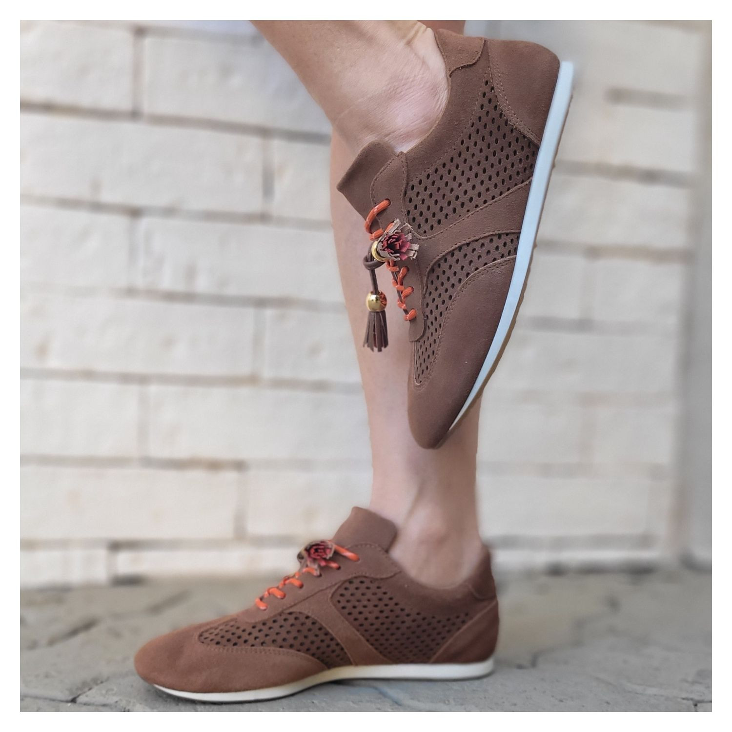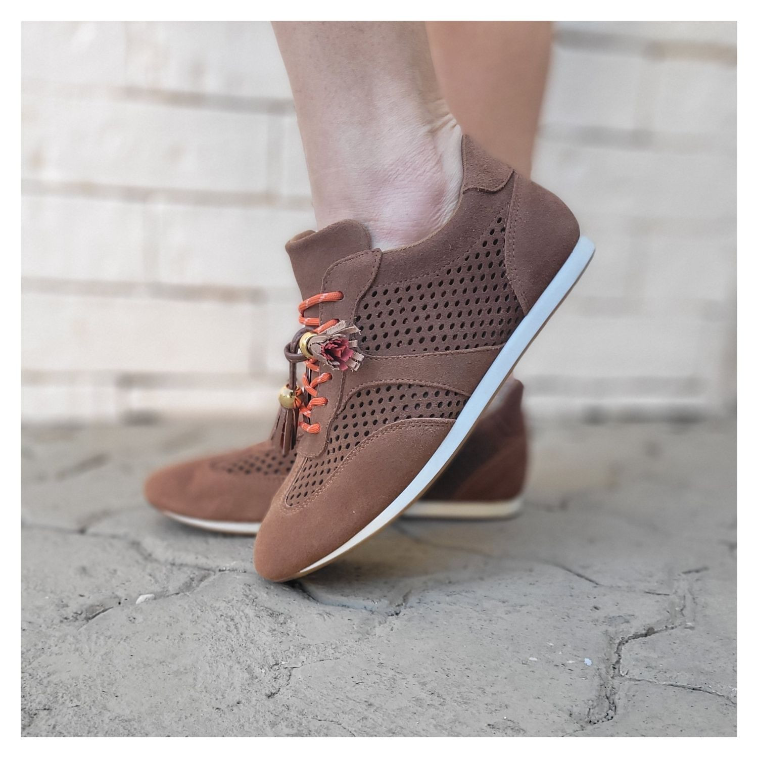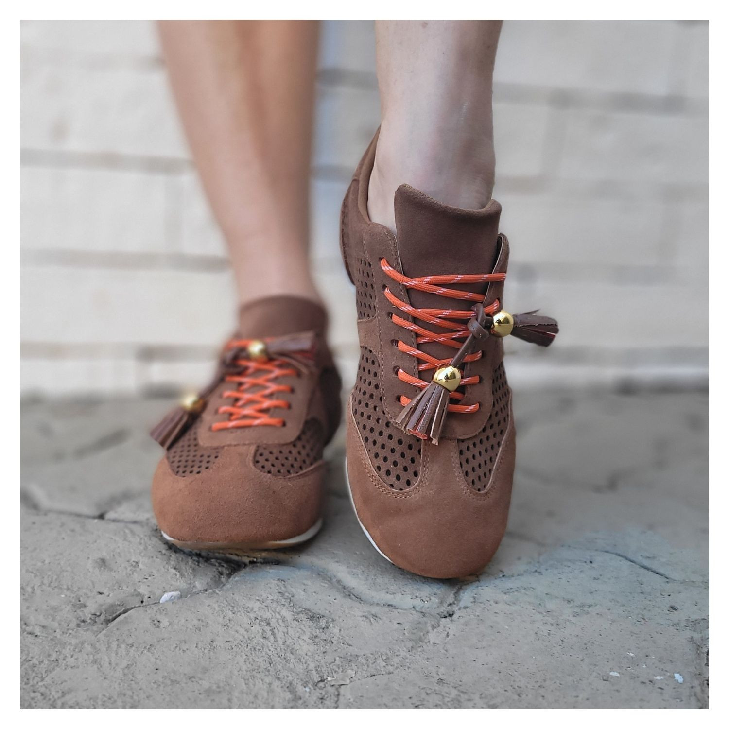 Tênis Em Nobuck Marrom Escuro Com Detalhes Laranja, Bico Arredondado, Sola Reta Flat e Duas Opções de Cadarço Para Trocar.