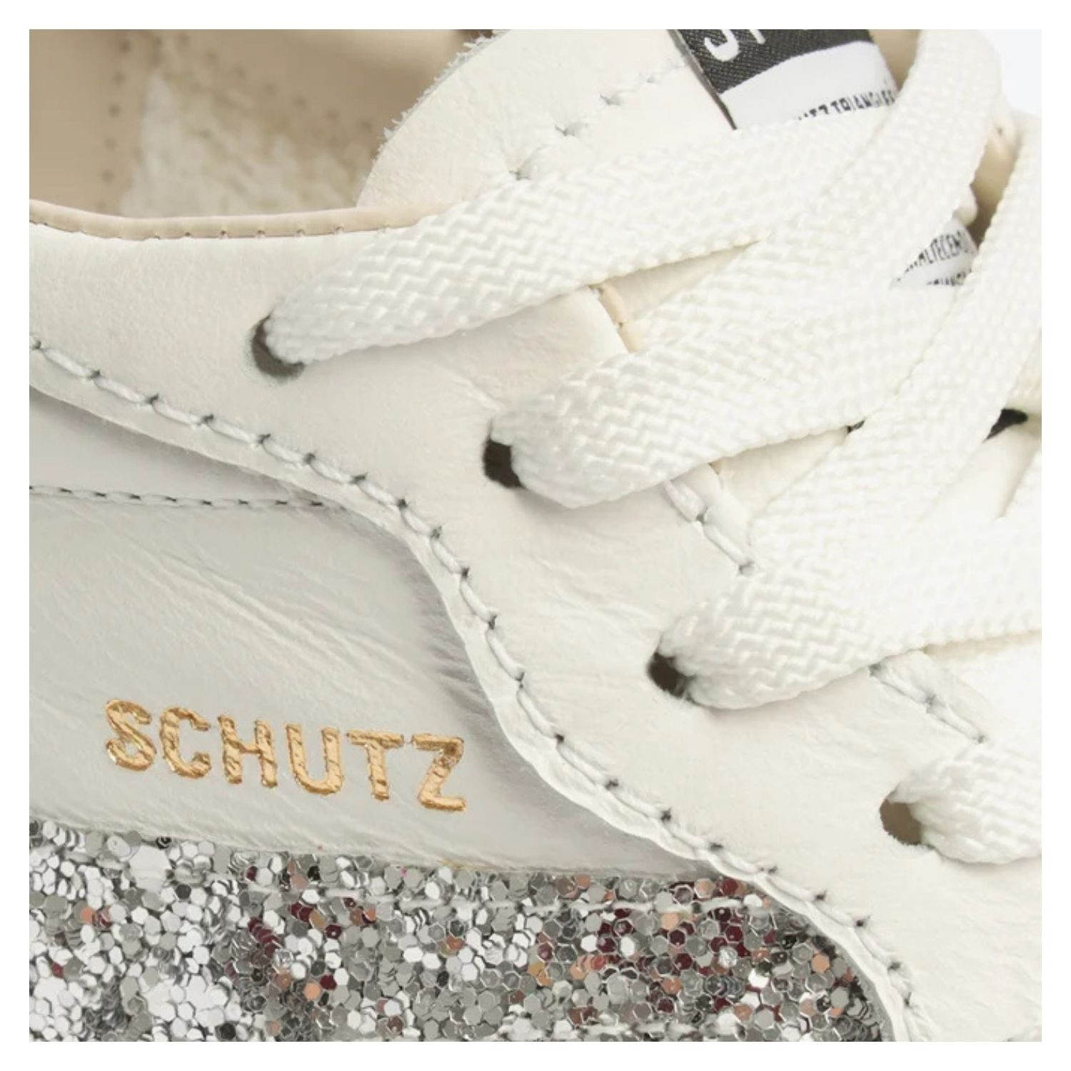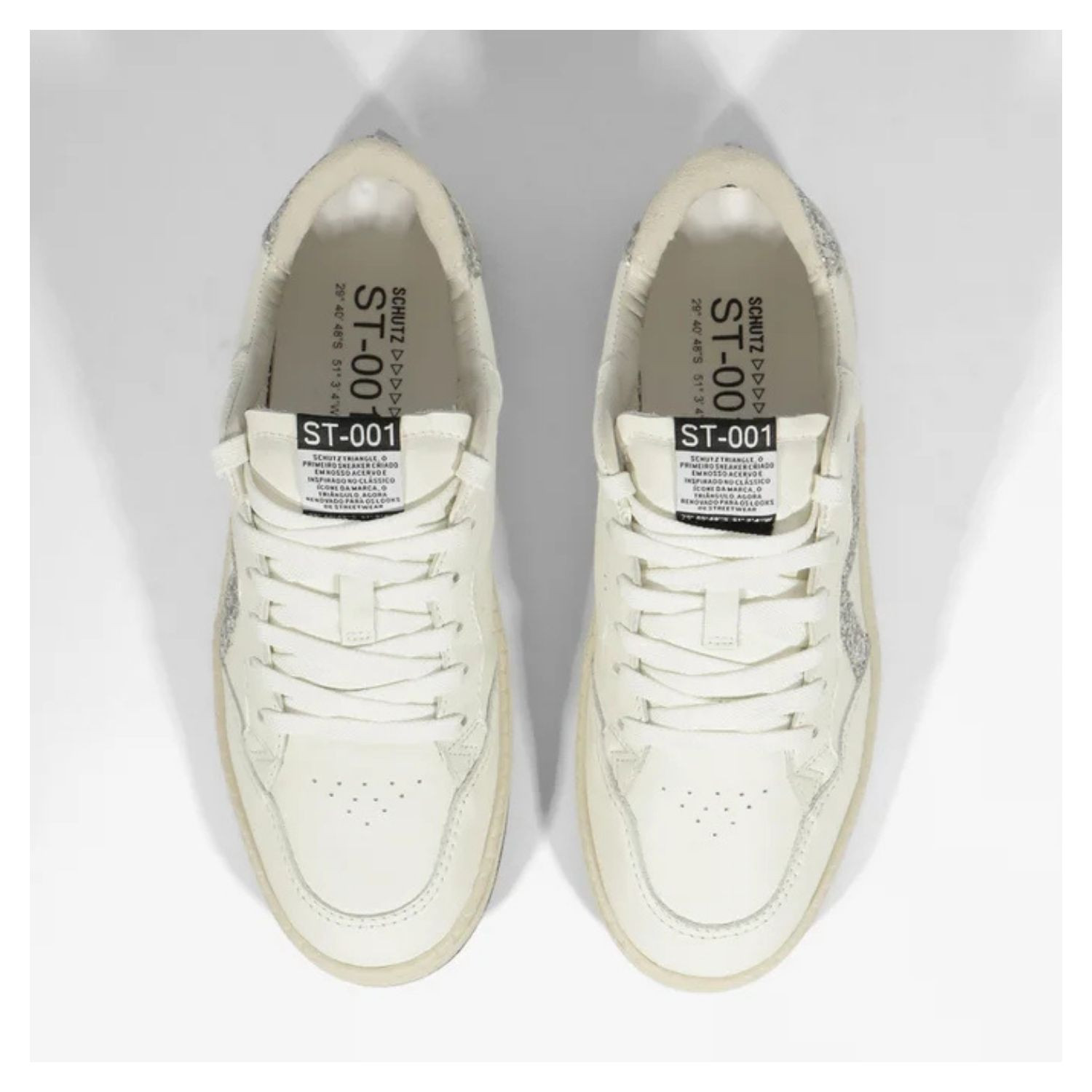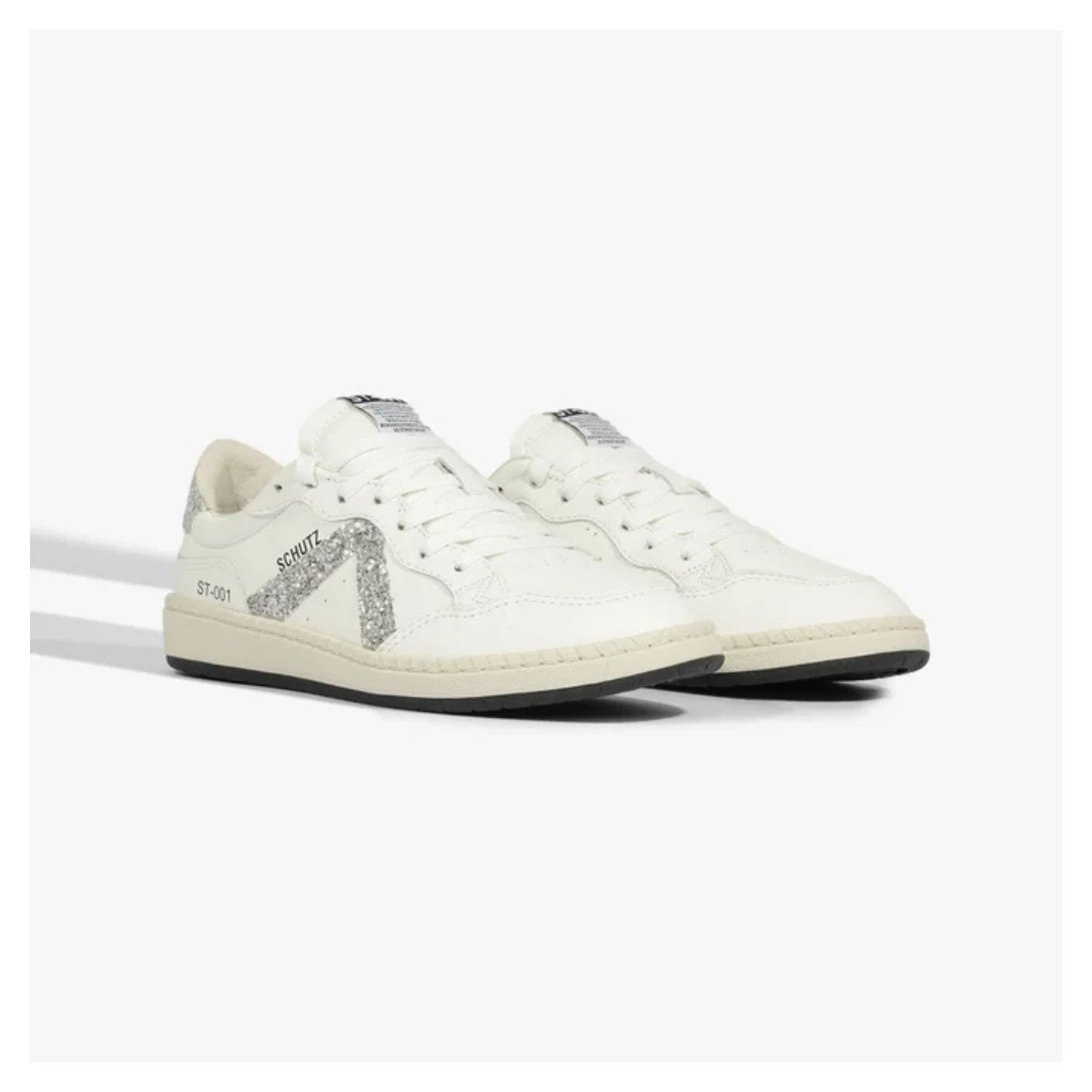 Tênis Couro Off White, Detalhes Em Brilhos Prata Na Lateral e Atras, Atoalhado Na Parte Interna, Com Cadarço.