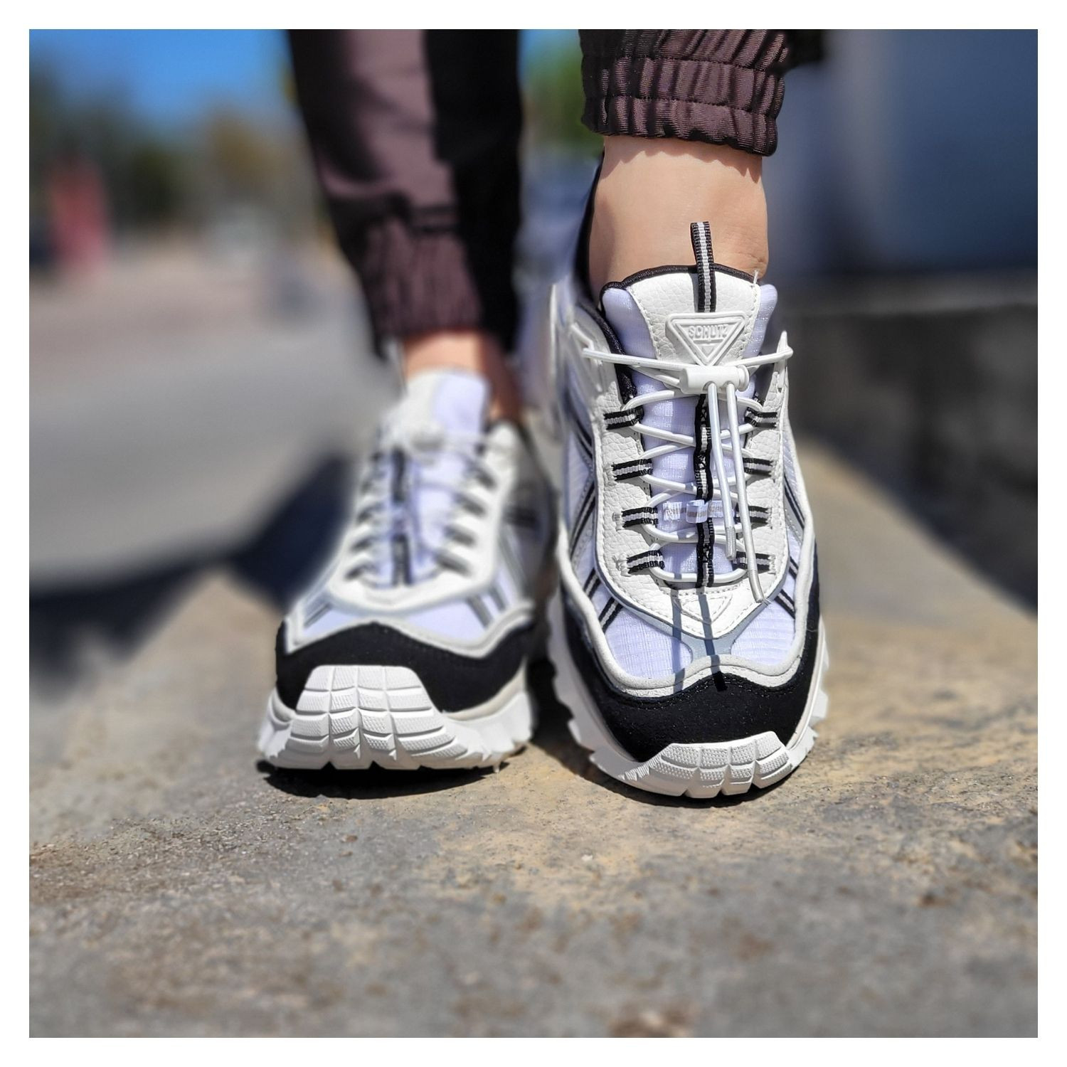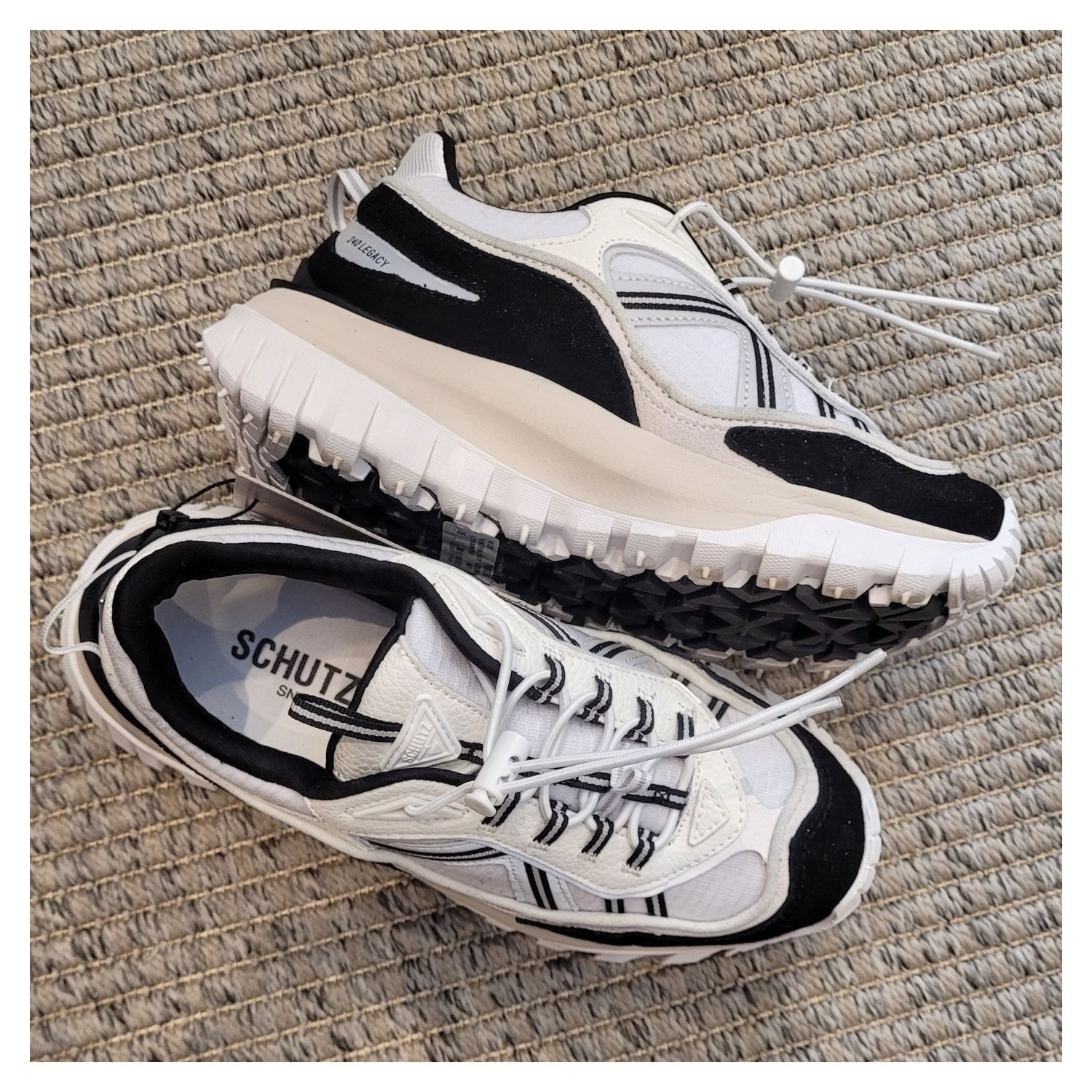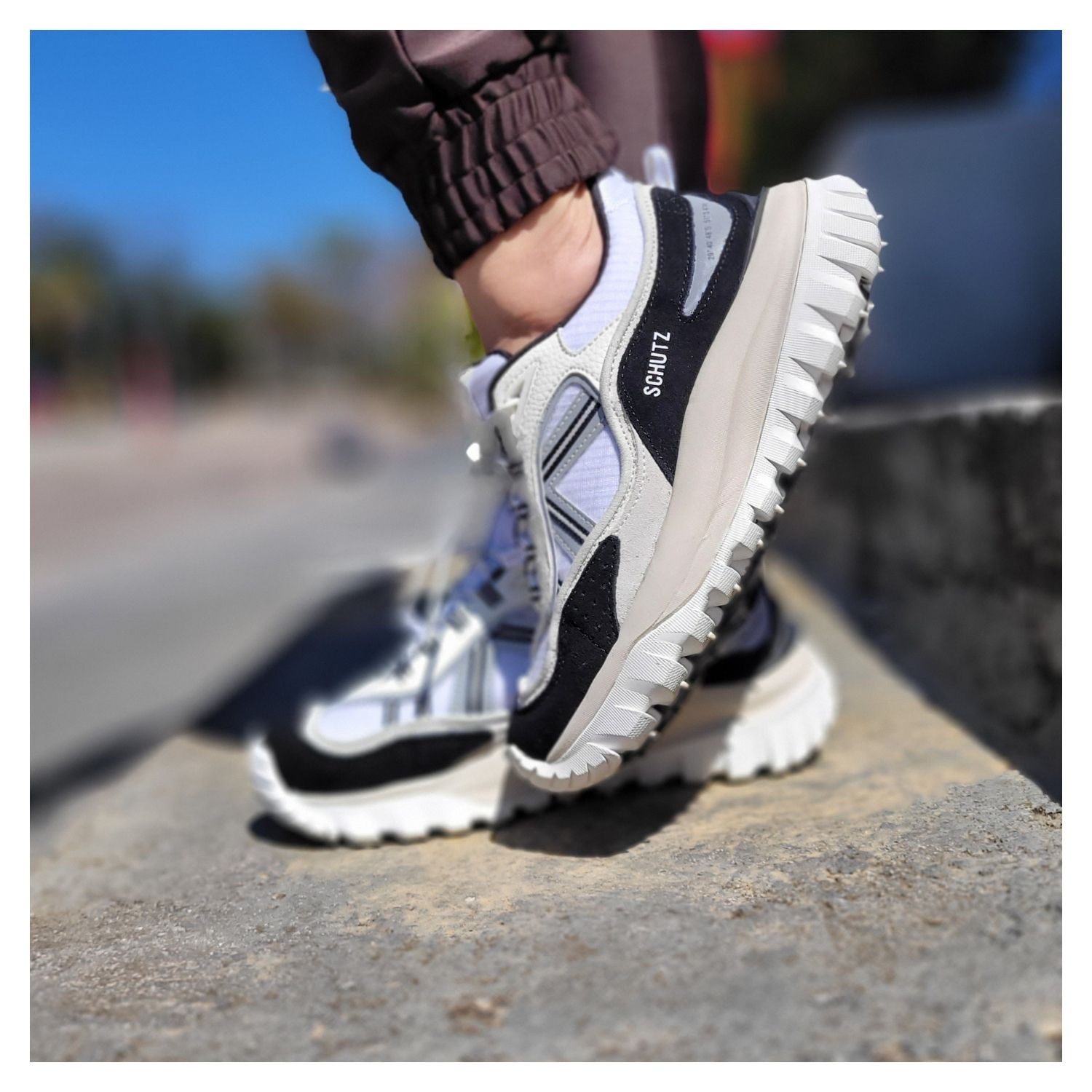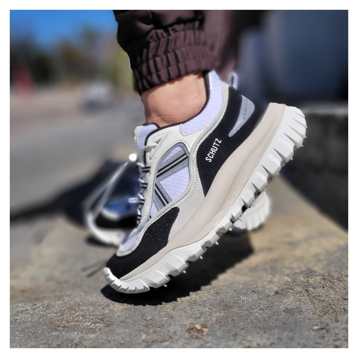 Tênis Schutz 240 Legacy Branco Preto, Maxi Sola Emborrachada, Cadarço e Detalhes em Couro Off White.