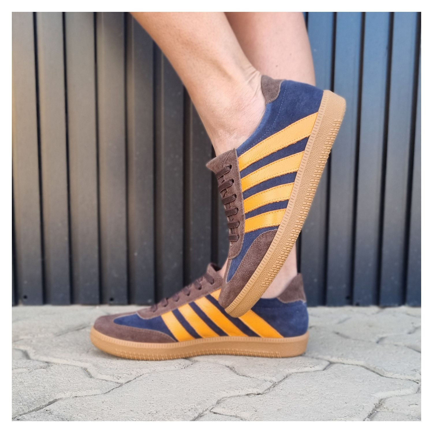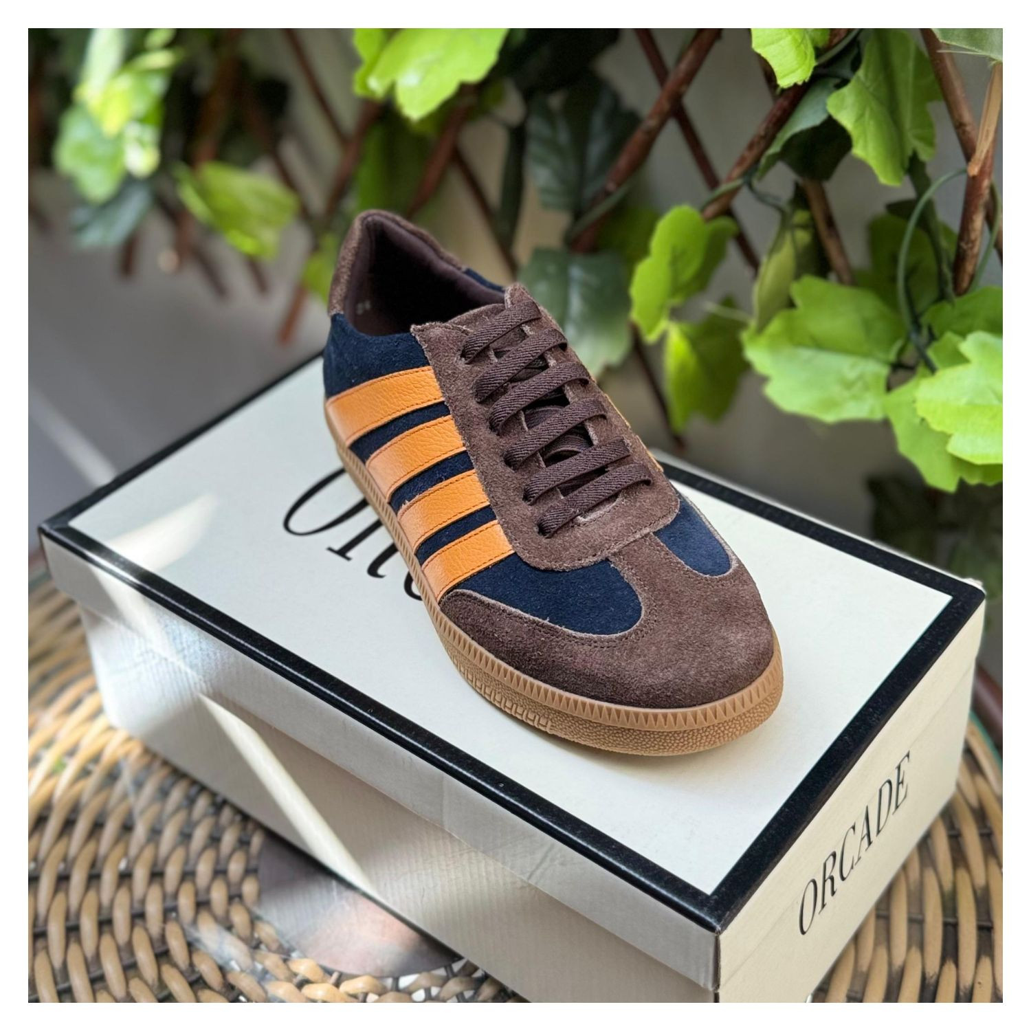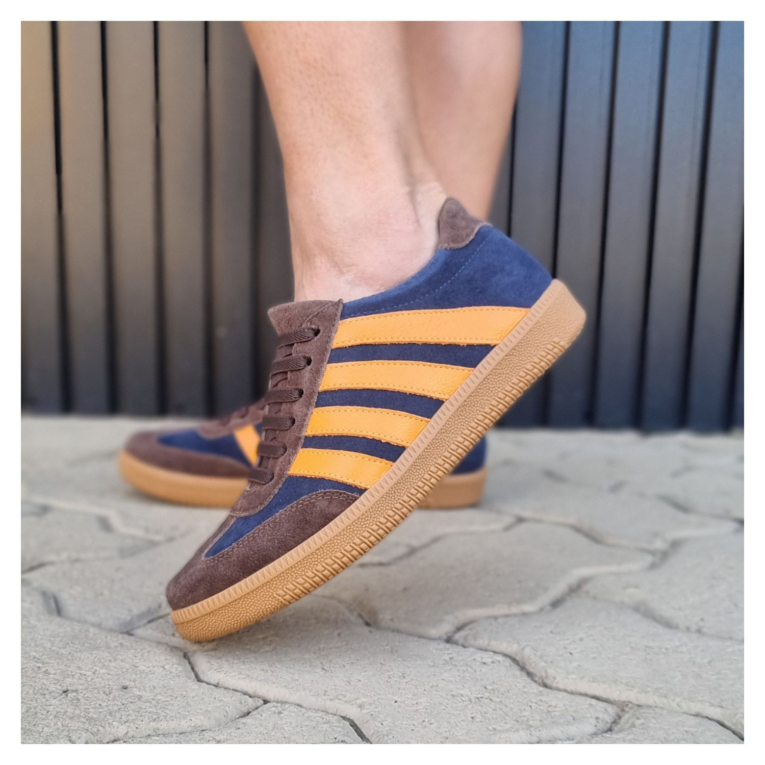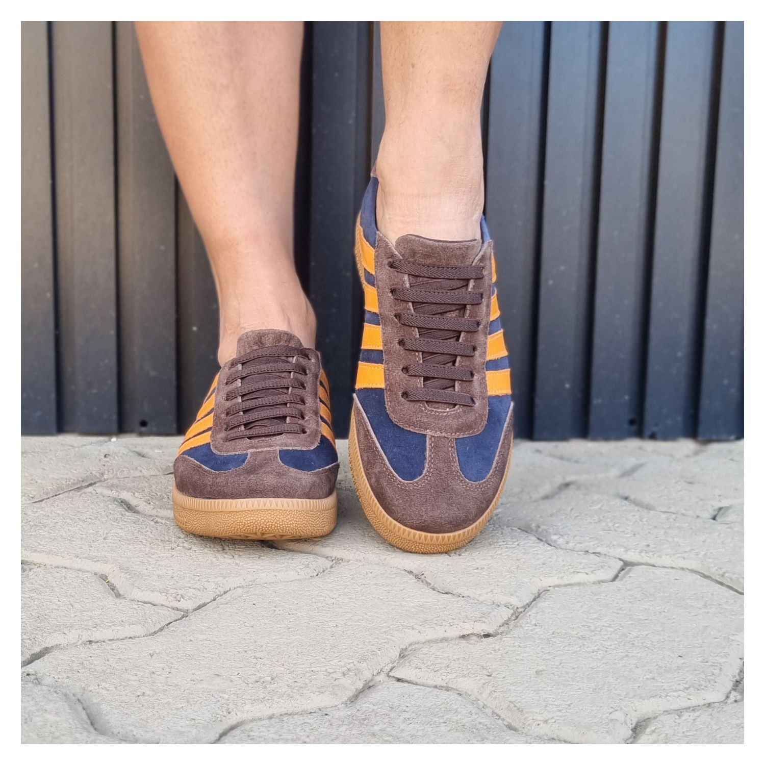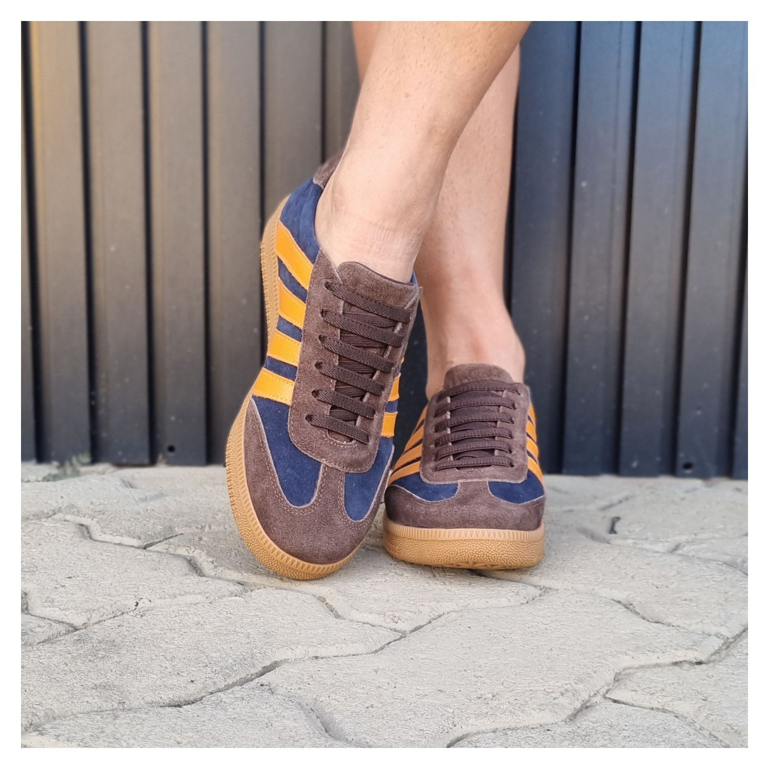 Tênis em Couro Nobuk Azul Marinho e Detalhes Marrom, Listras Laranja na Lateral, Cadarço Elástico e Sola Bege Emborrachada.