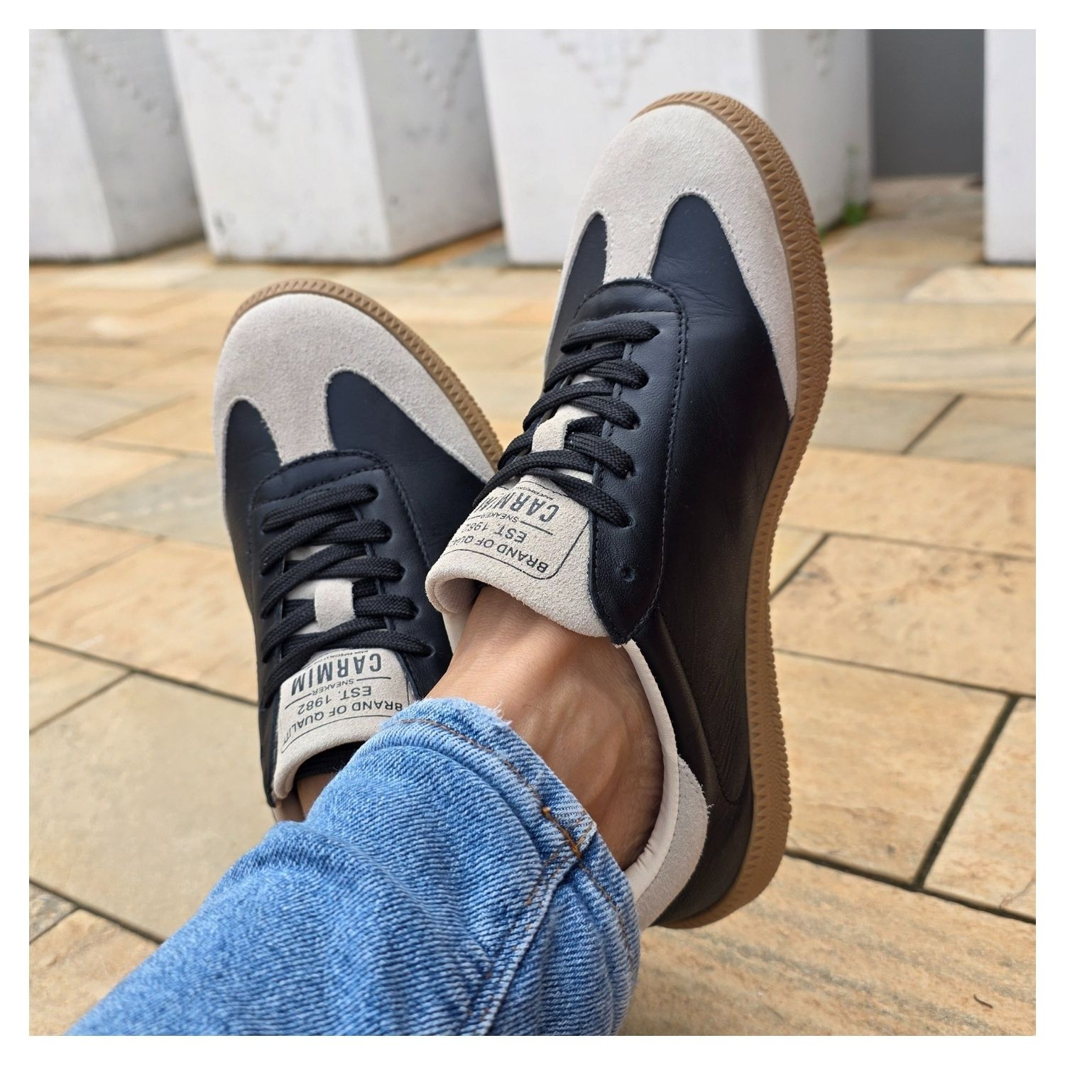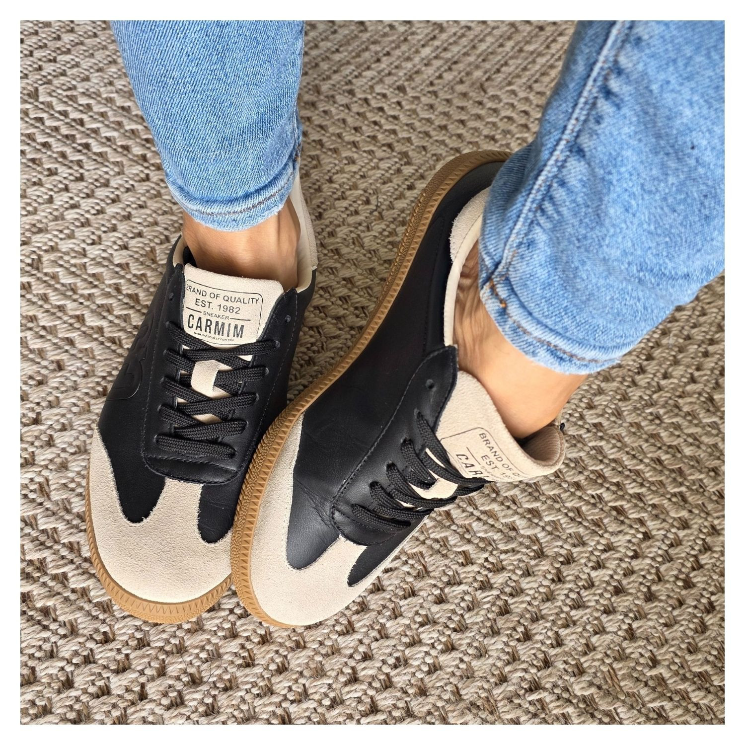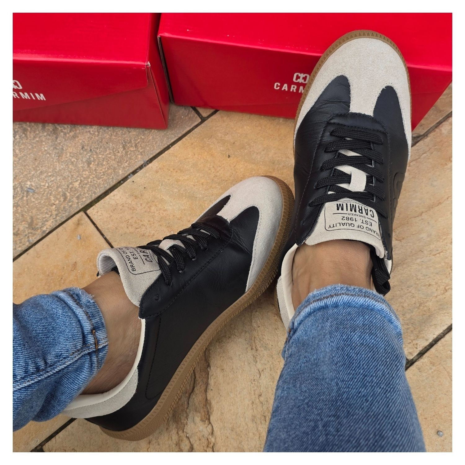 Tênis Bray Lateral Todo De Couro Preto, Ponta Creme Em Nobuck, Logo Carmim E Cadarço Preto, Sola Caramelo.