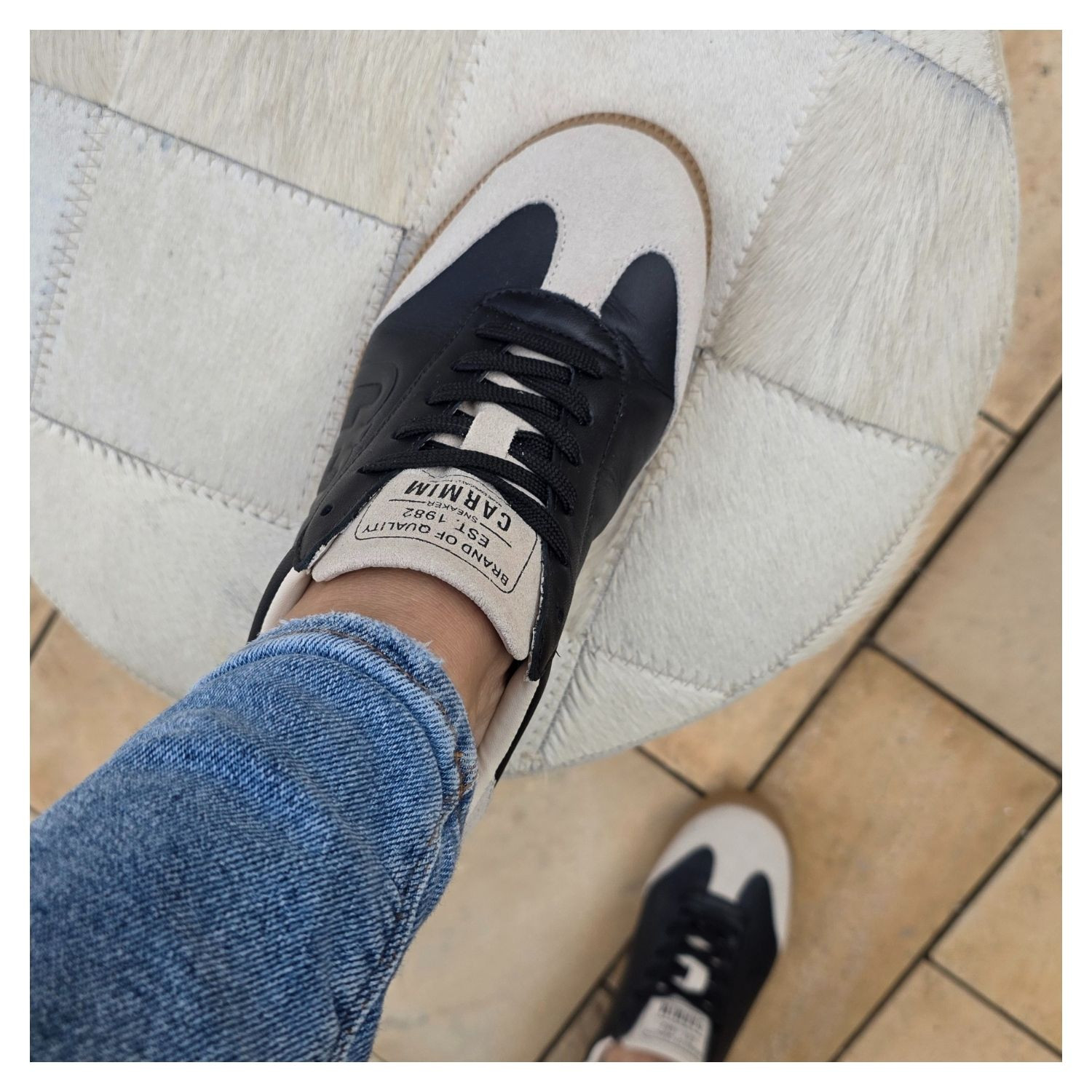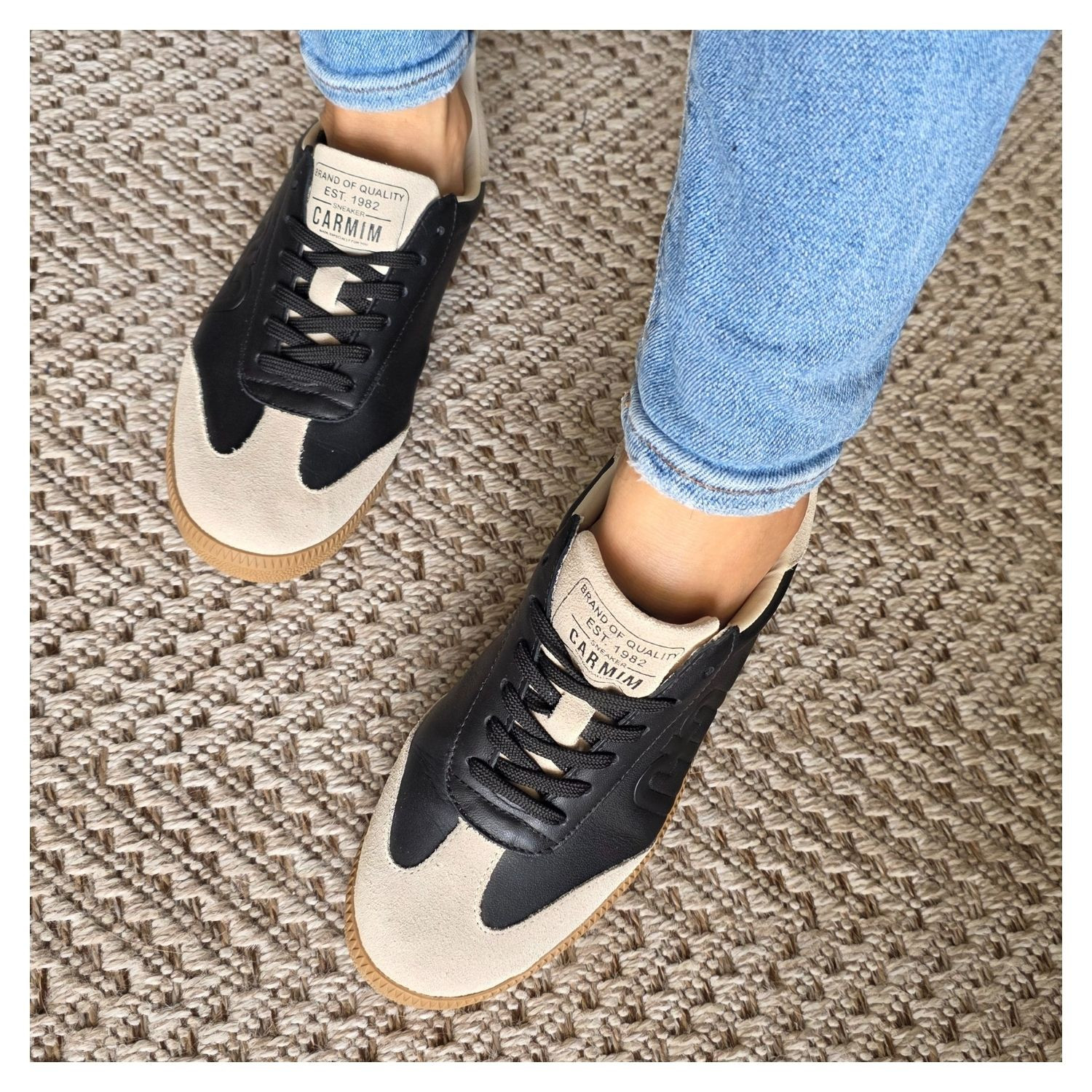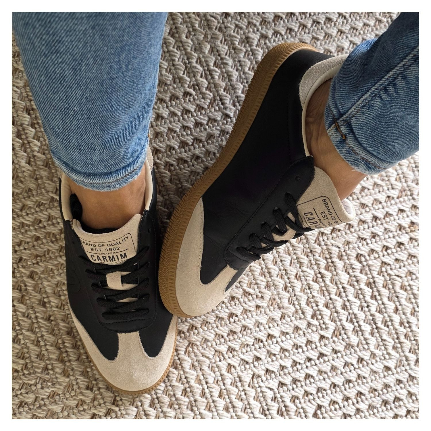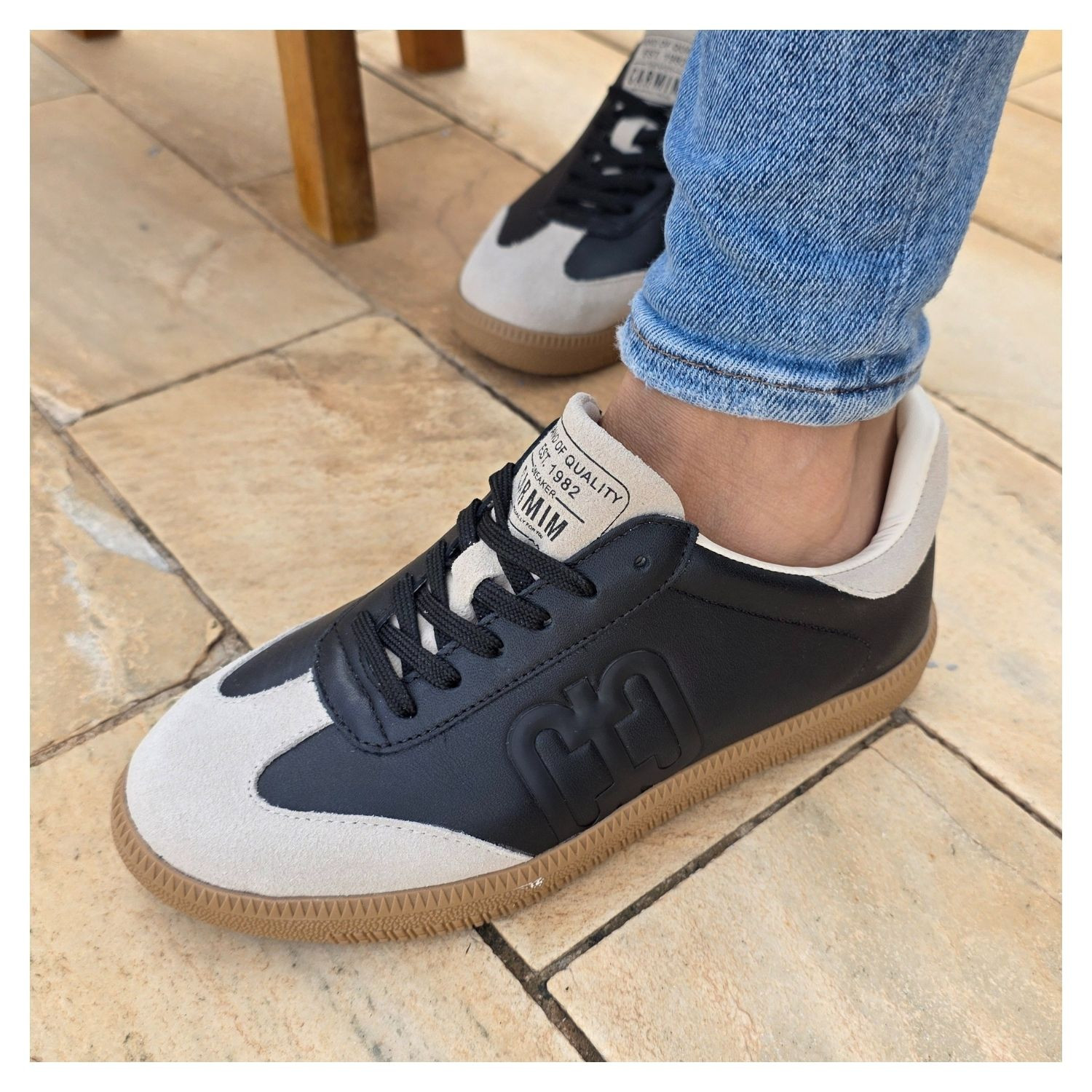 Tênis Bray Lateral Todo De Couro Preto, Ponta Creme Em Nobuck, Logo Carmim E Cadarço Preto, Sola Caramelo.