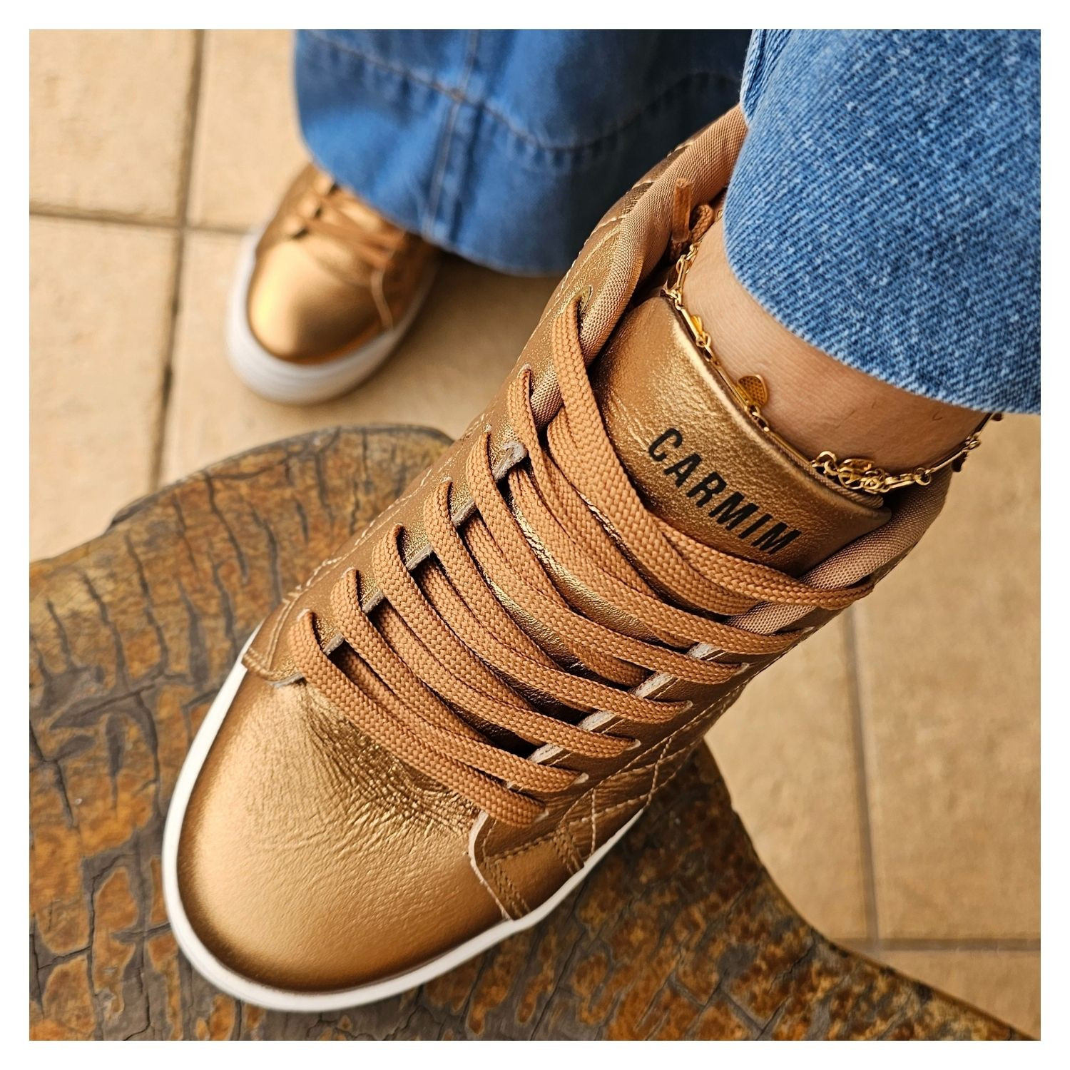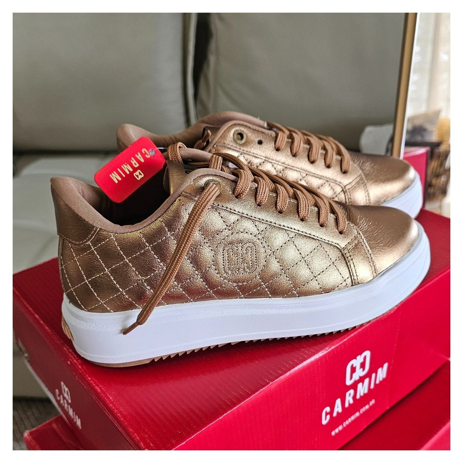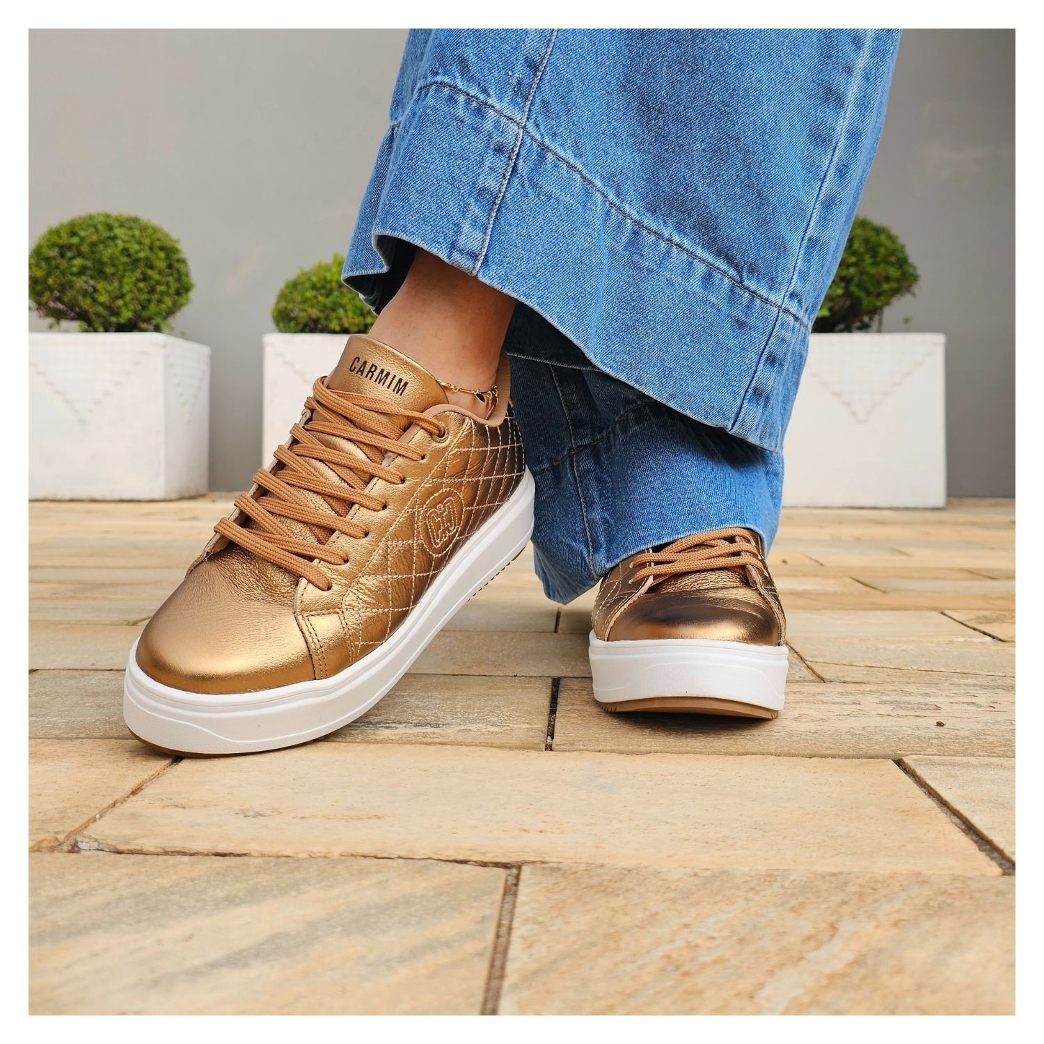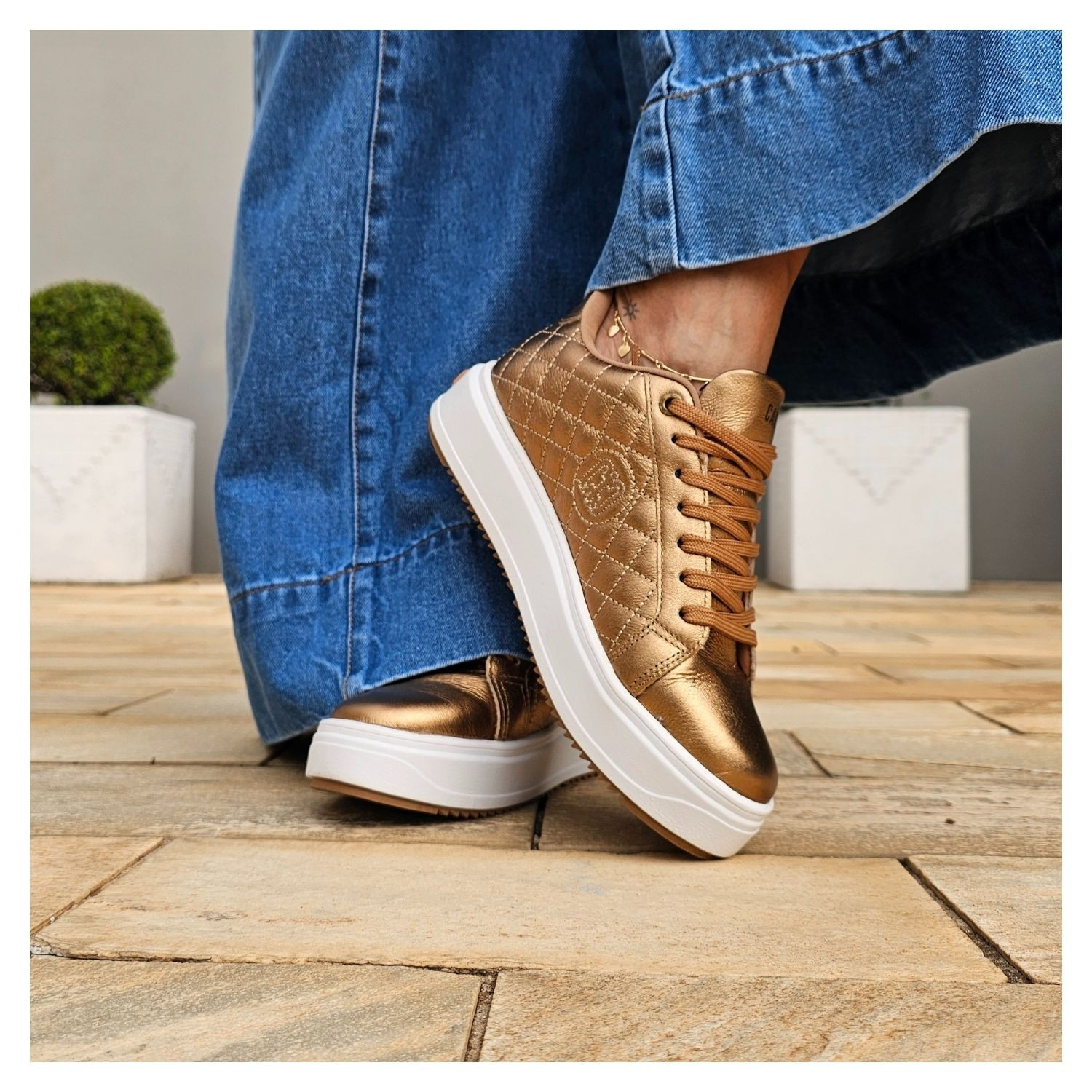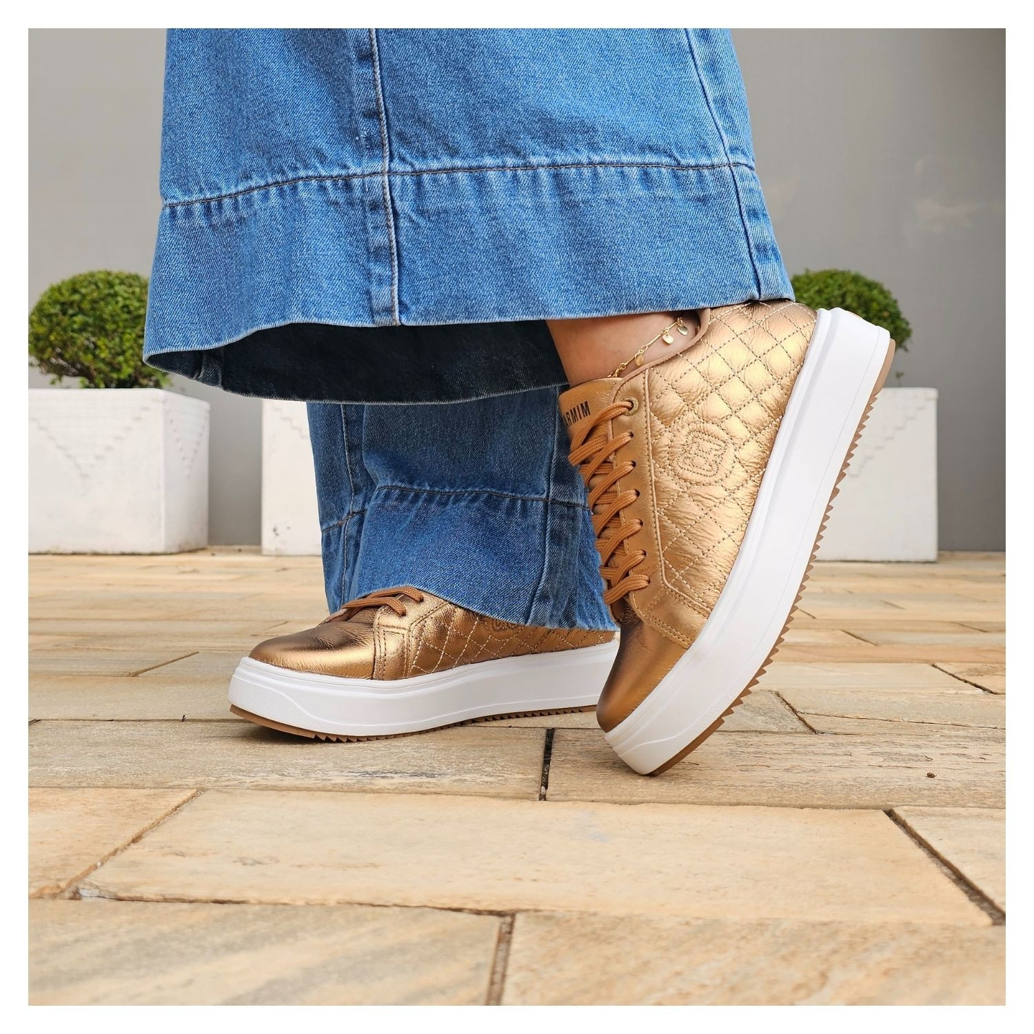 Tênis Helen Carmim, Couro Matelasse Bronze Metalizado, Sola Branca com Cadarço.