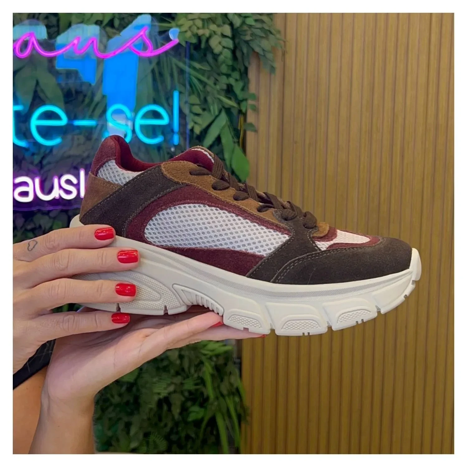 Tênis Tecido Telado e Detalhes em Nobuck Marrom, Caramelo e Bordô, Cadarço e Sola Alta Emborrachada.