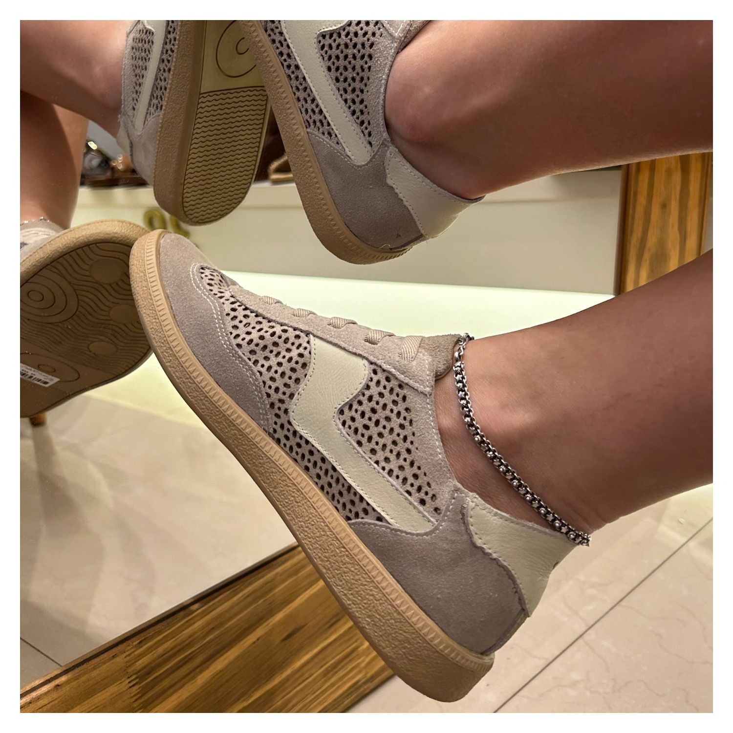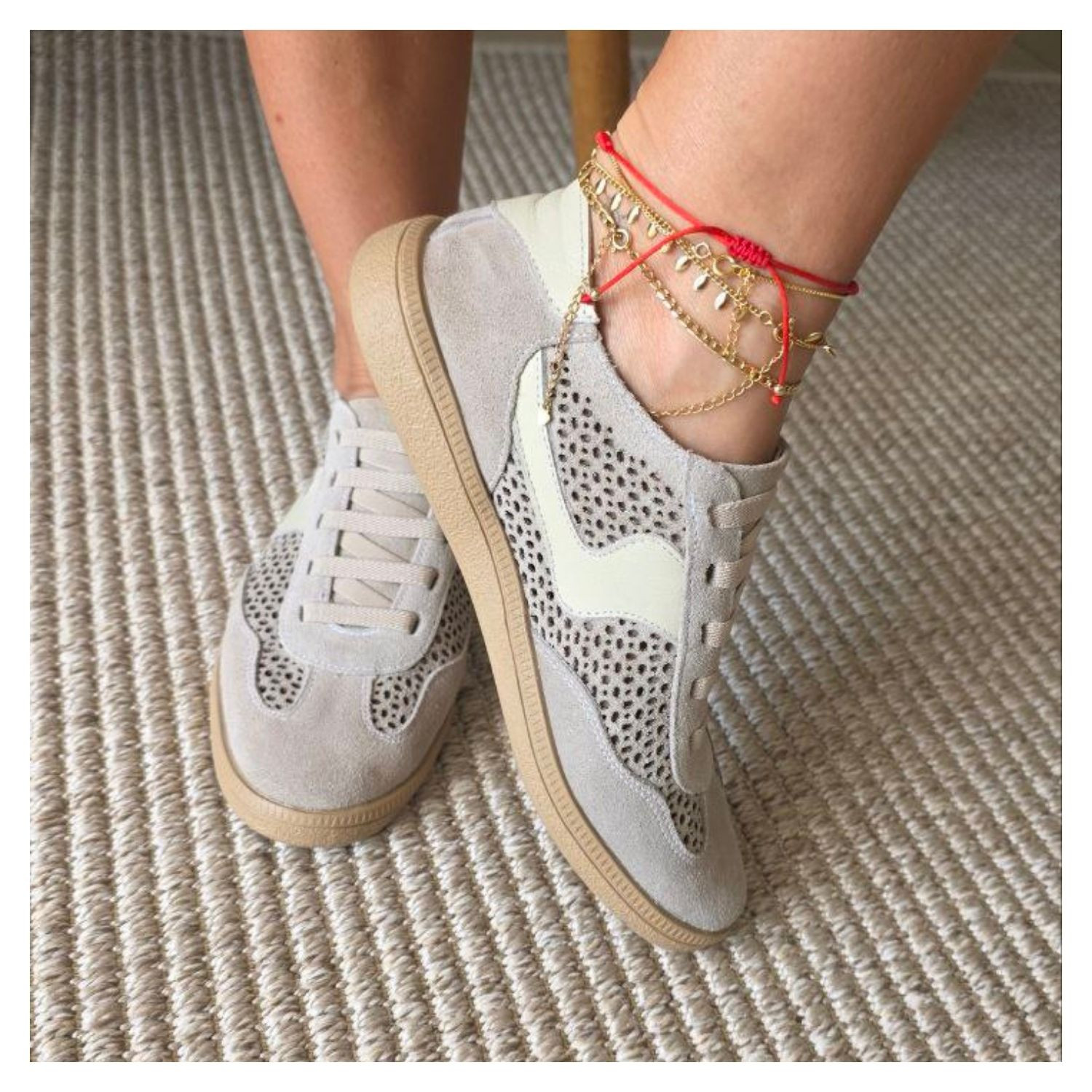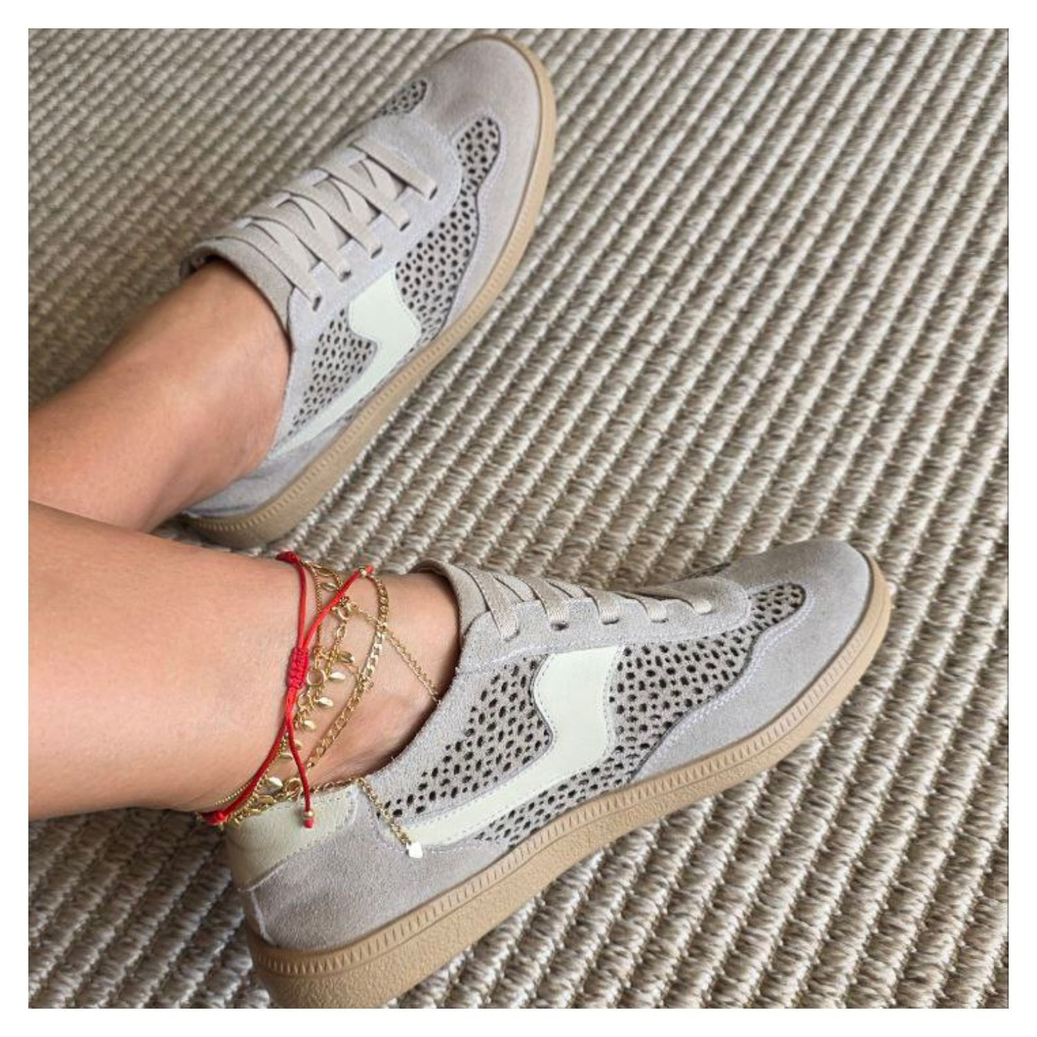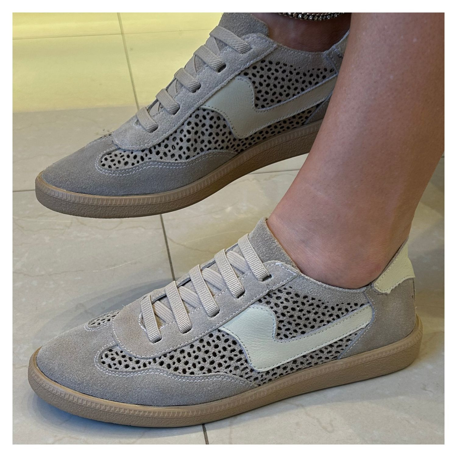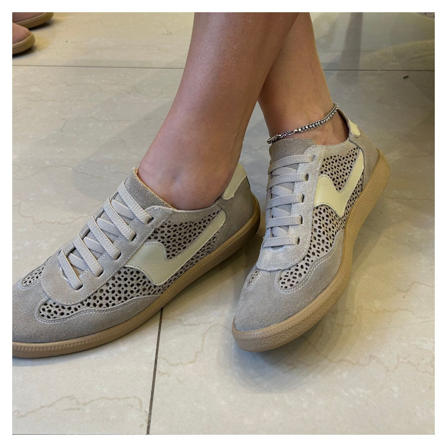 Tenis em Nobuck Cinza Com Furinhos, Detalhe em Couro Branco, Bico Redondo e Cadarço Elastico.