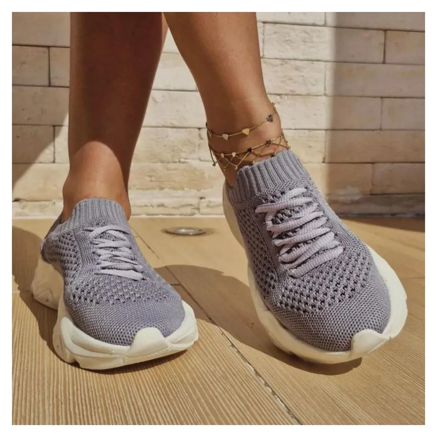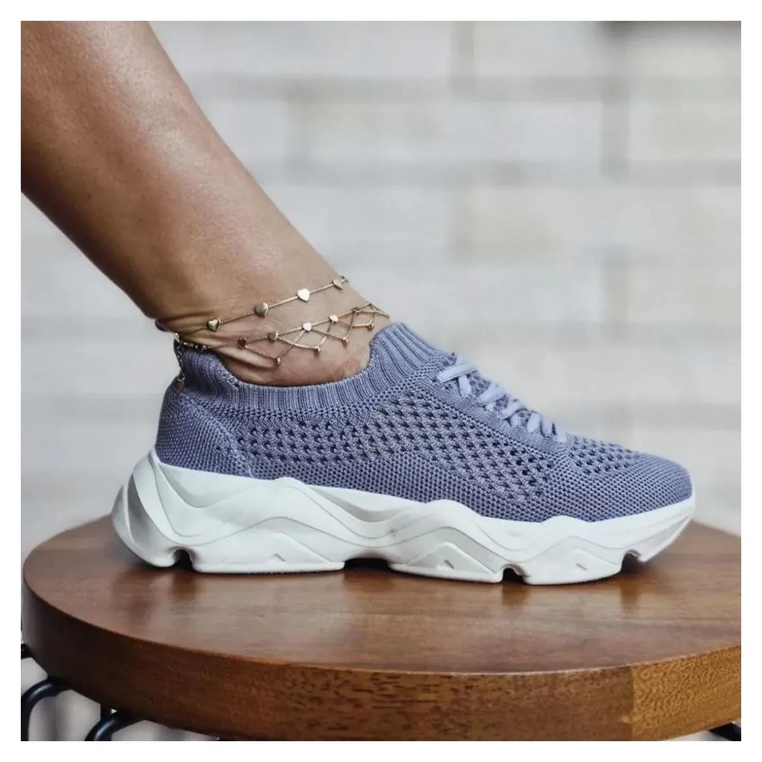 Tenis Knit Com Sola Alta Emborrachada Branca Texturizada.