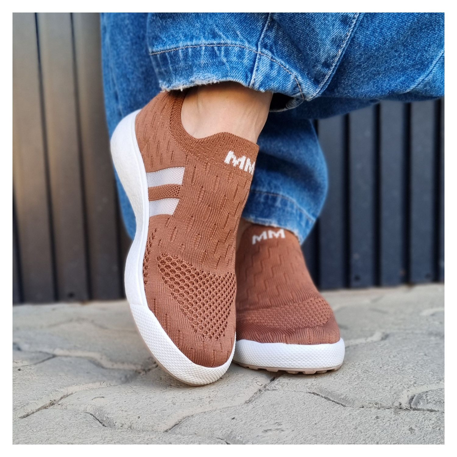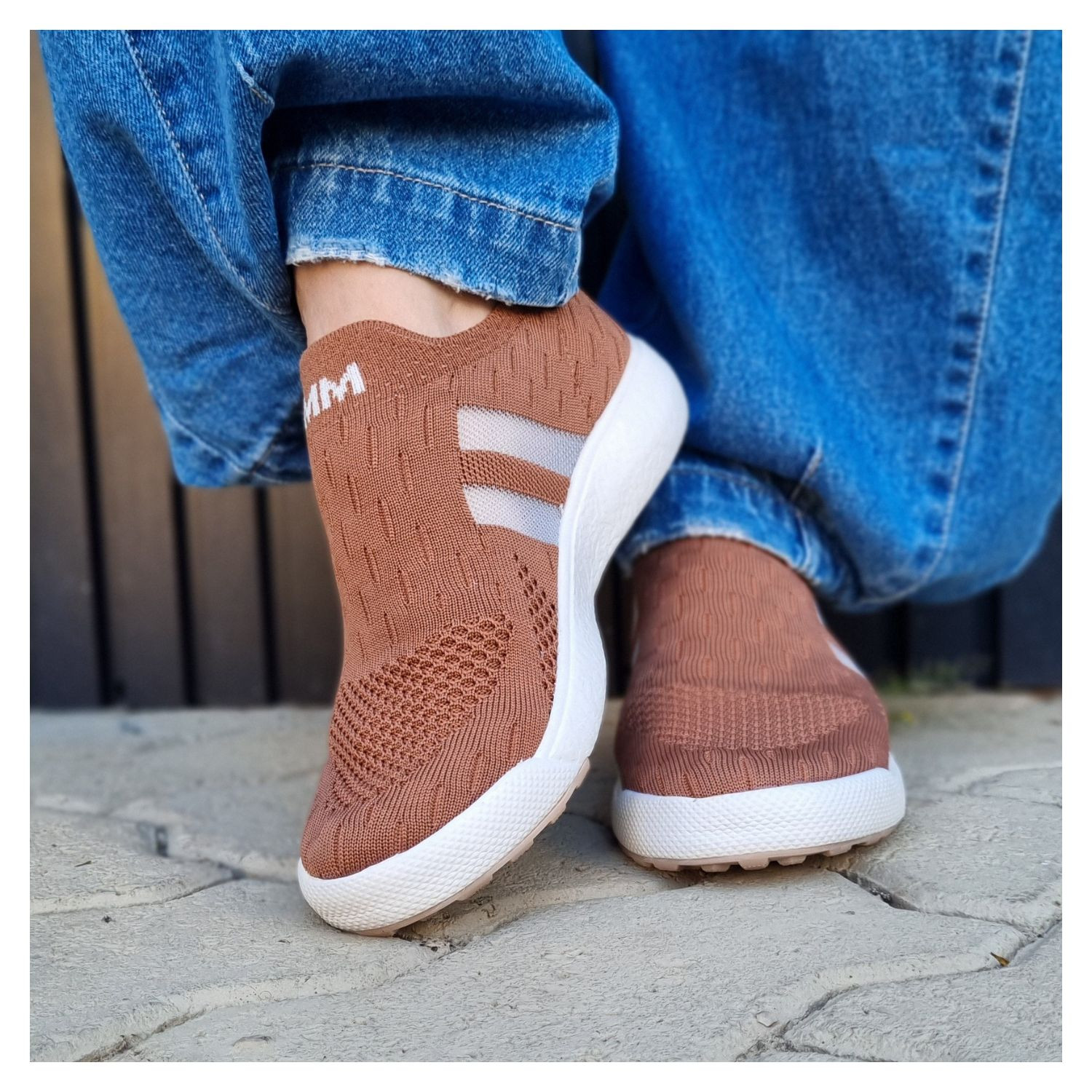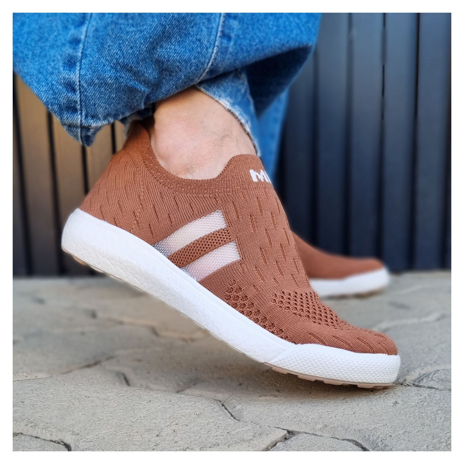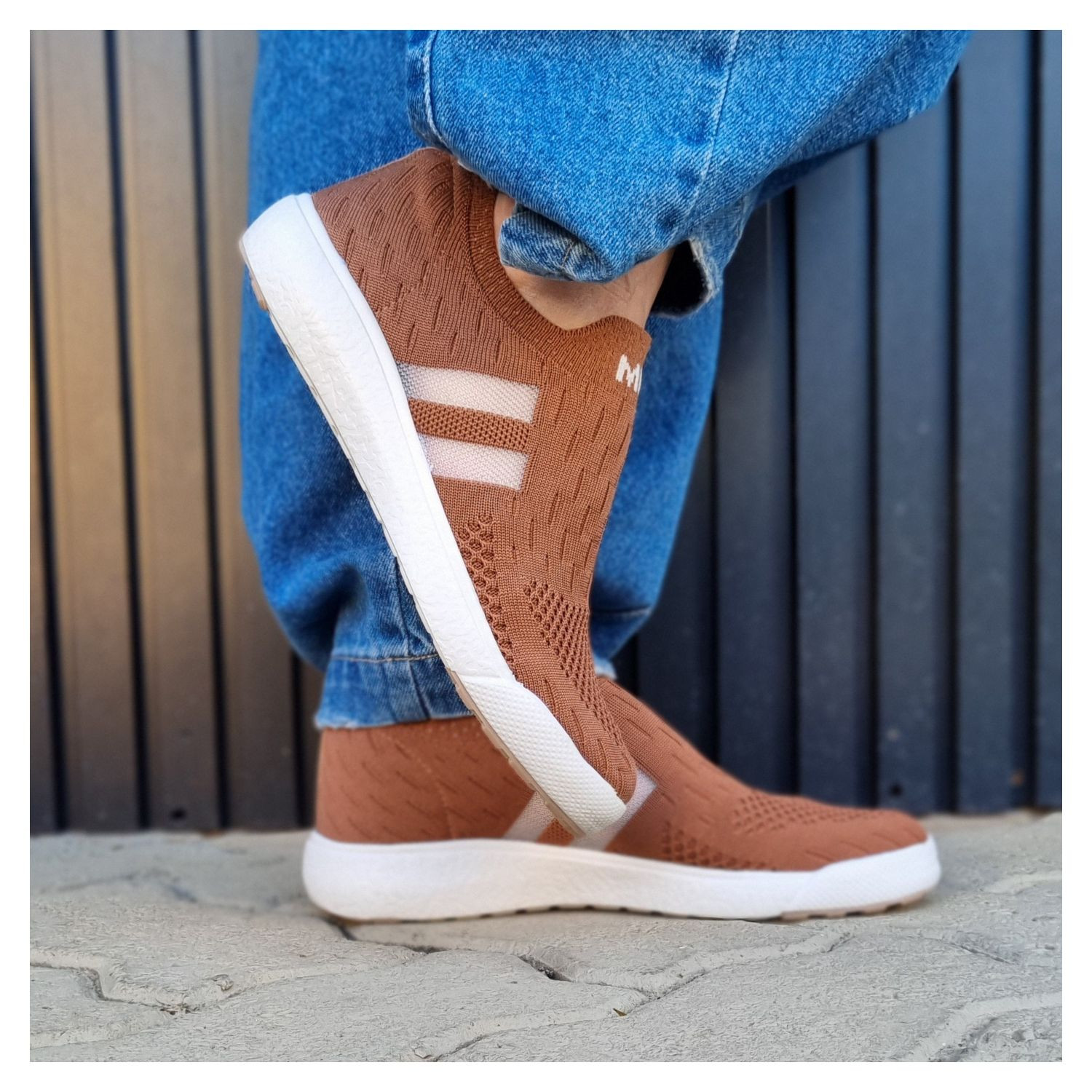 Tênis Knit Caramelo Sem Cadarço, Listras e Logo Branco, Sola Alta Emborrachada Branca.