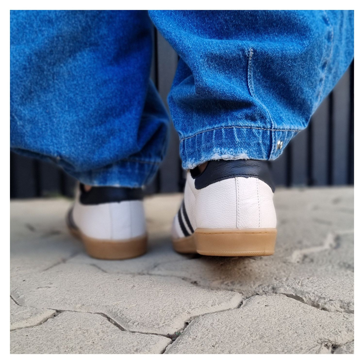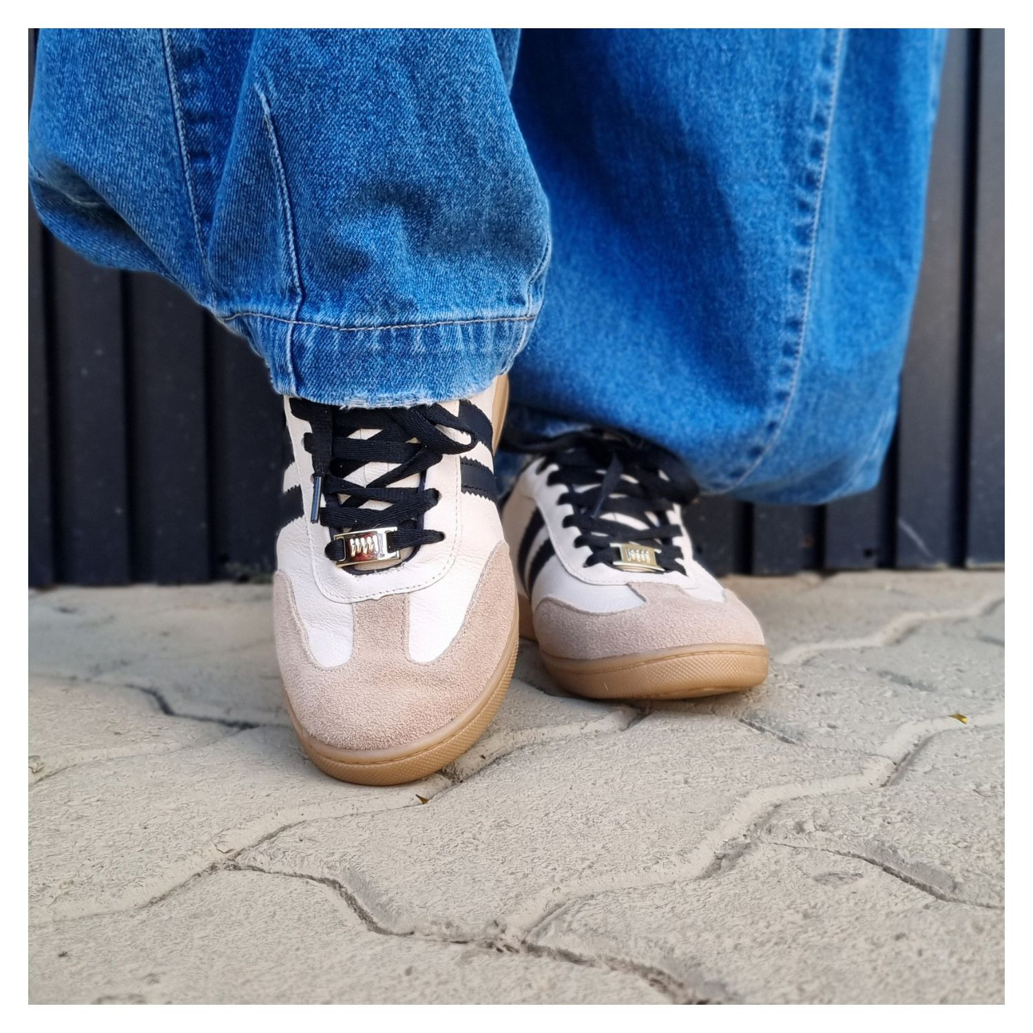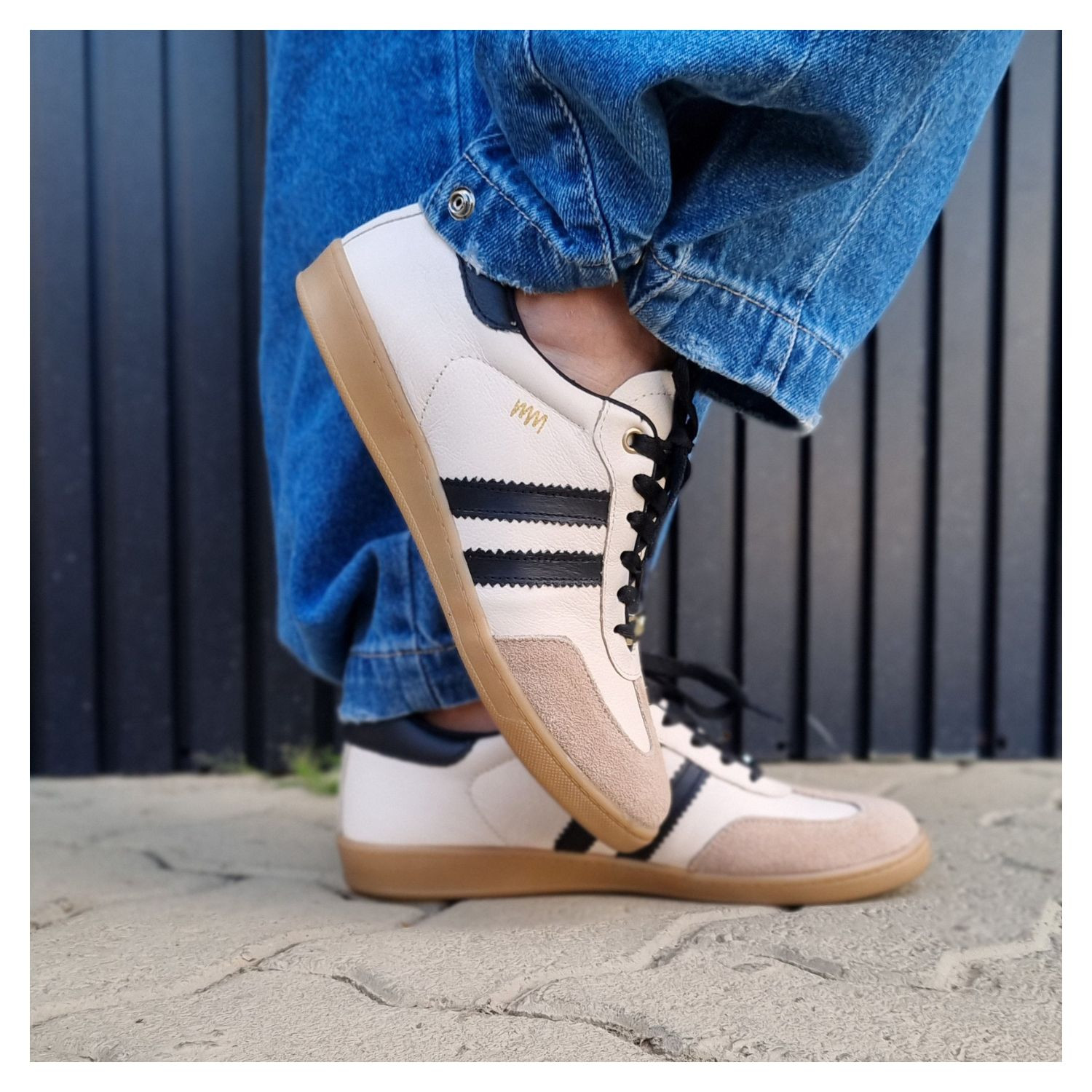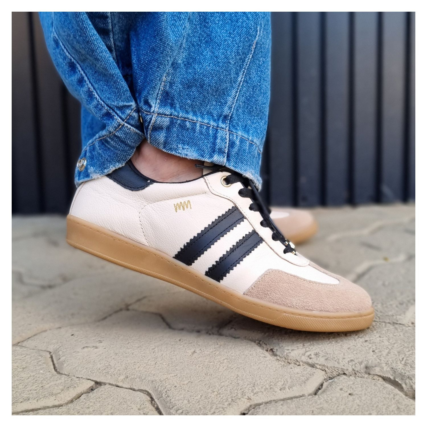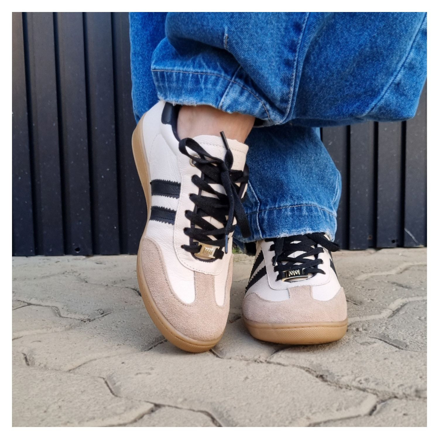 Tênis Couro Bege Duas Listras Pretas, Cadarço Preto, Nobuck na Ponta.