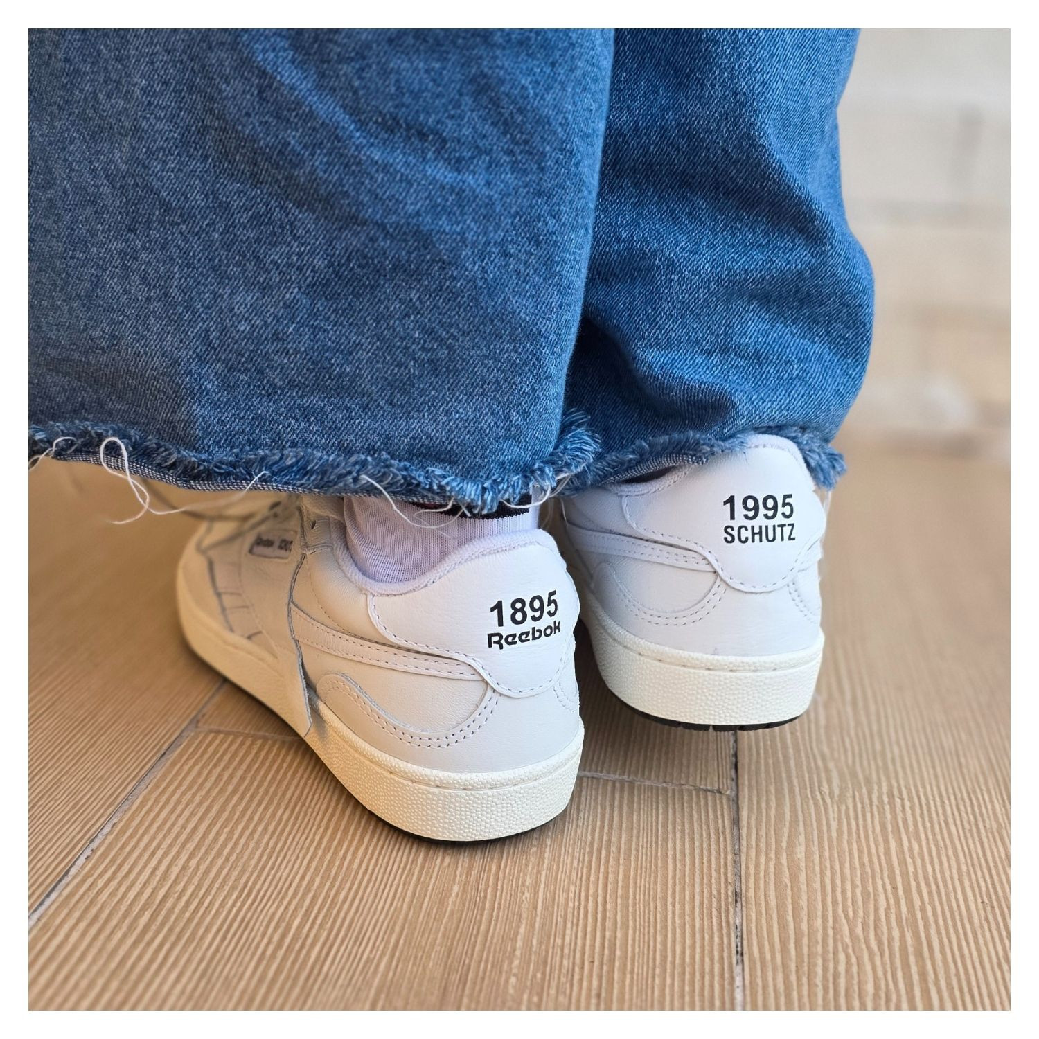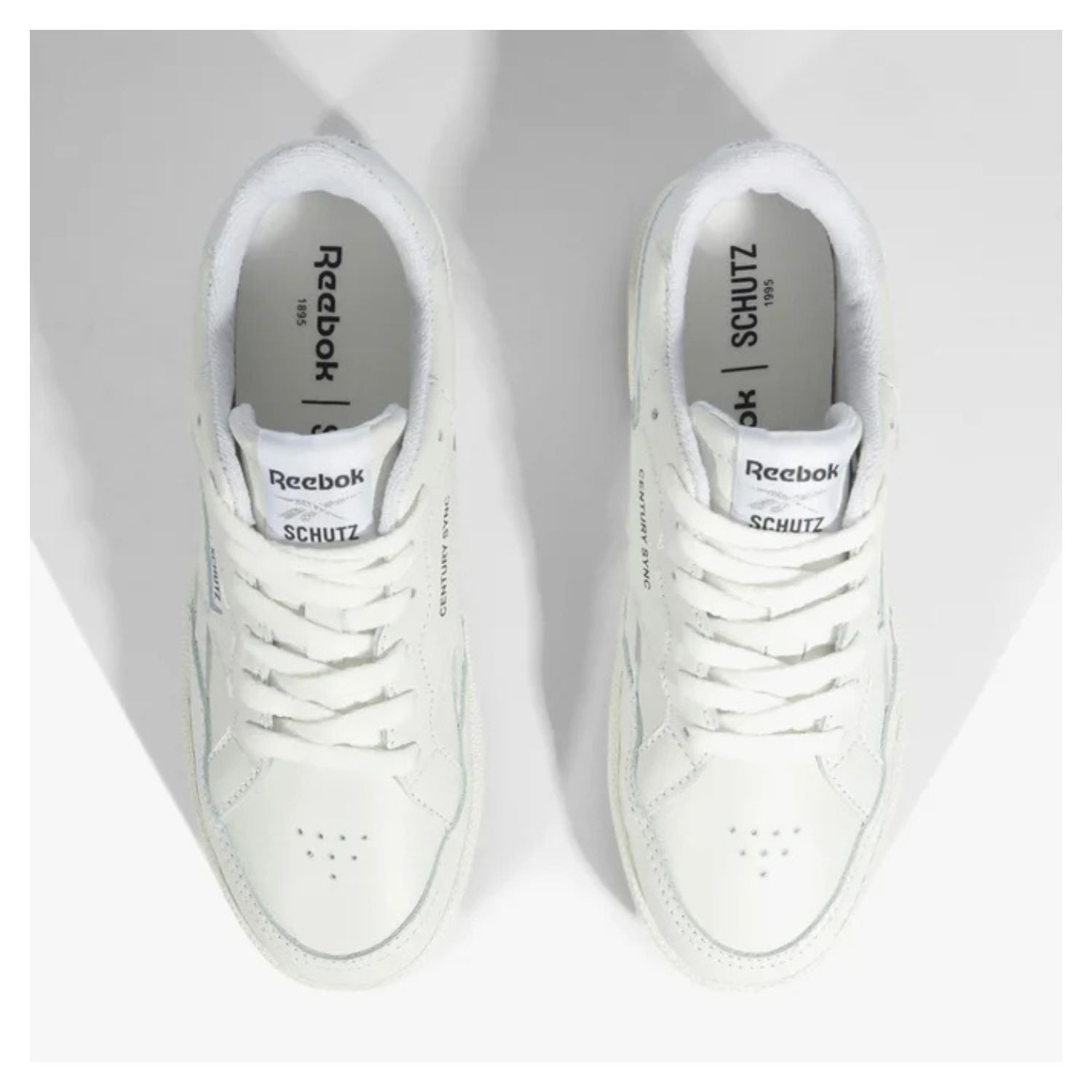 Tênis Reebok + Schutz em Couro Total White, Detalhes Logo e Escrita, Sola Preta Emborrachada.