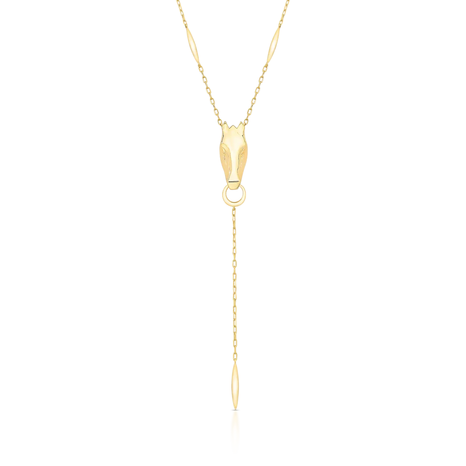 Colar gravata banhado a ouro com pingente de cavalo vazado em design liso e curvo. A malha de elos ovais oferece um acabamento sofisticado, perfeito para compor looks elegantes com um toque de personalidade.