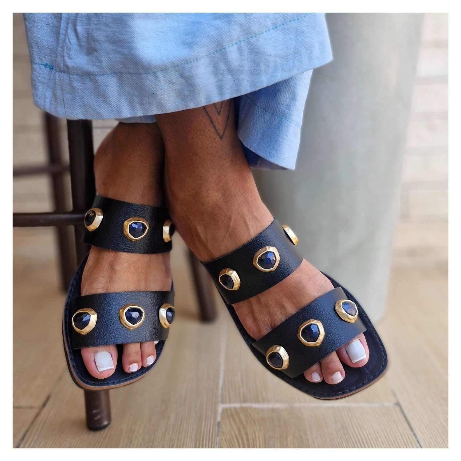 Rasteira Duas Tiras Largas Preto Com Pedras na Tira e Bordas Douradas.