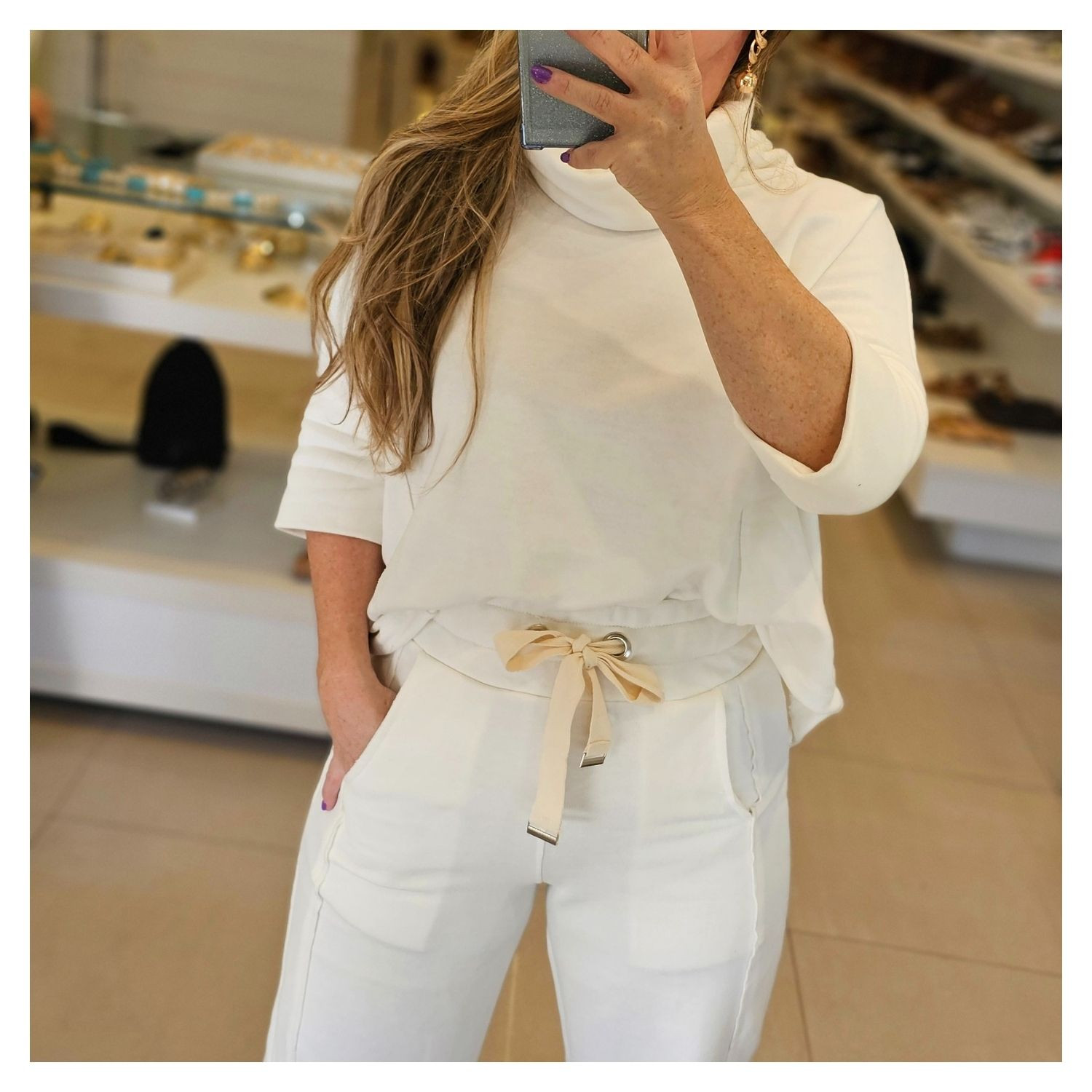 Conjunto De Moletinho Off White Liso, Blusa Manga 3/4 Com Gola E Calça Pantalona Com Cós Regulável E Bolsos.