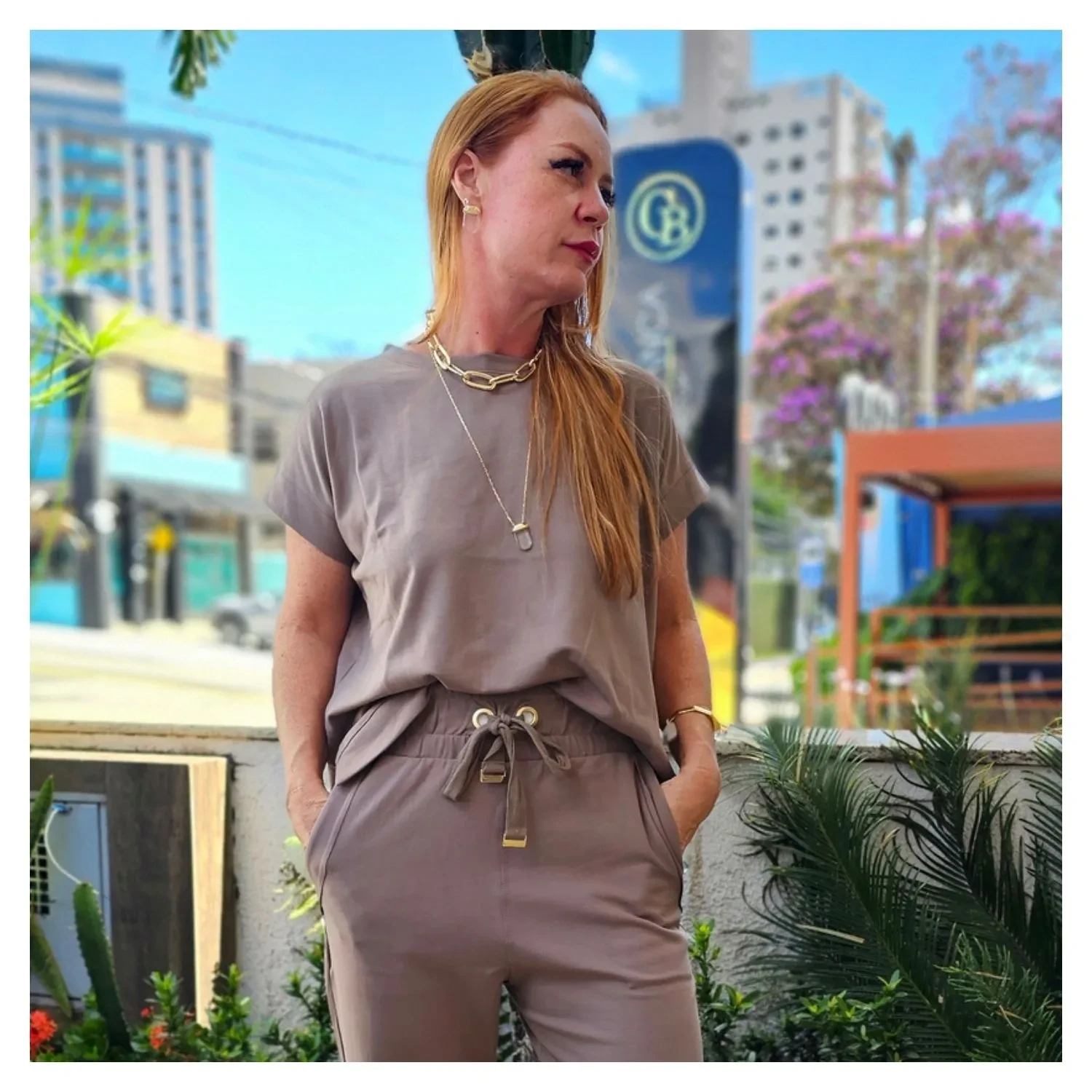 Conjunto em Malha Blusa Muscle Tee e Calça Jogger Lisa, Ajuste Amarração Cintura Com Elastico Cor Fendi.