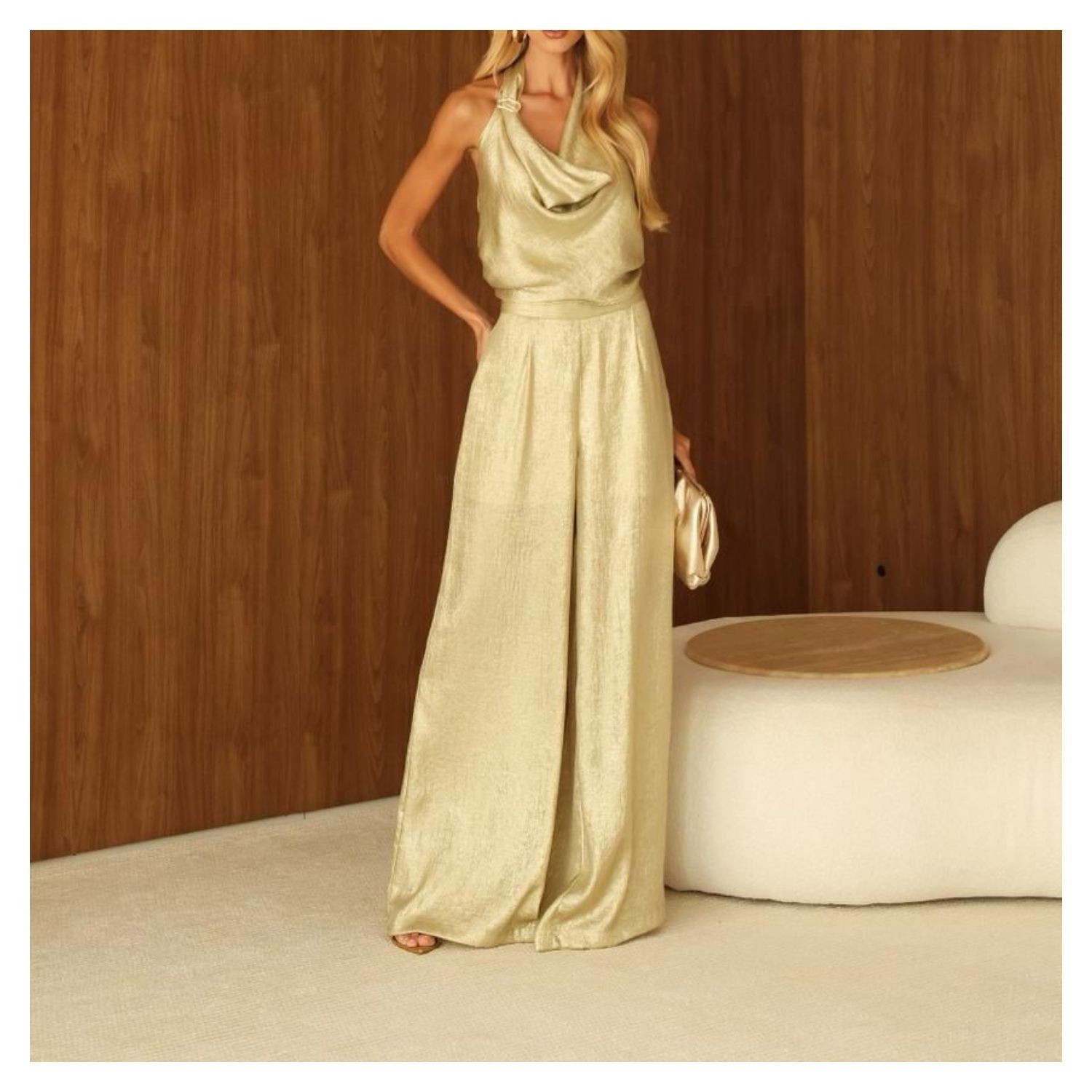 Calça Pantalona em Lurex Dourado Glow, Ziper Lateral Tira Amarração.