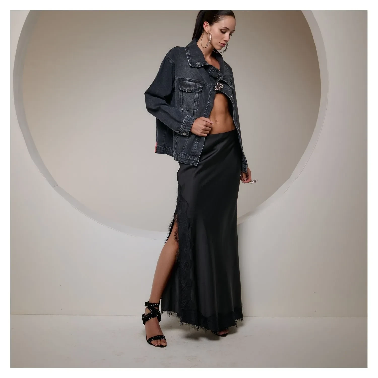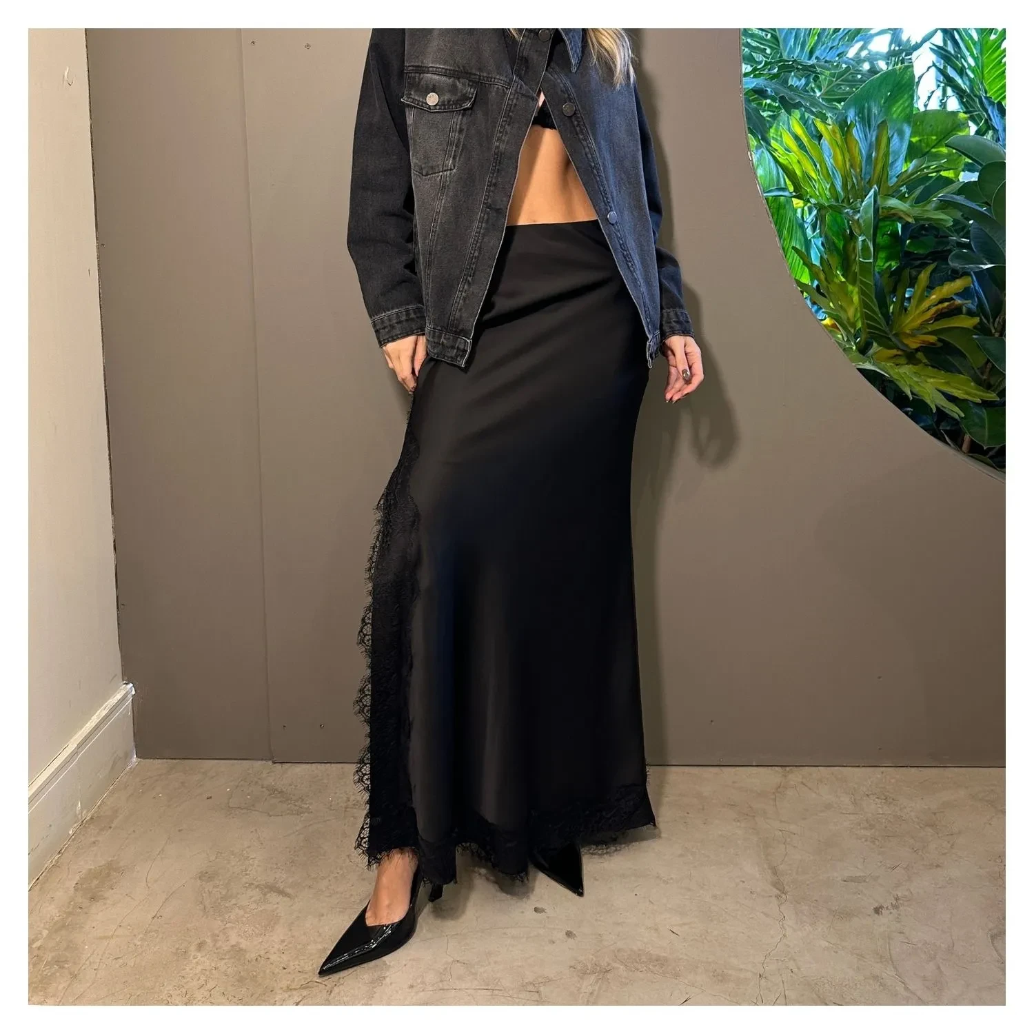 Saia de Cetim Preta Longa, Com Fenda, Vies e Renda, Fechamento por Ziper na Lateral.