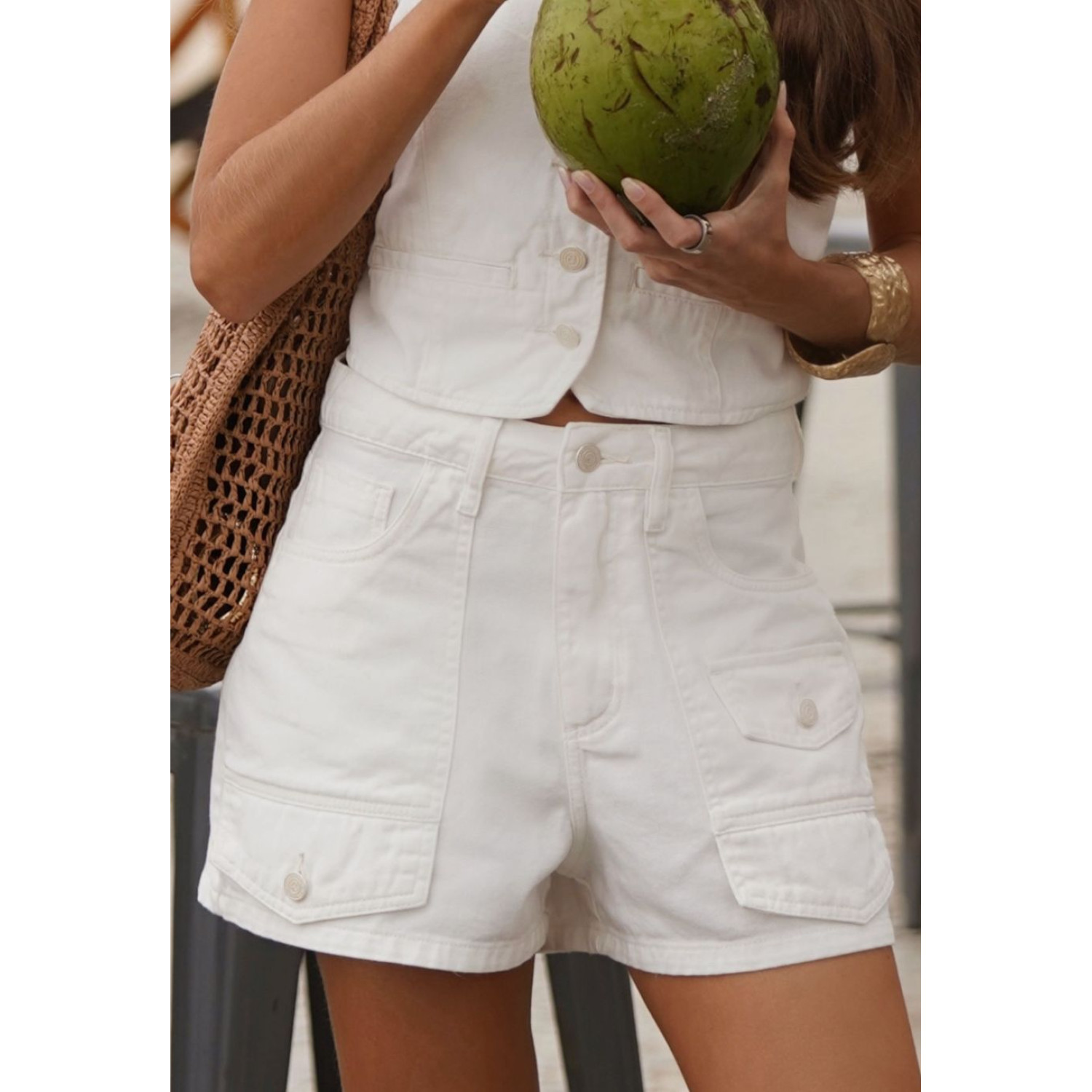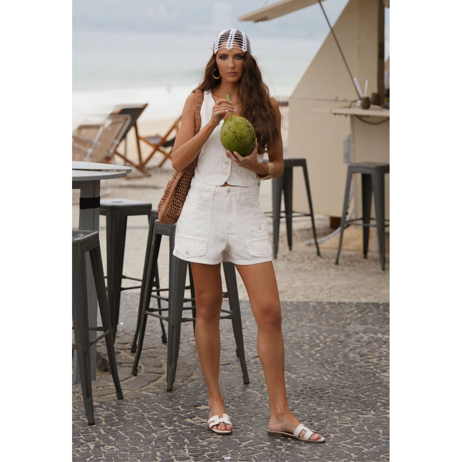 Shorts Jeans Off White, Bolsos Cargo na Frente, Atras Liso.