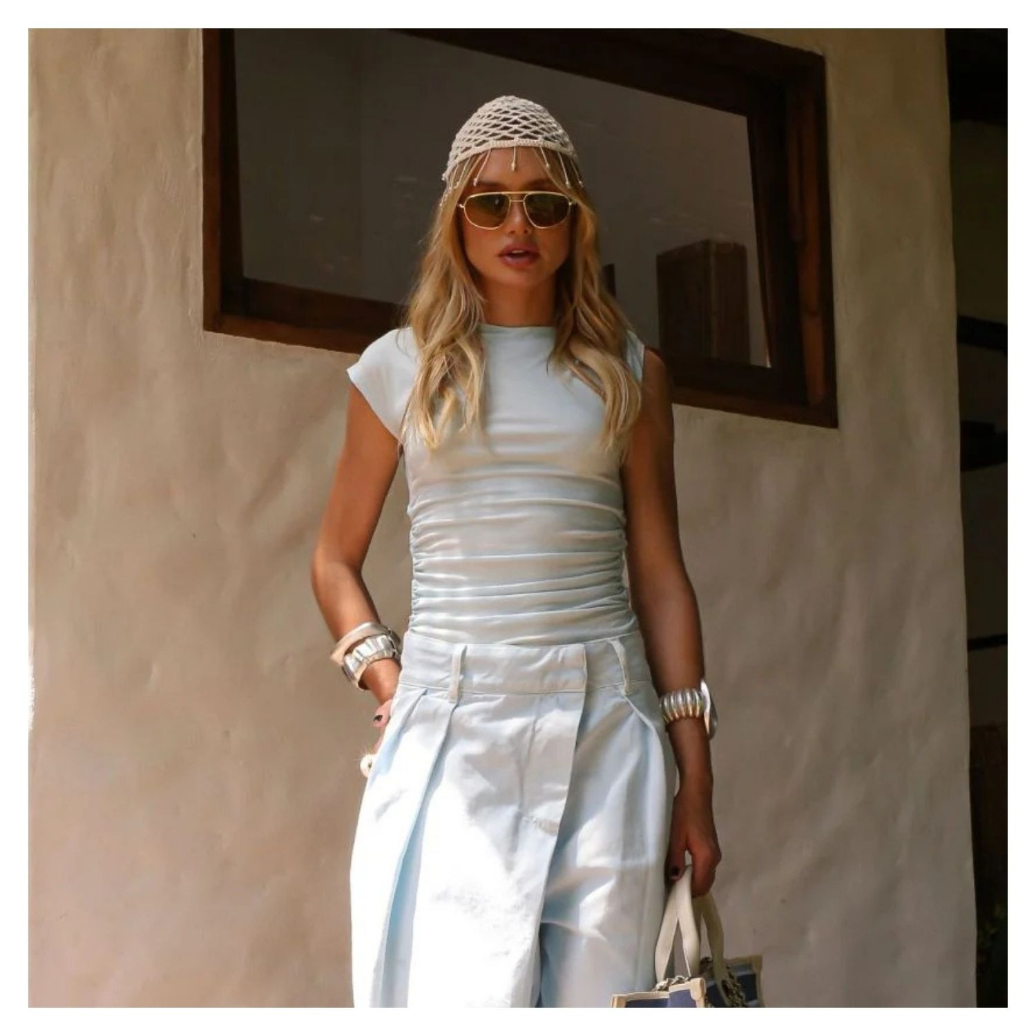 Blusa em Malha Lisa Drapeada Na Lateral, Um Ombro Com Forma Organica Dourada. Cor Azul Claro.