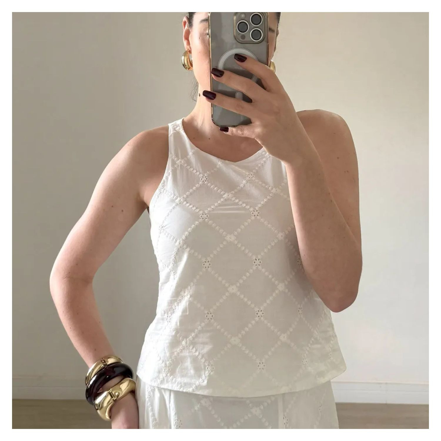 Blusa Regata Off White Toda Bordada Flores, Recorte Reto.