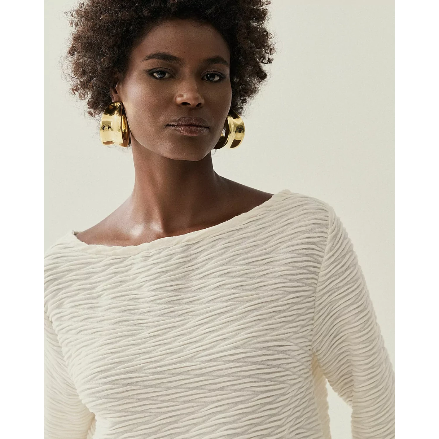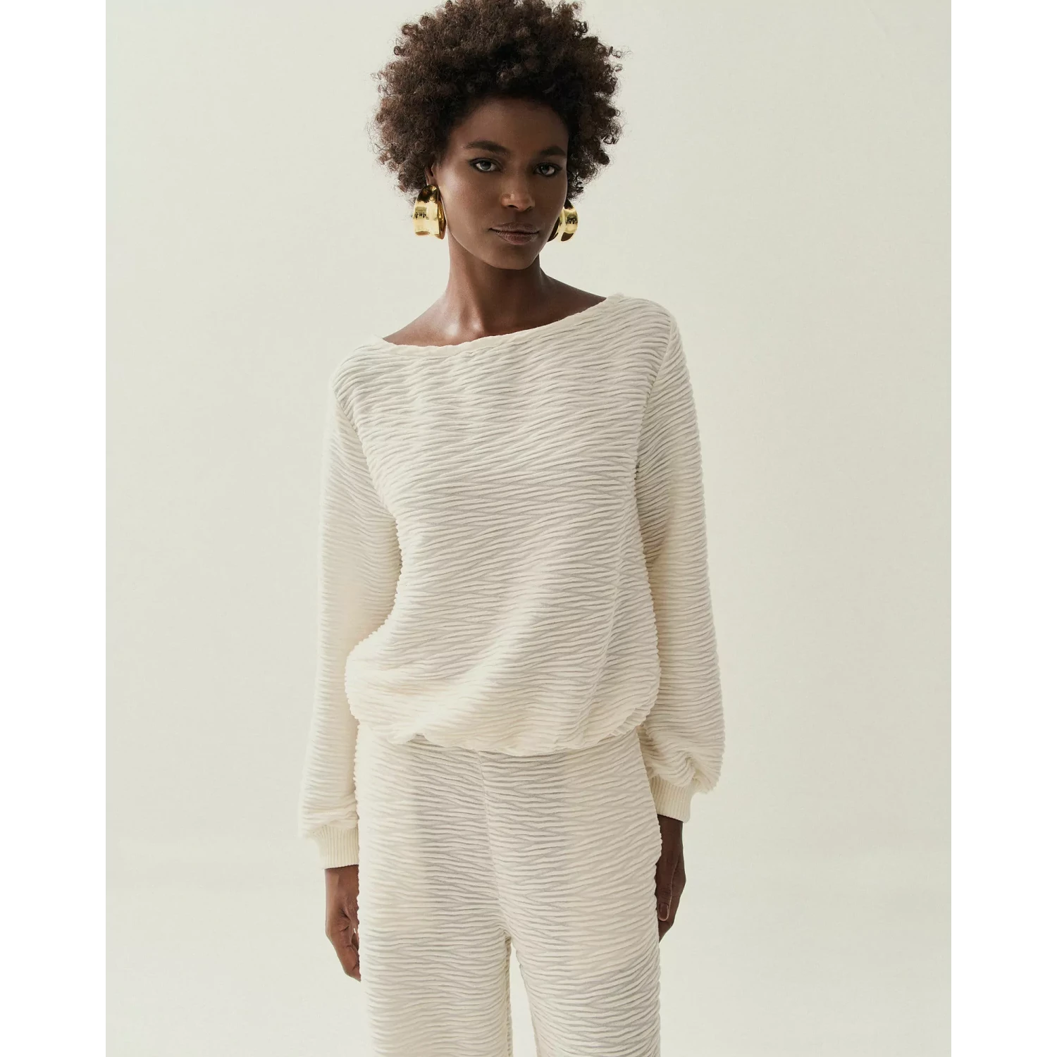 Blusa ampla de design contemporâneo, com modelagem balonê que valoriza o volume e cria um caimento sofisticado e fluido. Confeccionada em malha texturizada, a peça se destaca pelo toque macio e pelo efeito visual tridimensional, que adiciona profundidade e elegância ao look. As mangas amplas com punhos ajustados equilibram proporção e conforto, enquanto o shape levemente arredondado proporciona liberdade de movimento sem abrir mão da estrutura. Versátil e atemporal, é uma escolha perfeita para composições modernas, transitando com facilidade entre produções casuais refinadas e propostas mais elaboradas.
