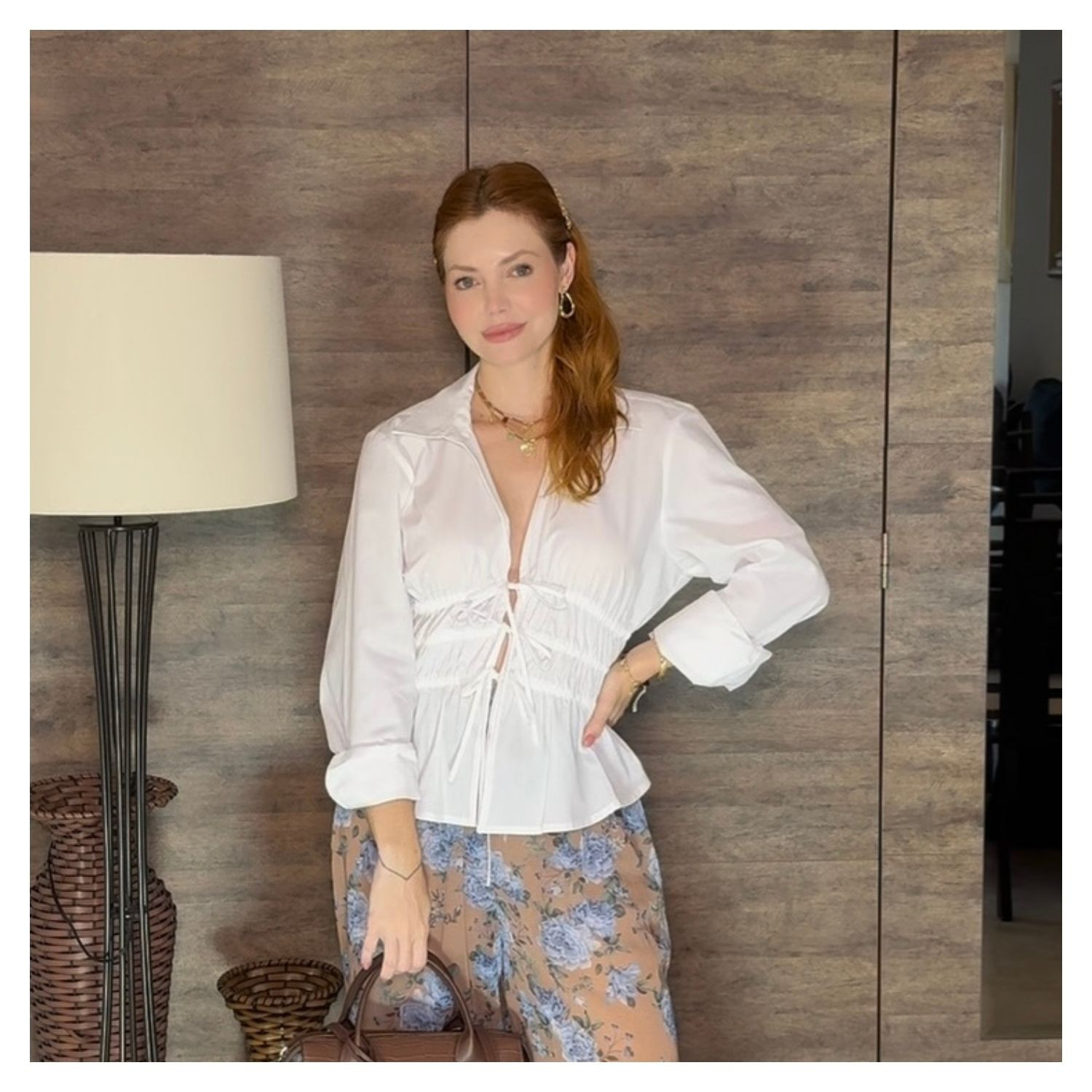Camisa Branca Com Franzidos na Cintura, Manga Com Abertura na Manga De Amarrar.