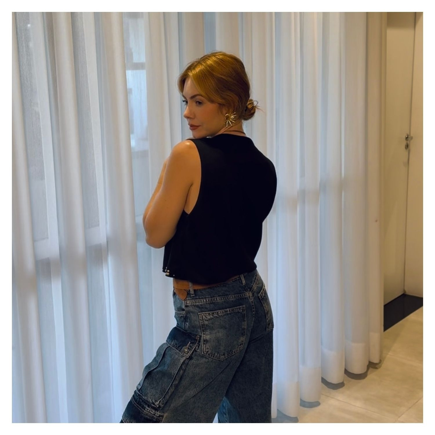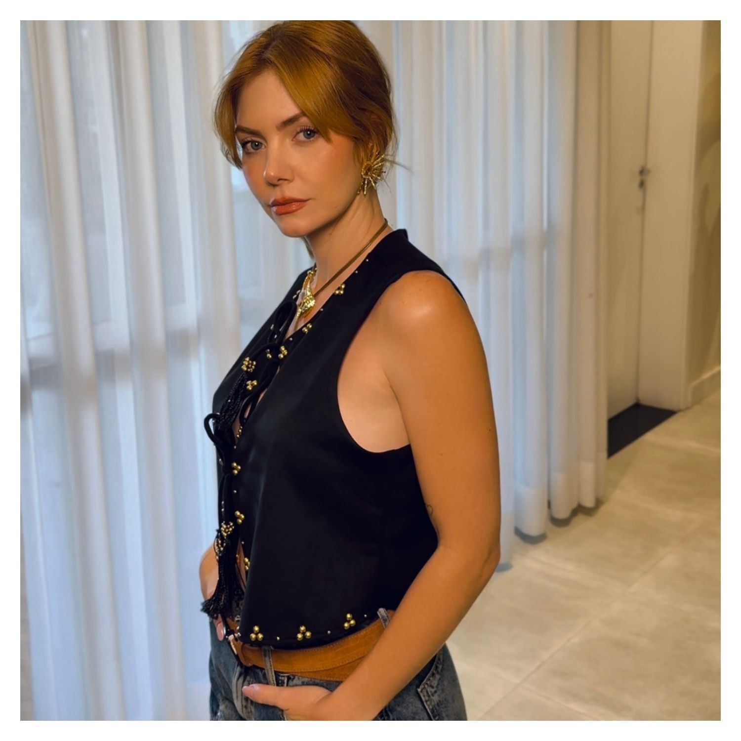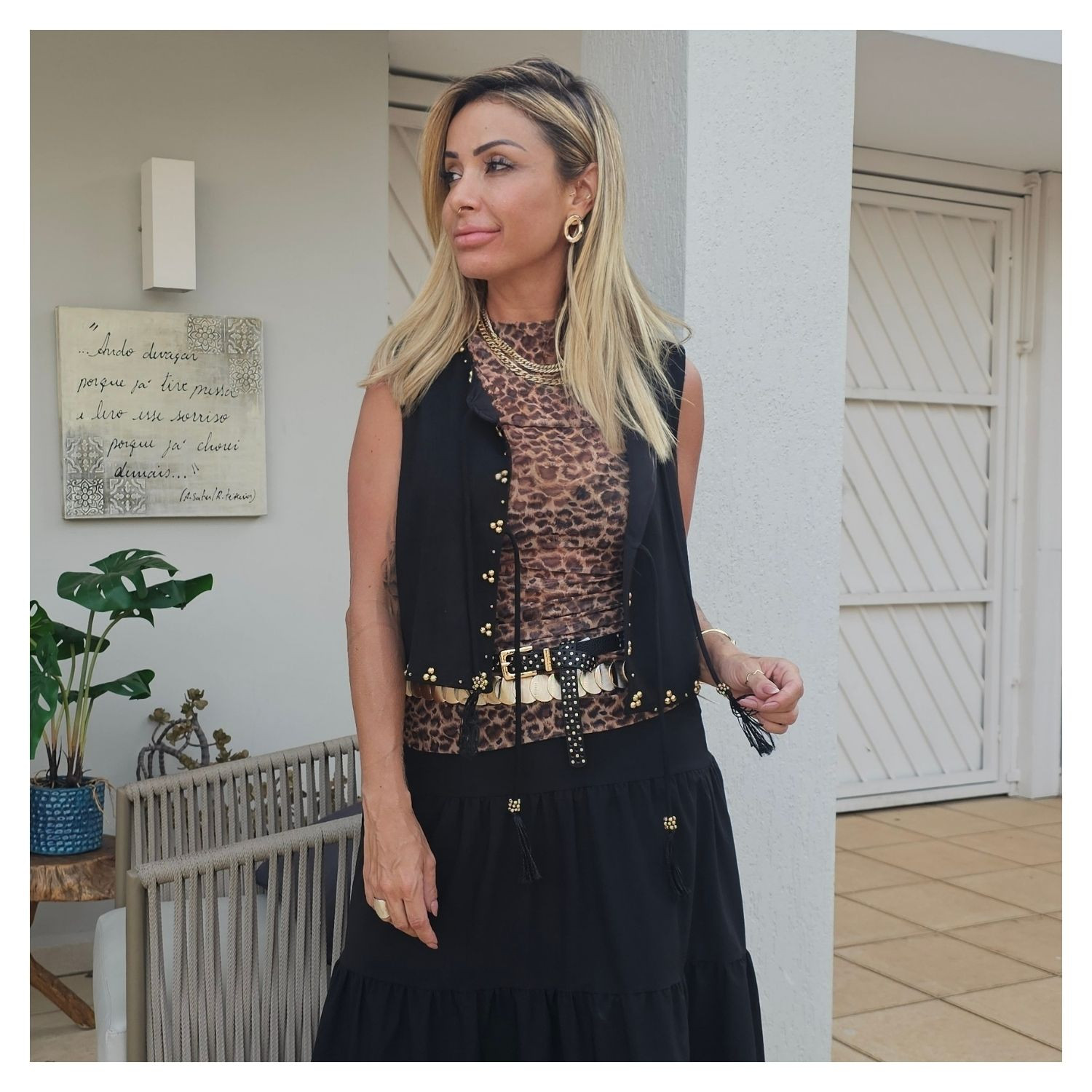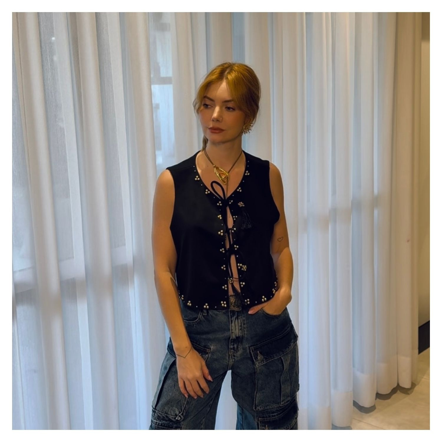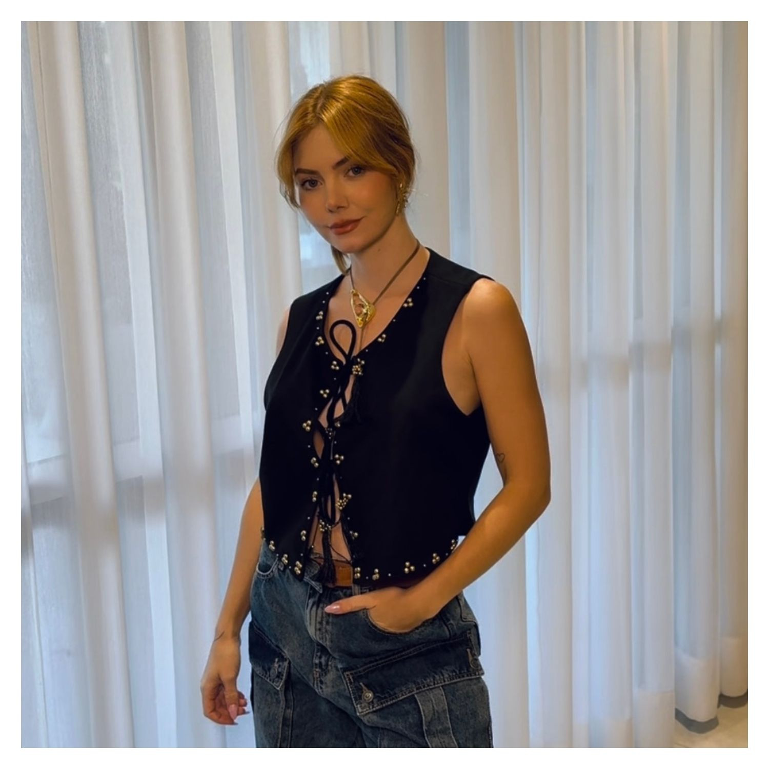Colete em Suede Preto,  Amarração Frontal, Detalhes Aplicação Dourados.