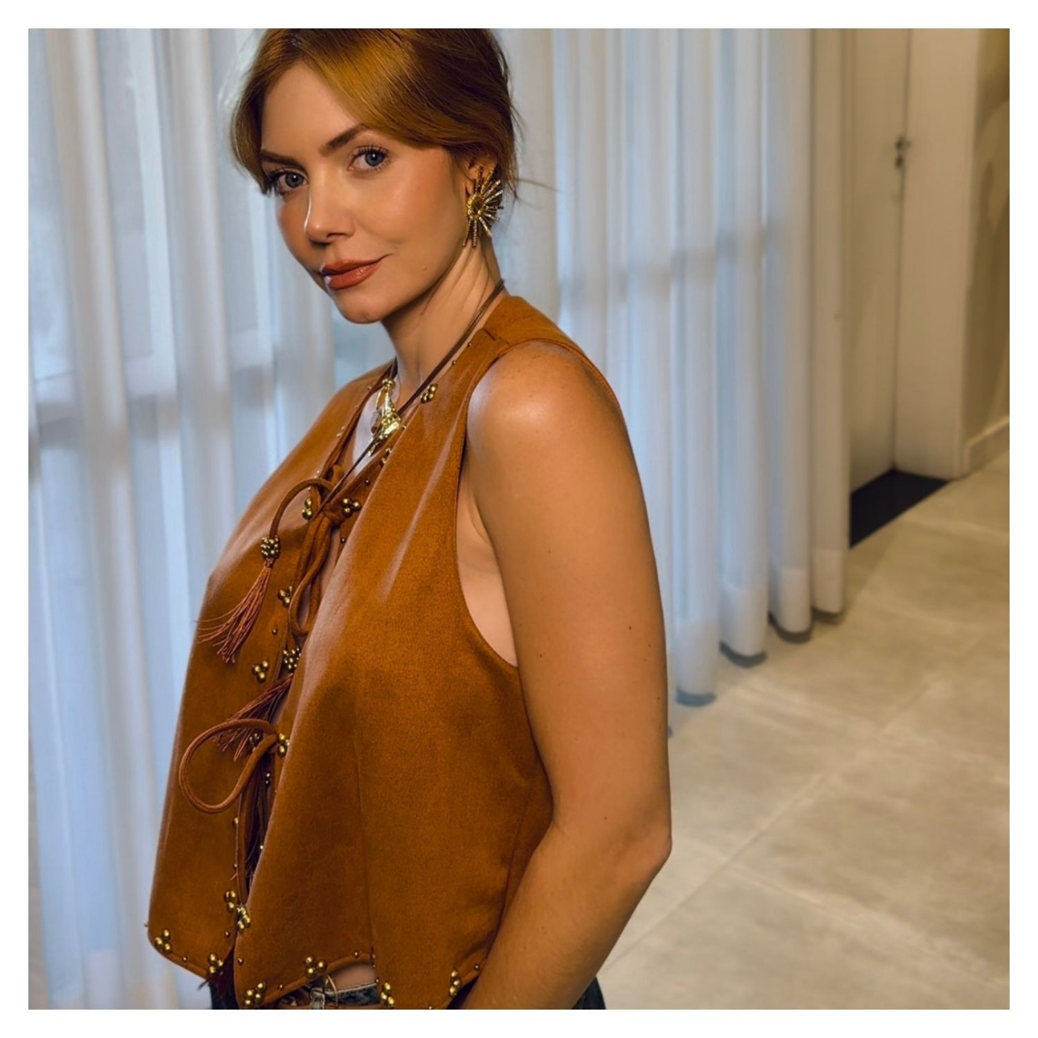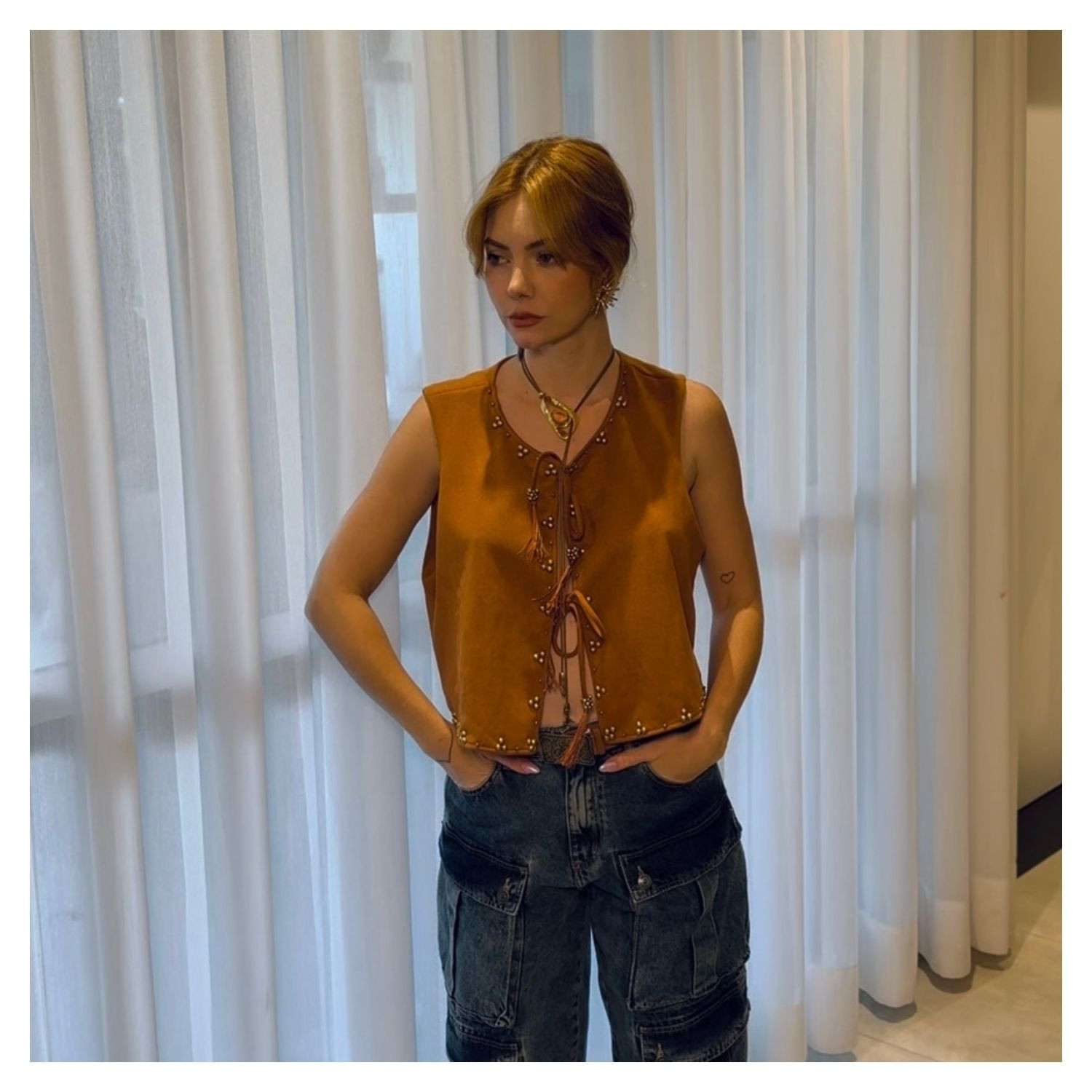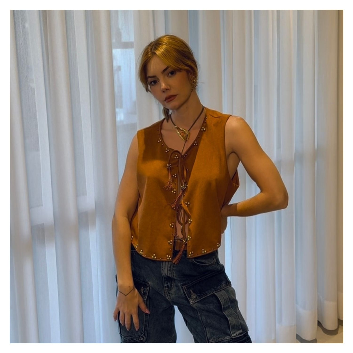 Colete em Suede Caramelo,  Amarração Frontal, Detalhes Aplicação Dourados.