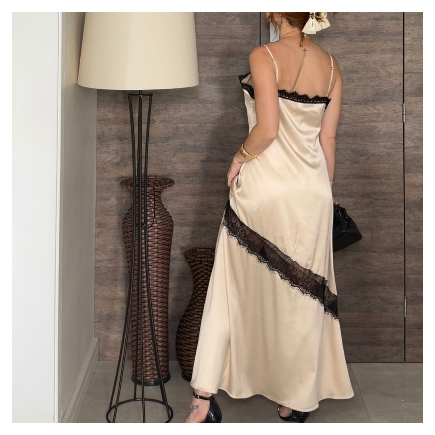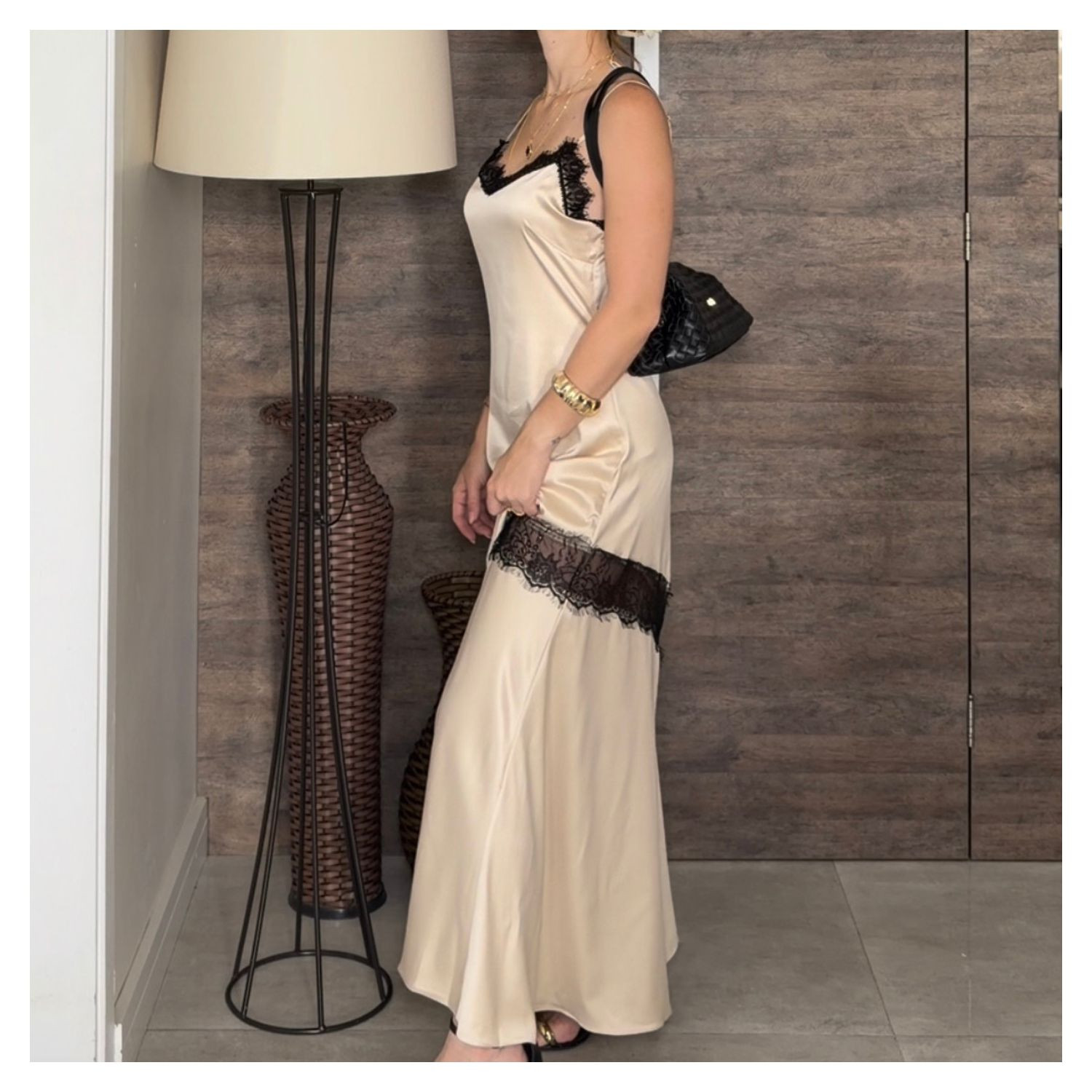 Vestido Longo em Cetim Liso Cor Nude, Alçinha Fina, Detalhes em Renda Preto Diagonal no Meio e Decote.