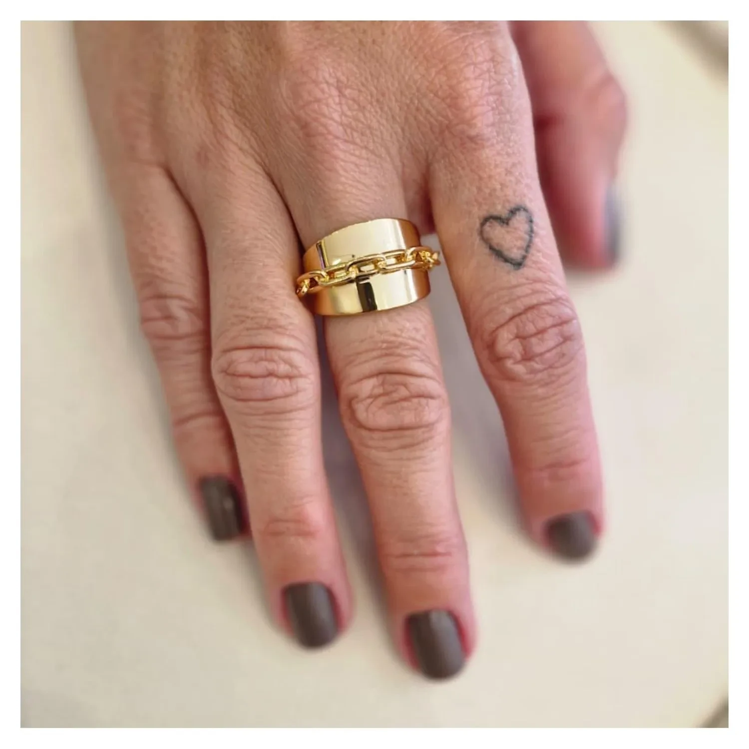 Anel aro largo liso banhado a ouro, com detalhe de elos cartier.Versátil, combina com qualquer estilo, do mais simples ao mais elaborado.