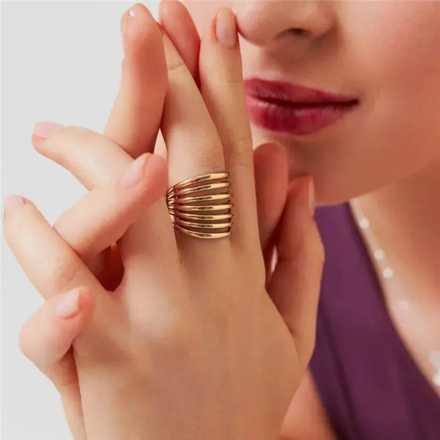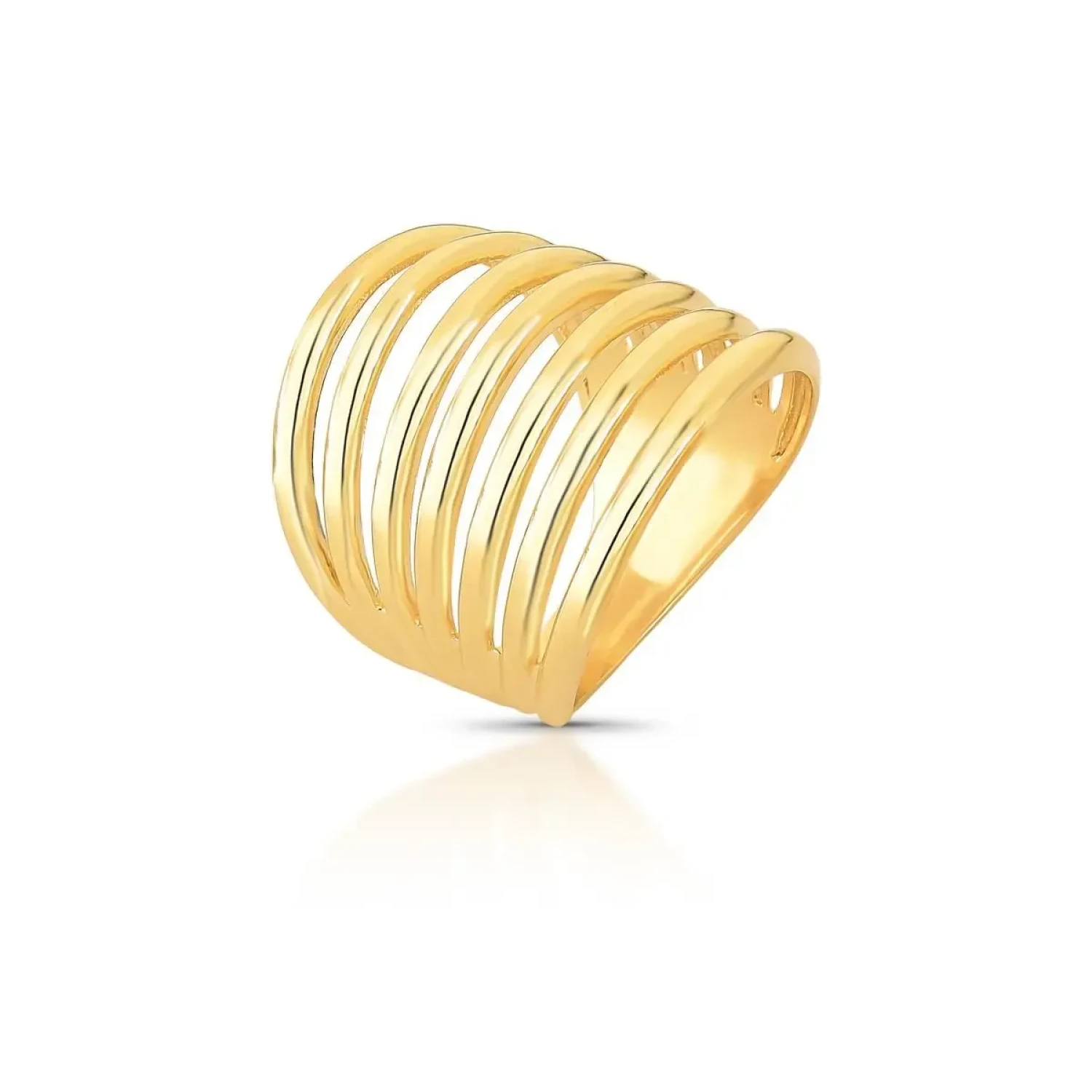 Anel curvo, com sete voltas, liso e vazado banhado a ouro amarelo. Os anéis são indispensáveis quando o assunto é elegância, os modelos delicados são super versáteis e deixam qualquer look um charme, remetem elegância, delicadeza e estilo.