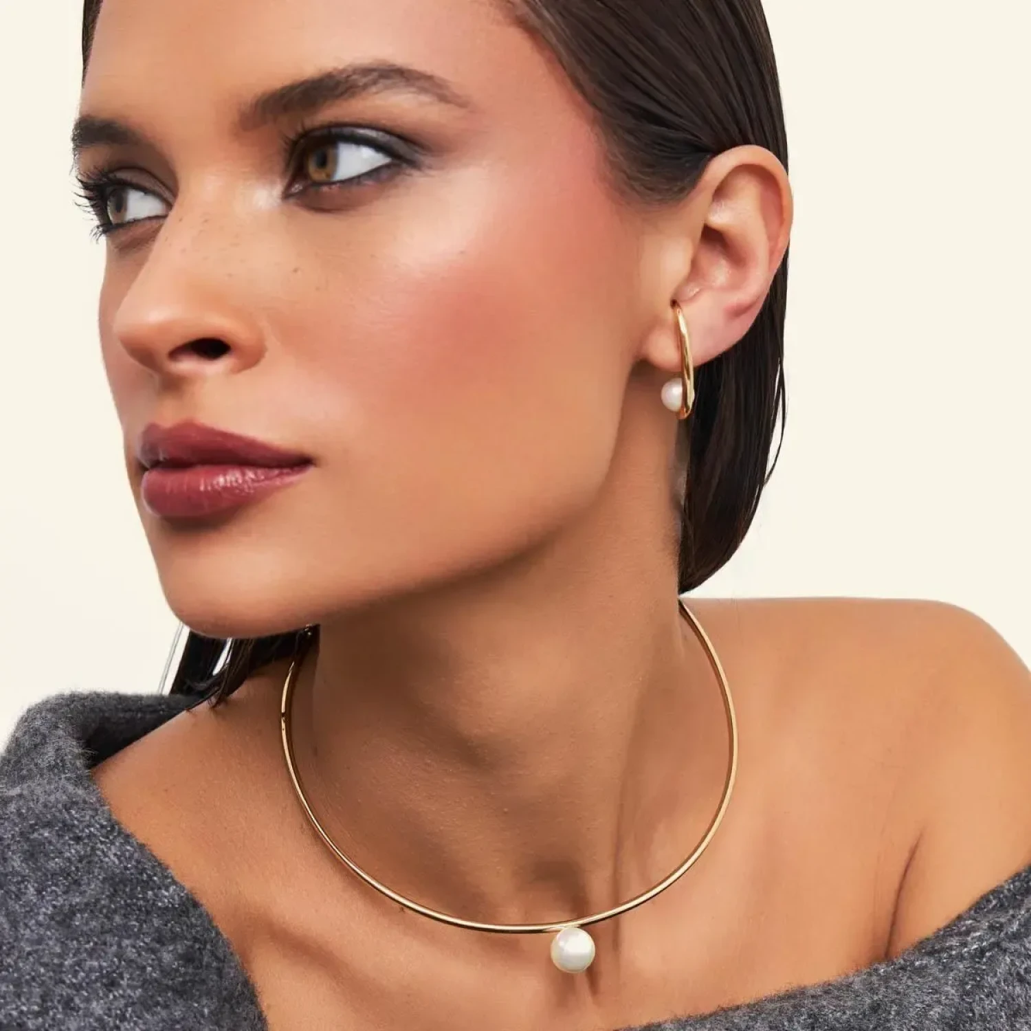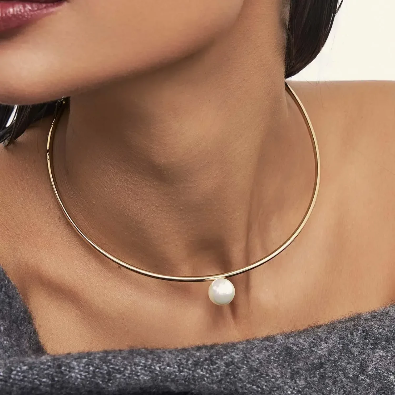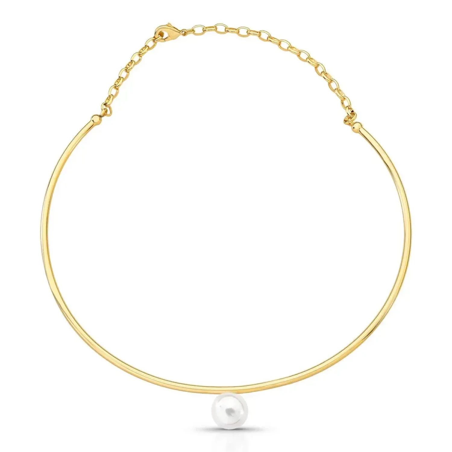 Gargantilha em aro, com pérola shell, banhada a ouro. As pérolas também tem significado e simbolismo importante. Representando o símbolo essencial da feminilidade e pureza.