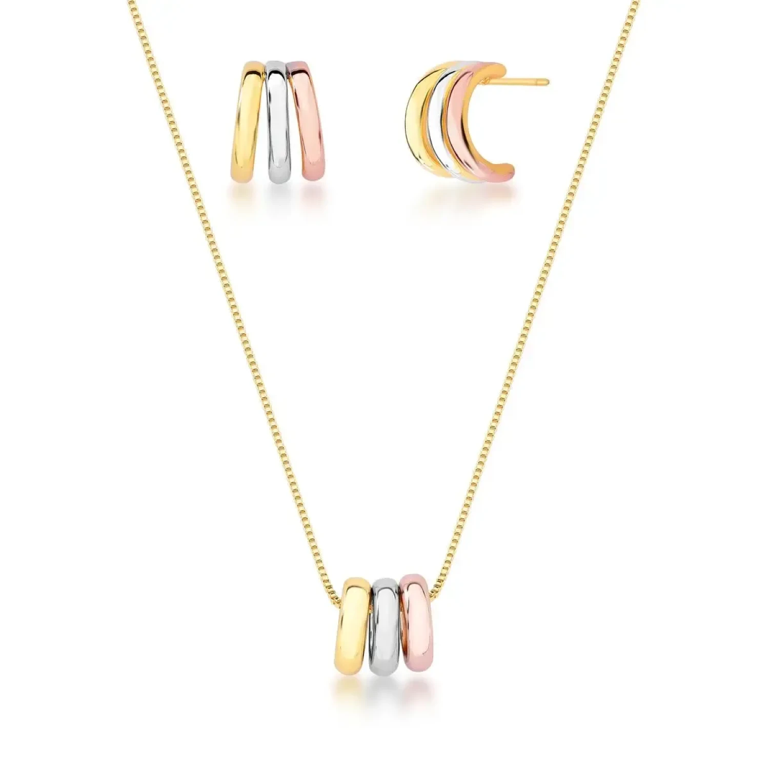 Conjunto banhado em três tons, composto por meia argola com três colunas curvas e colar com pingente liso, formado por três círculos redondos vazados em estilo pêndulo. Um acessório sofisticado e elegante em malha veneziana, ideal para agregar brilho e charme a qualquer composição.