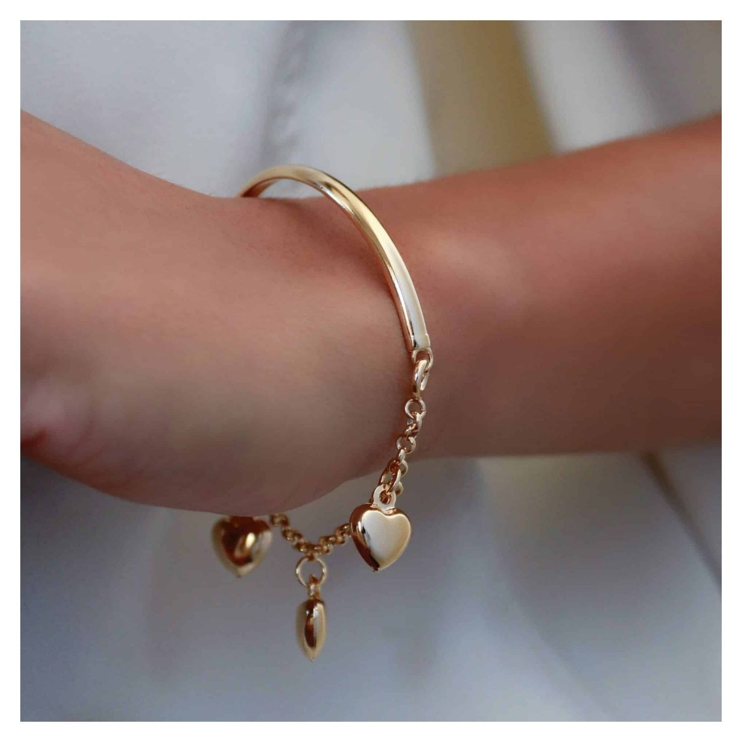 Pulseira Banhada a Ouro Amarelo, Metade Bracelete E Metade Elos Com Pingentes Corações Lisos