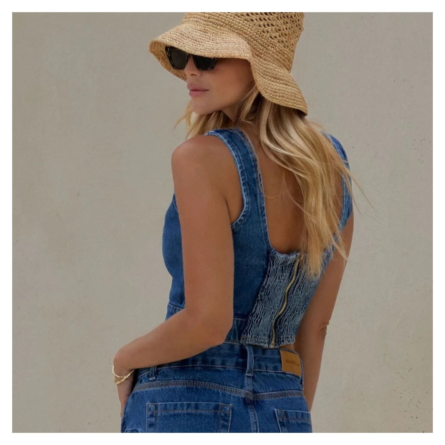 Top Jeans Decote Coração, Alça Larga, Fechamento Com Ziper Atras e Elastico.